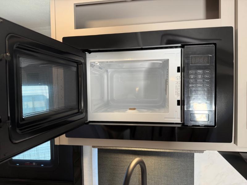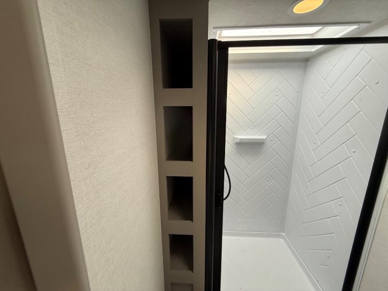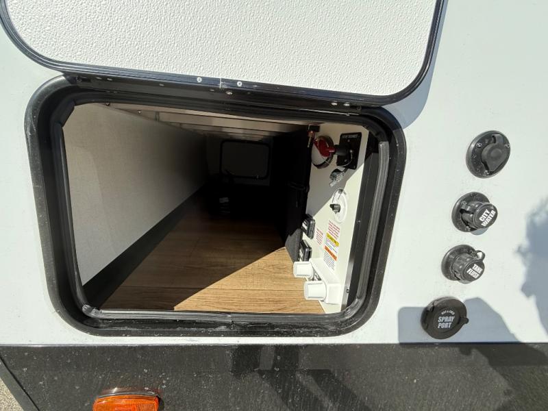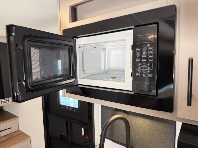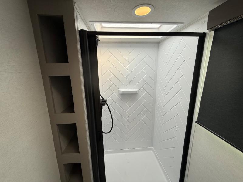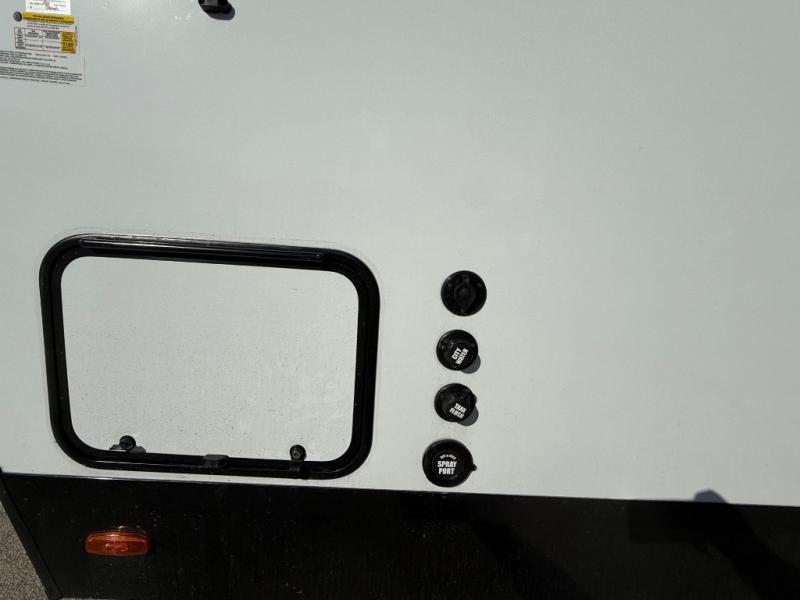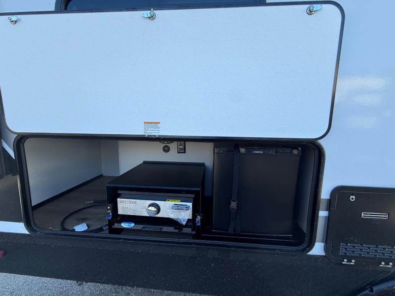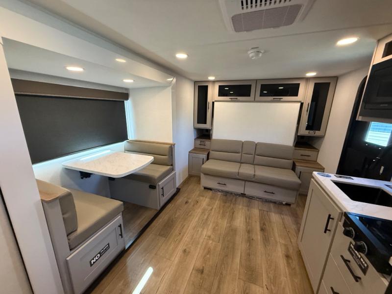 Step inside through the solid step entry and you'll be greeted by a cozy queen bed, perfect for a restful night’s sleep. In between wardrobe nightstands and topped with overhead storage, there’s plenty of room for your clothes and essentials. For added versatility, the bed converts into a 60" jack knife sofa, providing extra seating when needed. The slide out features a dinette that offers additional space, a comfy sleeping area, and a spot to enjoy meals. Across from the dinette, the kitchen is fully equipped with a 10-cu. ft. refrigerator, two-burner cooktop, sink, and microwave, everything you need to prepare your favorite dishes. At the rear corner, you’ll find even more sleeping space with dual 46" x 74" bunks, right next to a full bathroom complete with a 30" x 36" shower for added comfort and convenience.