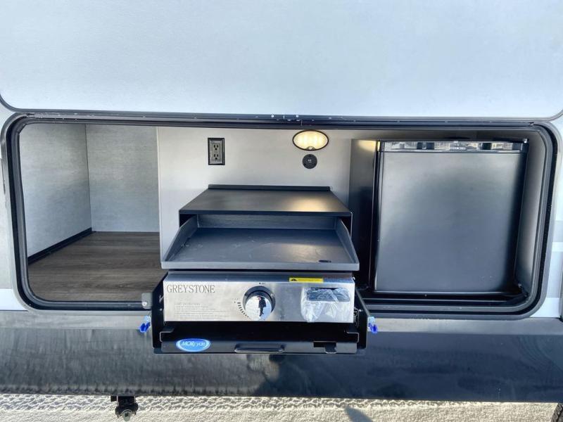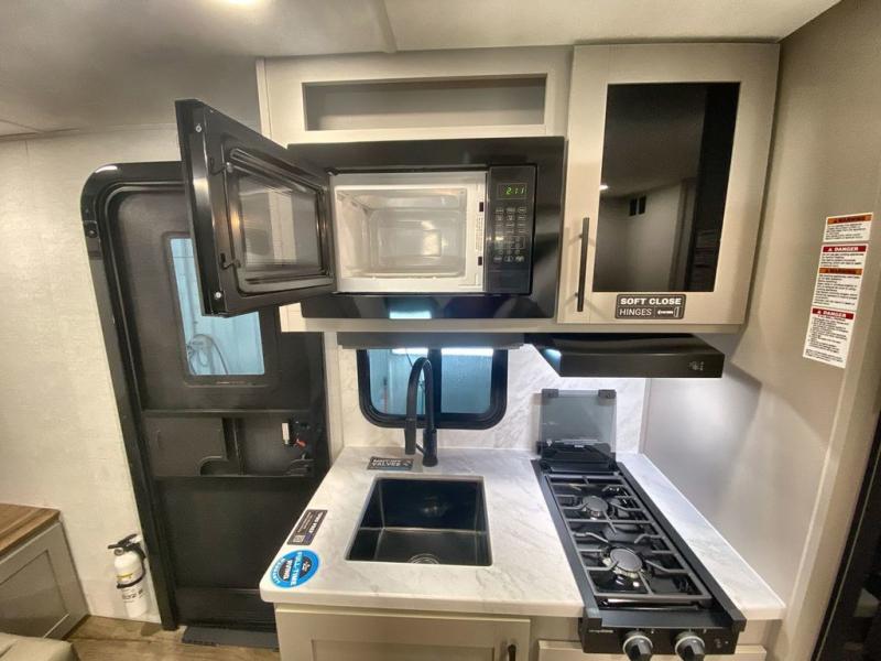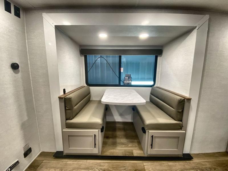 Step inside through the solid step entry and you'll be greeted by a cozy queen bed, perfect for a restful night’s sleep. In between wardrobe nightstands and topped with overhead storage, there’s plenty of room for your clothes and essentials. For added versatility, the bed converts into a 60" jack knife sofa, providing extra seating when needed. The slide out features a dinette that offers additional space, a comfy sleeping area, and a spot to enjoy meals. Across from the dinette, the kitchen is fully equipped with a 10-cu. ft. refrigerator, two-burner cooktop, sink, and microwave, everything you need to prepare your favorite dishes. At the rear corner, you’ll find even more sleeping space with dual 46" x 74" bunks, right next to a full bathroom complete with a 30" x 36" shower for added comfort and convenience.