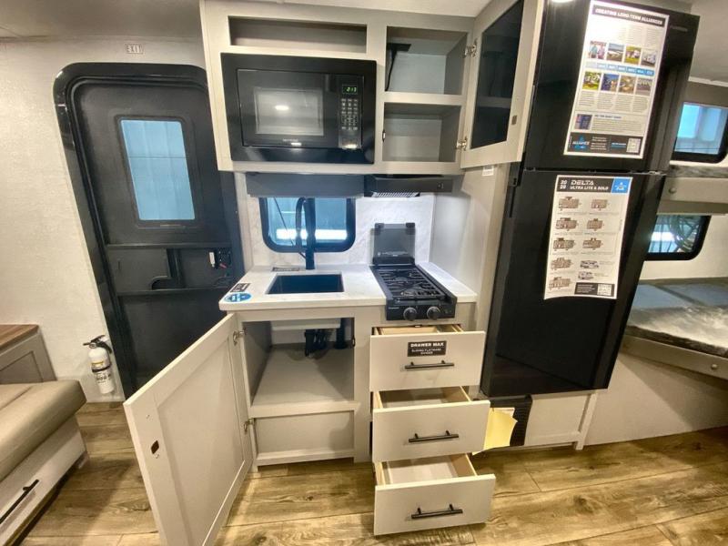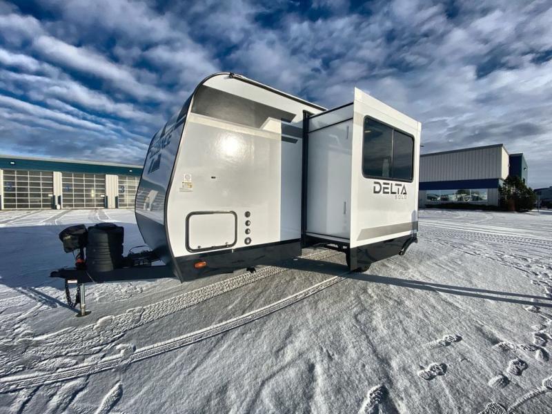 Each Delta Solo Model Each is designed to provide both comfort and convenience in a compact footprint. Inside, you'll find residential-style touches like can-style LED ceiling lights, cabinet doors with magnetic catches, and commercial-grade vinyl flooring built to last. On the exterior, practical travel features include exterior switches for the slide-out and awning, sturdy Step Above fold-out entry steps, and color-coded, numbered wiring for simplified maintenance and troubleshooting.