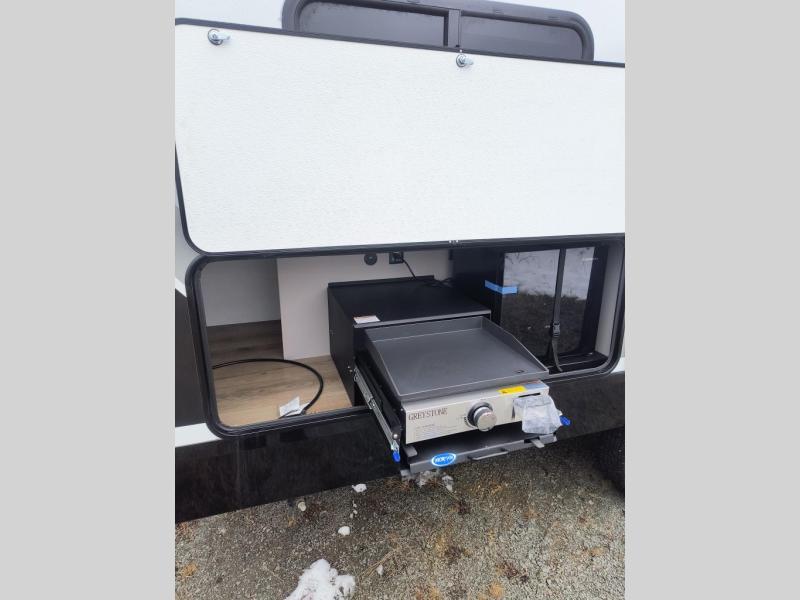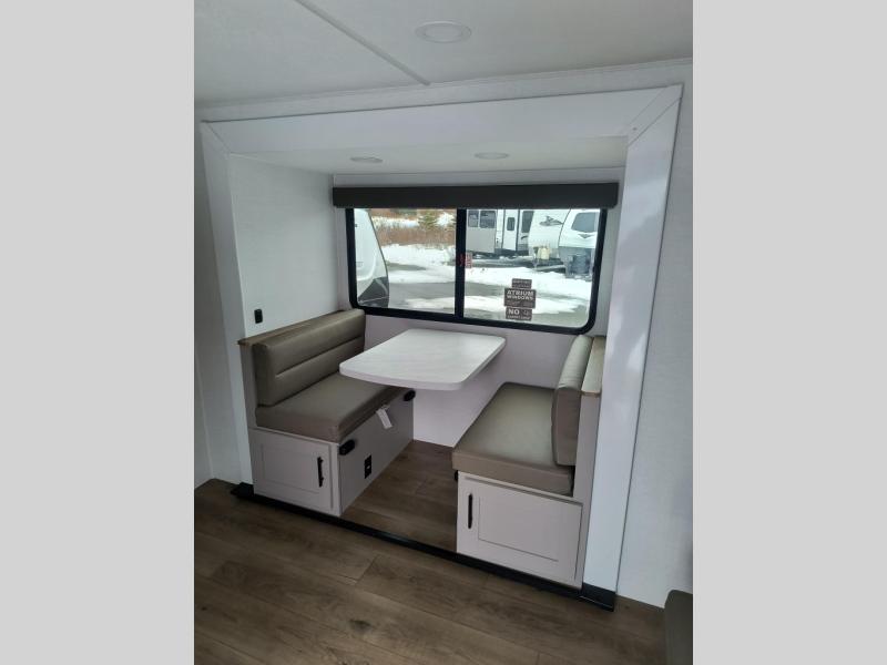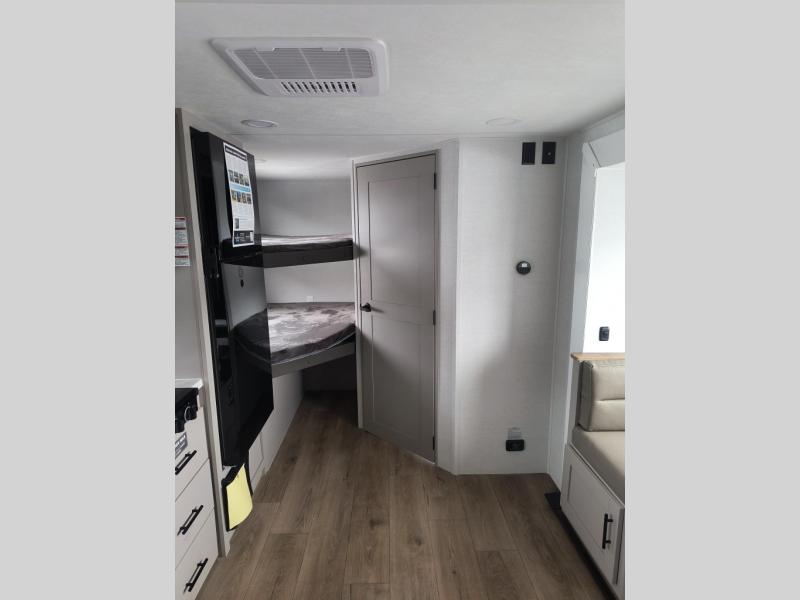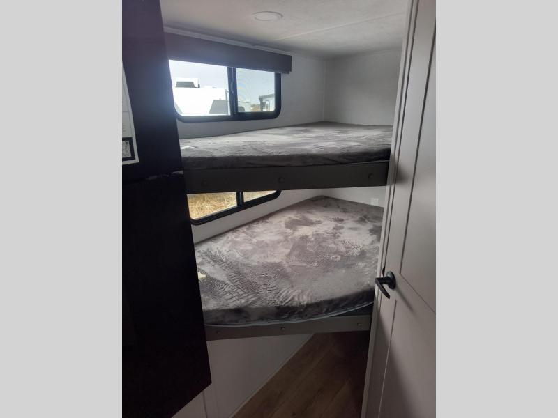 Step inside through the solid step entry and you'll be greeted by a cozy queen bed, perfect for a restful night’s sleep. In between wardrobe nightstands and topped with overhead storage, there’s plenty of room for your clothes and essentials. For added versatility, the bed converts into a 60" jack knife sofa, providing extra seating when needed. The slide out features a dinette that offers additional space, a comfy sleeping area, and a spot to enjoy meals. Across from the dinette, the kitchen is fully equipped with a 10-cu. ft. refrigerator, two-burner cooktop, sink, and microwave, everything you need to prepare your favorite dishes. At the rear corner, you’ll find even more sleeping space with dual 46" x 74" bunks, right next to a full bathroom complete with a 30" x 36" shower for added comfort and convenience.