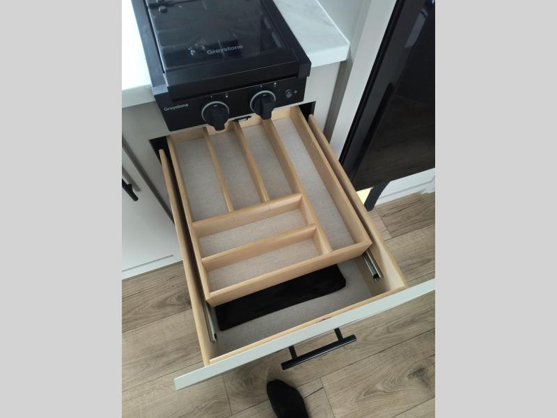 Each Delta Solo Model Each is designed to provide both comfort and convenience in a compact footprint. Inside, you'll find residential-style touches like can-style LED ceiling lights, cabinet doors with magnetic catches, and commercial-grade vinyl flooring built to last. On the exterior, practical travel features include exterior switches for the slide-out and awning, sturdy Step Above fold-out entry steps, and color-coded, numbered wiring for simplified maintenance and troubleshooting.