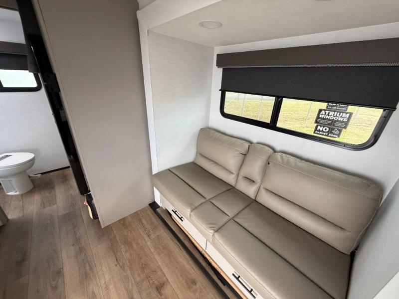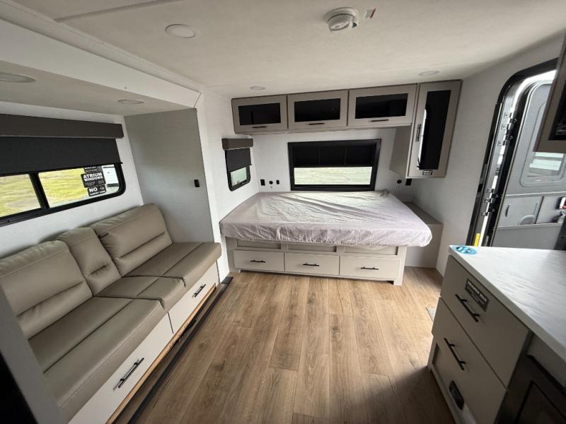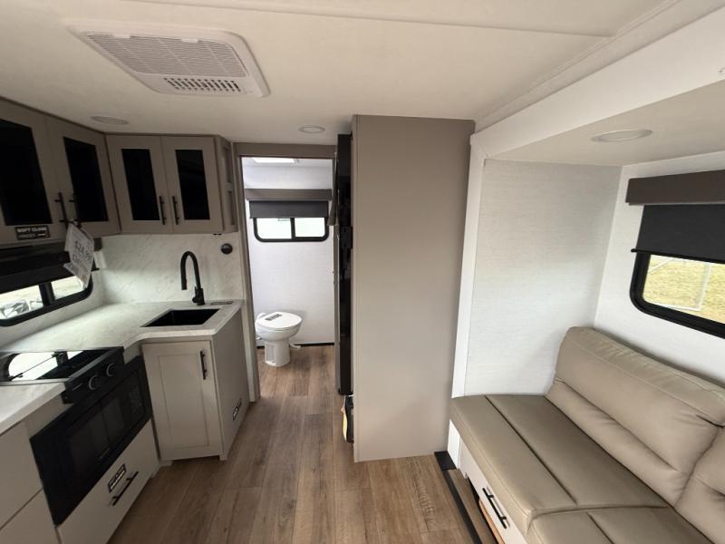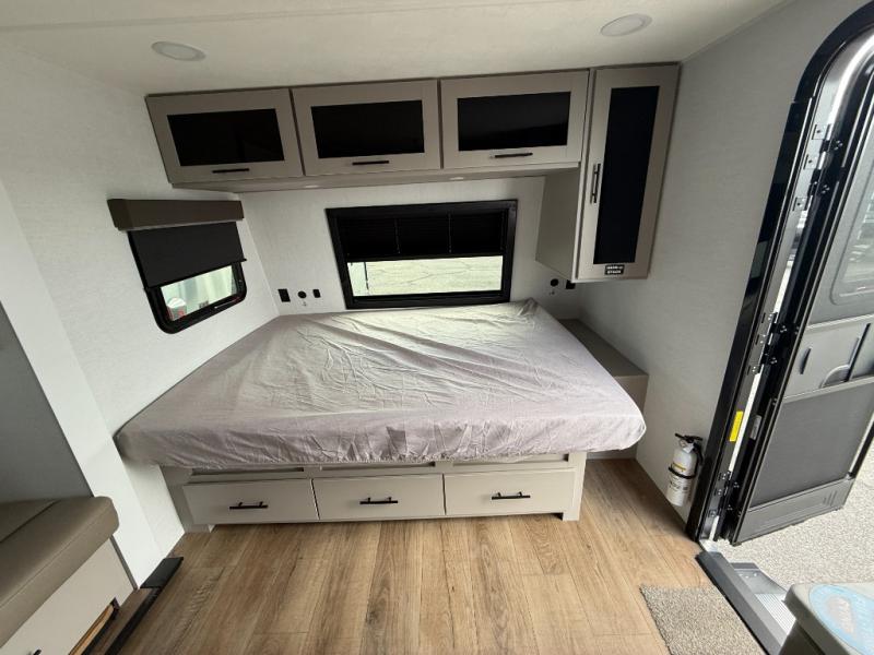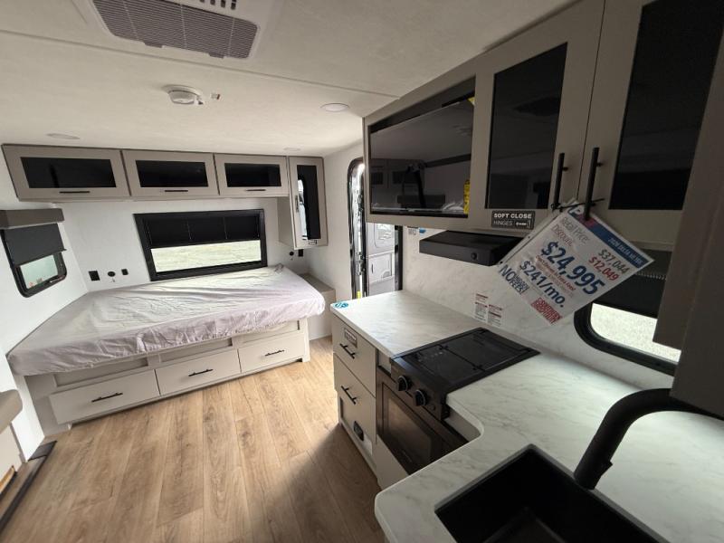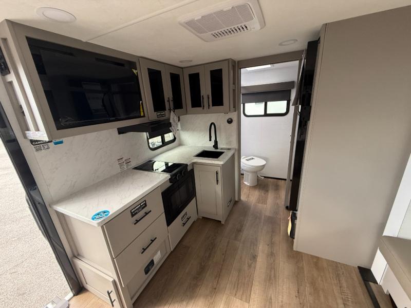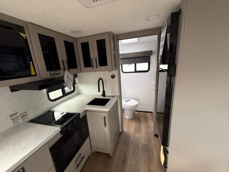 Enter this thoughtfully designed trailer through the 28" entry and step into a space that blends comfort and functionality. At the front, a 60" x 80" queen bed offers restful sleep, complete with a wardrobe at the foot and overhead storage. The center features an L-shaped kitchen equipped with a sink, 2-burner cooktop, overhead cabinets, and a 32-inch TV, while directly across, a 10-cu. ft. refrigerator and a slide out with a 60" jackknife sofa maximize space and convenience. At the rear, enjoy a full bathroom with a 30" x 36" shower, toilet, sink, linen shelves, and additional overhead storage making this compact trailer feel like home wherever you go.