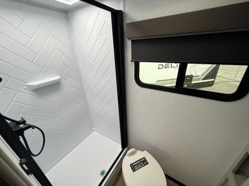 Each Delta Solo model is designed to deliver both comfort and convenience in a compact footprint. Inside, you'll find residential-style touches like can-style LED ceiling lights, durable cabinet doors with magnetic catches, and commercial-grade vinyl flooring built to last. On the exterior, practical travel features include easy-access switches for the slide-out and awning, sturdy Step Above fold-out entry steps, and color-coded, numbered wiring for simplified maintenance and troubleshooting.
