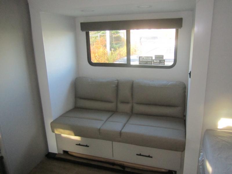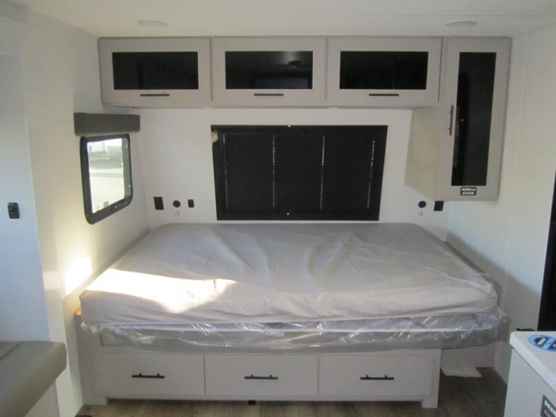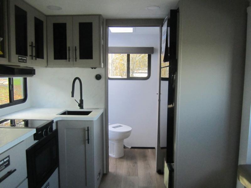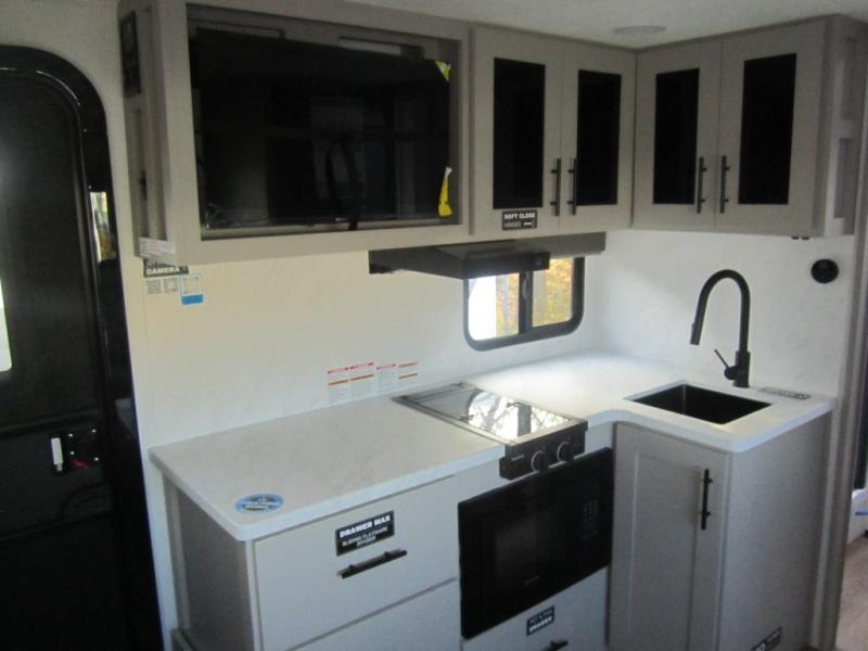 Enter this thoughtfully designed trailer through the 28" entry and step into a space that blends comfort and functionality. At the front, a 60" x 80" queen bed offers restful sleep, complete with a wardrobe at the foot and overhead storage. The center features an L-shaped kitchen equipped with a sink, 2-burner cooktop, overhead cabinets, and a 32-inch TV, while directly across, a 10-cu. ft. refrigerator and a slide out with a 60" jackknife sofa maximize space and convenience. At the rear, enjoy a full bathroom with a 30" x 36" shower, toilet, sink, linen shelves, and additional overhead storage making this compact trailer feel like home wherever you go.