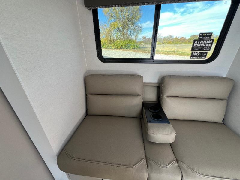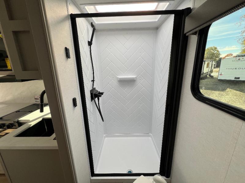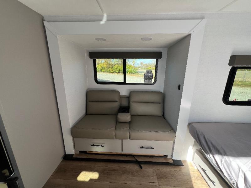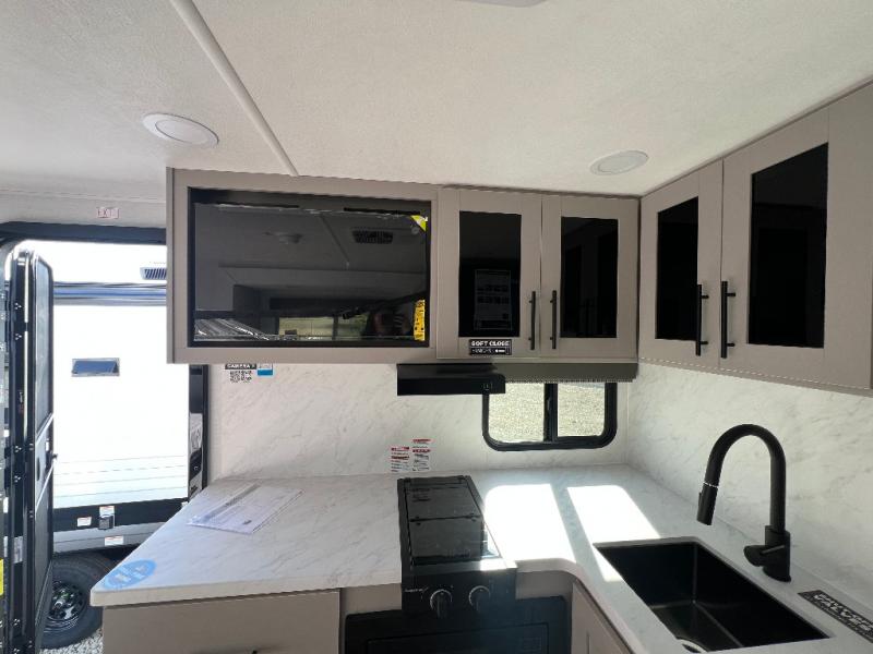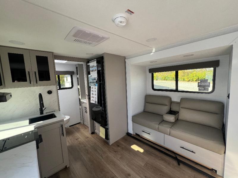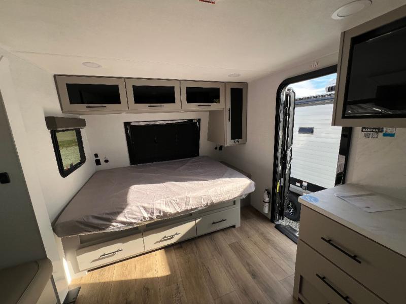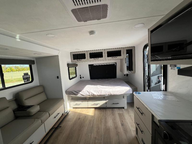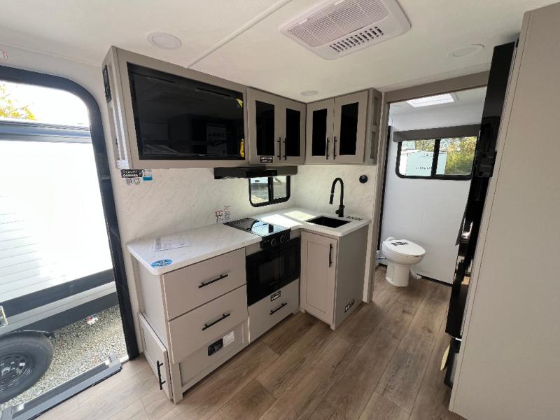 Enter this thoughtfully designed trailer through the 28" entry and step into a space that blends comfort and functionality. At the front, a 60" x 80" queen bed offers restful sleep, complete with a wardrobe at the foot and overhead storage. The center features an L-shaped kitchen equipped with a sink, 2-burner cooktop, overhead cabinets, and a 32-inch TV, while directly across, a 10-cu. ft. refrigerator and a slide out with a 60" jackknife sofa maximize space and convenience. At the rear, enjoy a full bathroom with a 30" x 36" shower, toilet, sink, linen shelves, and additional overhead storage making this compact trailer feel like home wherever you go.