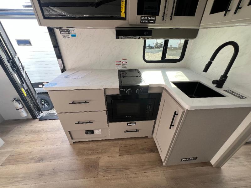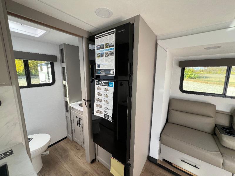 Each Delta Solo model is designed to deliver both comfort and convenience in a compact footprint. Inside, you'll find residential-style touches like can-style LED ceiling lights, durable cabinet doors with magnetic catches, and commercial-grade vinyl flooring built to last. On the exterior, practical travel features include easy-access switches for the slide-out and awning, sturdy Step Above fold-out entry steps, and color-coded, numbered wiring for simplified maintenance and troubleshooting.