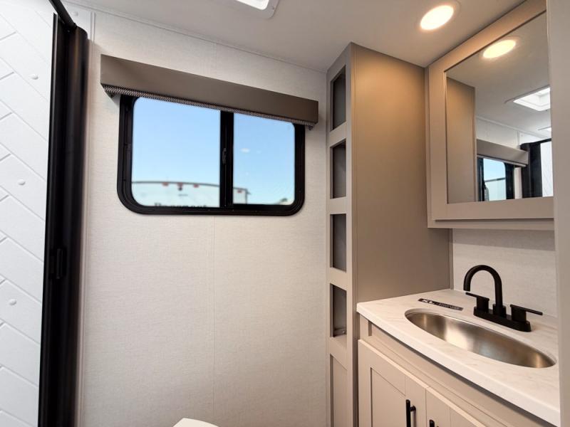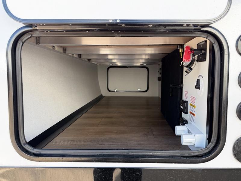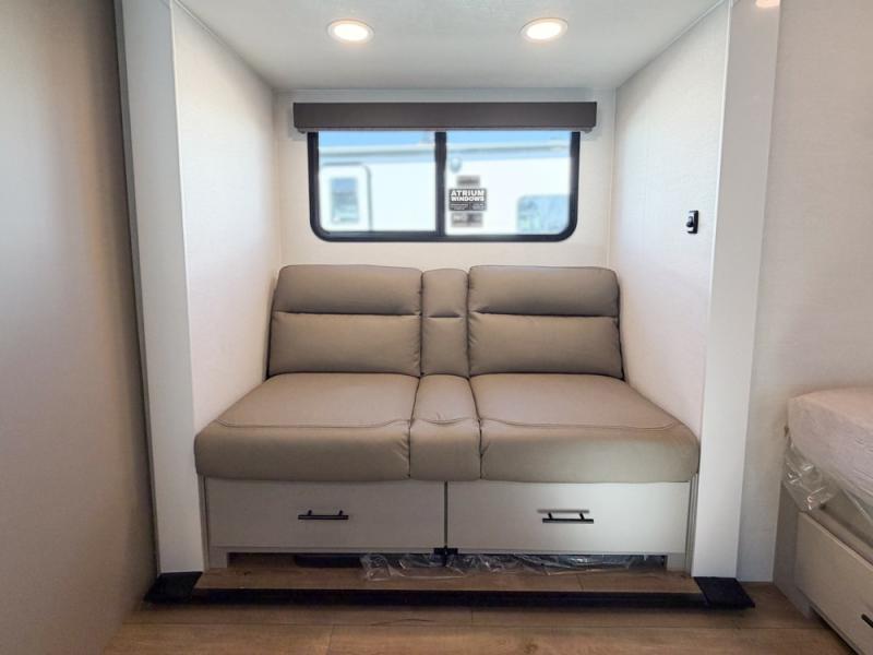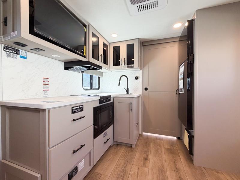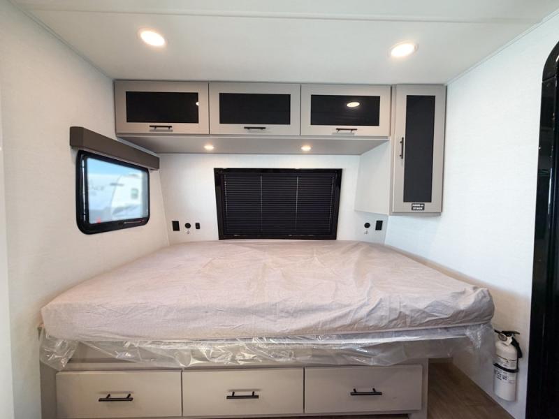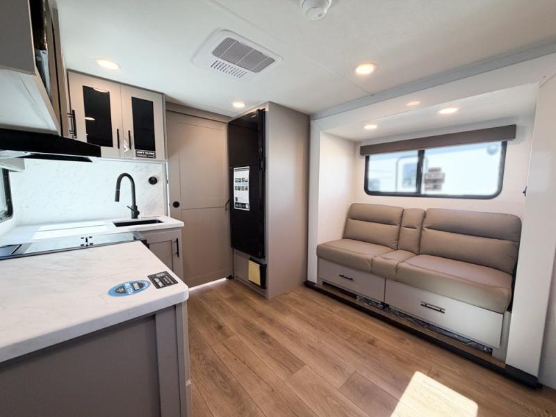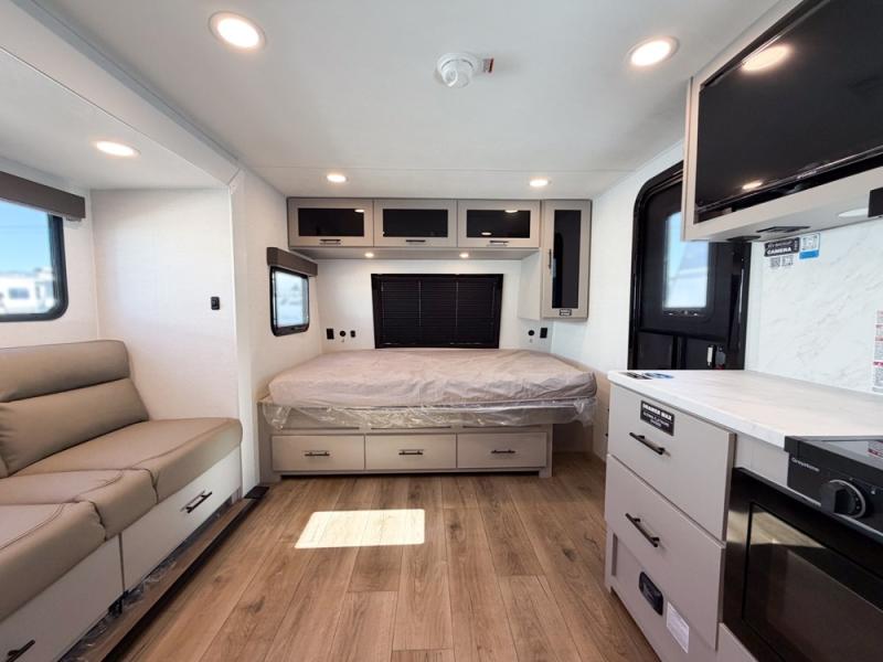 Enter this thoughtfully designed trailer through the 28" entry and step into a space that blends comfort and functionality. At the front, a 60" x 80" queen bed offers restful sleep, complete with a wardrobe at the foot and overhead storage. The center features an L-shaped kitchen equipped with a sink, 2-burner cooktop, overhead cabinets, and a 32-inch TV, while directly across, a 10-cu. ft. refrigerator and a slide out with a 60" jackknife sofa maximize space and convenience. At the rear, enjoy a full bathroom with a 30" x 36" shower, toilet, sink, linen shelves, and additional overhead storage making this compact trailer feel like home wherever you go.