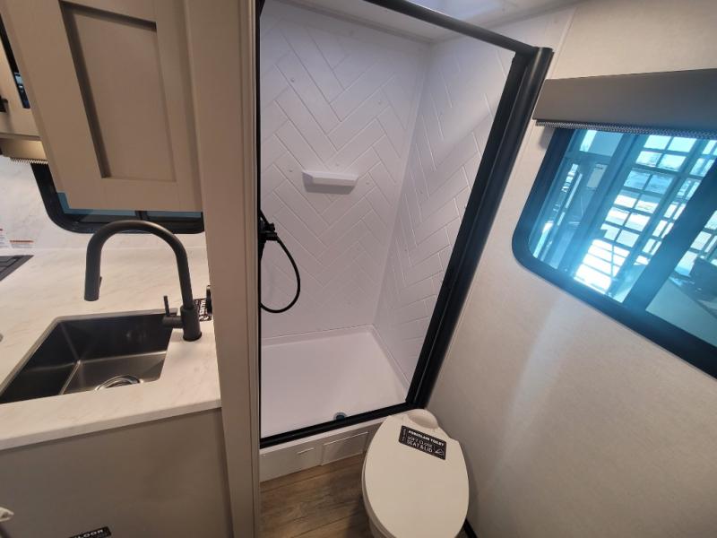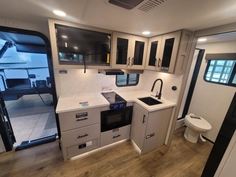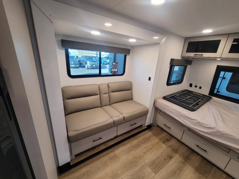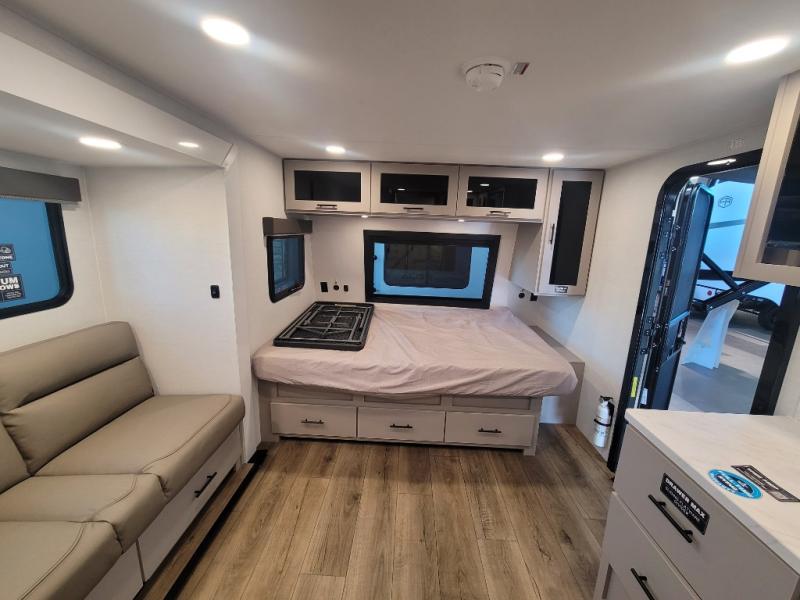 Enter this thoughtfully designed trailer through the 28" entry and step into a space that blends comfort and functionality. At the front, a 60" x 80" queen bed offers restful sleep, complete with a wardrobe at the foot and overhead storage. The center features an L-shaped kitchen equipped with a sink, 2-burner cooktop, overhead cabinets, and a 32-inch TV, while directly across, a 10-cu. ft. refrigerator and a slide out with a 60" jackknife sofa maximize space and convenience. At the rear, enjoy a full bathroom with a 30" x 36" shower, toilet, sink, linen shelves, and additional overhead storage making this compact trailer feel like home wherever you go.