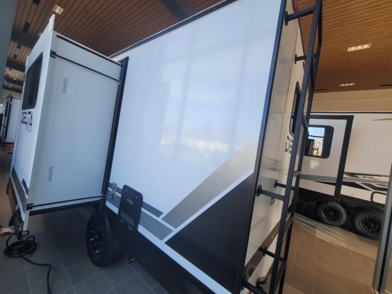 Each Delta Solo model is designed to deliver both comfort and convenience in a compact footprint. Inside, you'll find residential-style touches like can-style LED ceiling lights, durable cabinet doors with magnetic catches, and commercial-grade vinyl flooring built to last. On the exterior, practical travel features include easy-access switches for the slide-out and awning, sturdy Step Above fold-out entry steps, and color-coded, numbered wiring for simplified maintenance and troubleshooting.