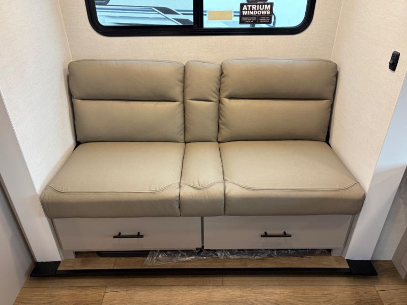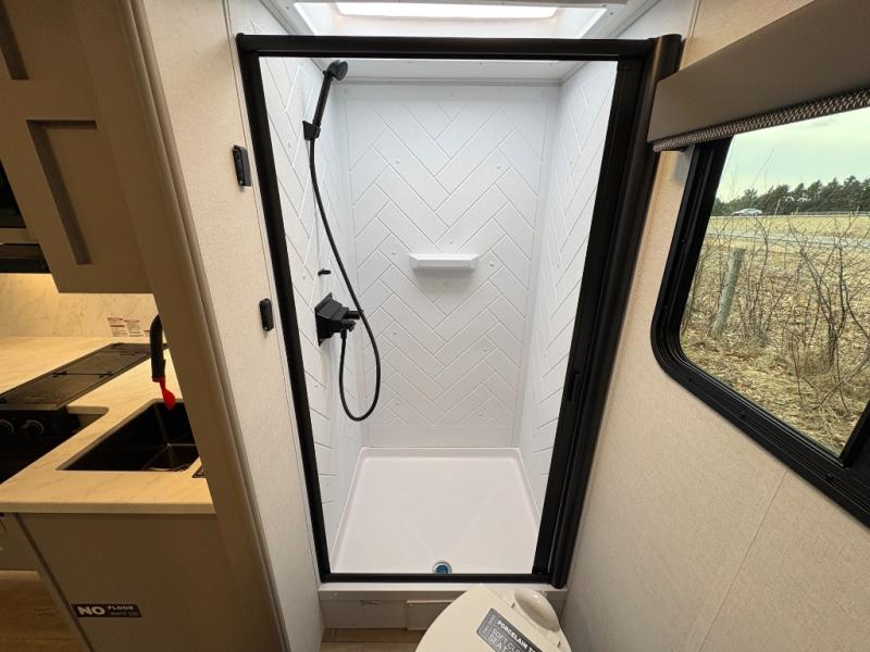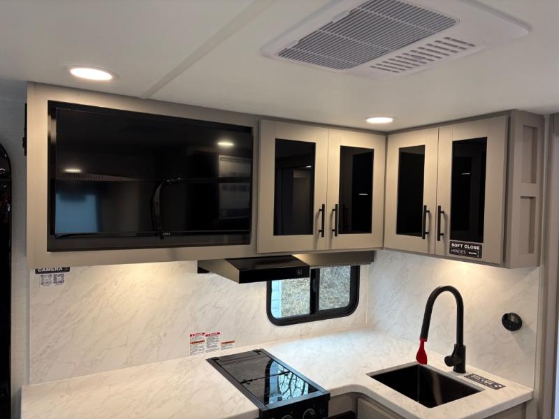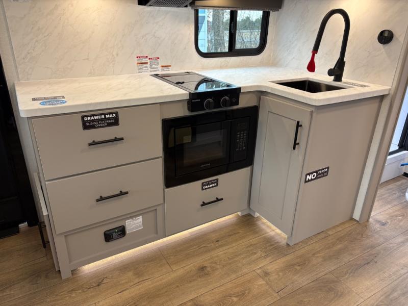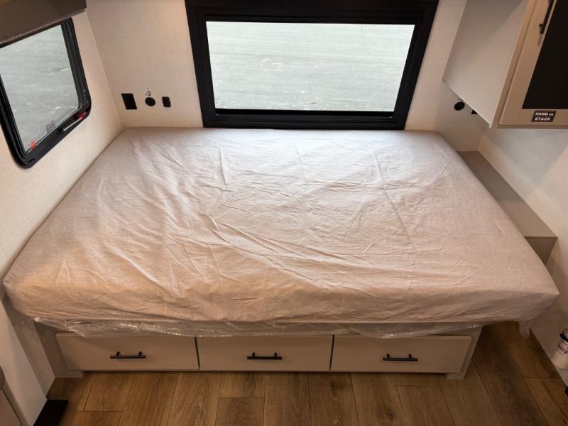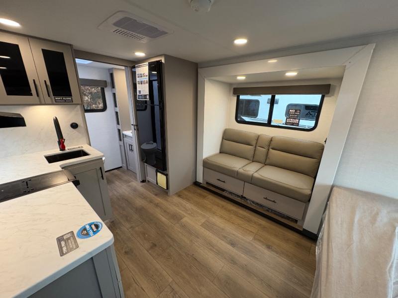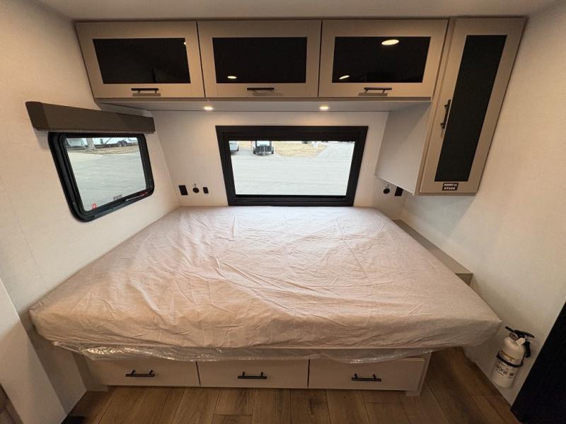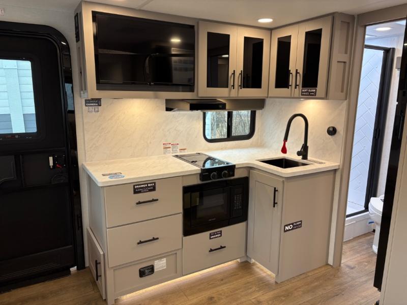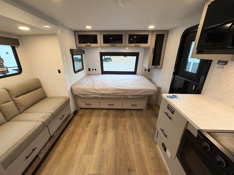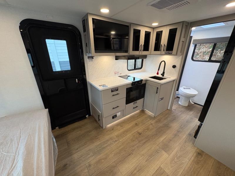 Enter this thoughtfully designed trailer through the 28" entry and step into a space that blends comfort and functionality. At the front, a 60" x 80" queen bed offers restful sleep, complete with a wardrobe at the foot and overhead storage. The center features an L-shaped kitchen equipped with a sink, 2-burner cooktop, overhead cabinets, and a 32-inch TV, while directly across, a 10-cu. ft. refrigerator and a slide out with a 60" jackknife sofa maximize space and convenience. At the rear, enjoy a full bathroom with a 30" x 36" shower, toilet, sink, linen shelves, and additional overhead storage making this compact trailer feel like home wherever you go.