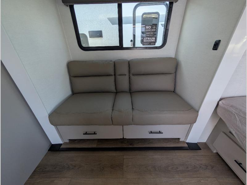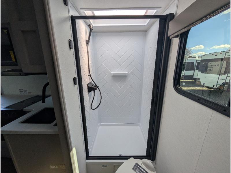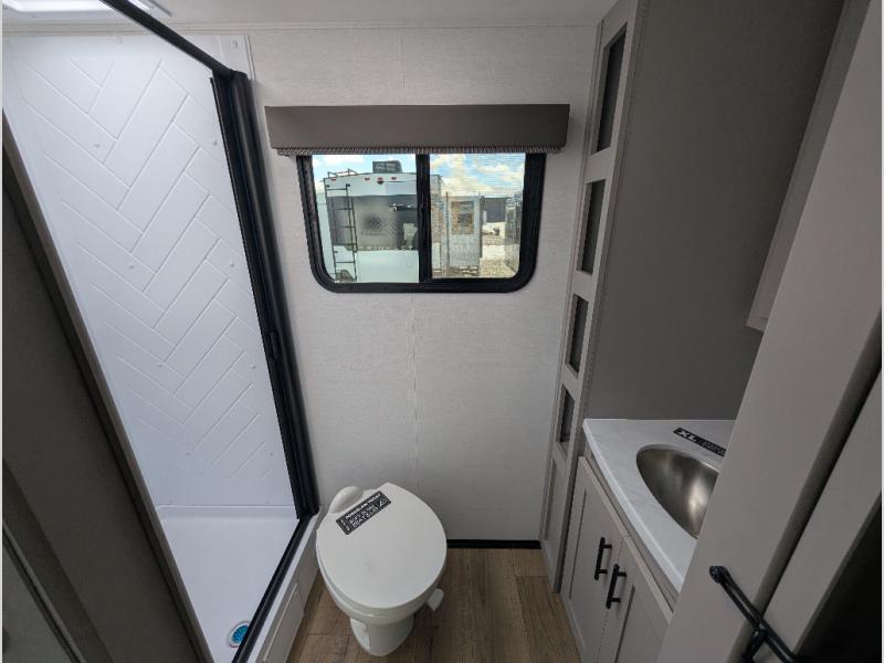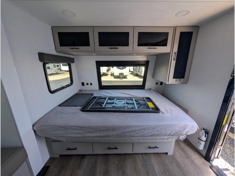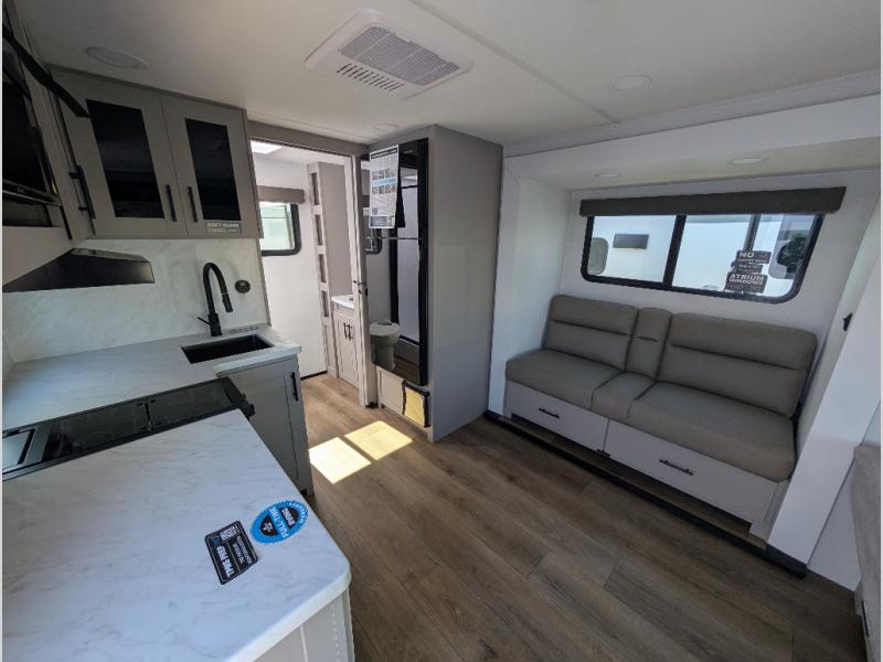 Enter this thoughtfully designed trailer through the 28" entry and step into a space that blends comfort and functionality. At the front, a 60" x 80" queen bed offers restful sleep, complete with a wardrobe at the foot and overhead storage. The center features an L-shaped kitchen equipped with a sink, 2-burner cooktop, overhead cabinets, and a 32-inch TV, while directly across, a 10-cu. ft. refrigerator and a slide out with a 60" jackknife sofa maximize space and convenience. At the rear, enjoy a full bathroom with a 30" x 36" shower, toilet, sink, linen shelves, and additional overhead storage making this compact trailer feel like home wherever you go.