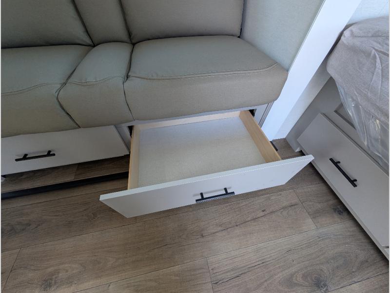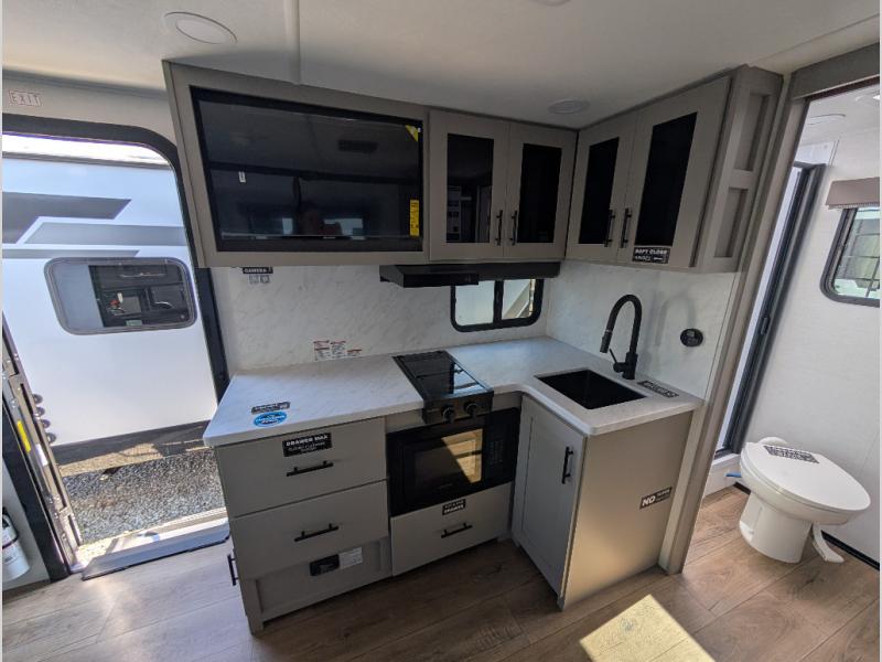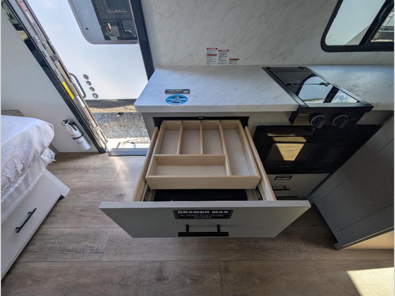 Each Delta Solo model is designed to deliver both comfort and convenience in a compact footprint. Inside, you'll find residential-style touches like can-style LED ceiling lights, durable cabinet doors with magnetic catches, and commercial-grade vinyl flooring built to last. On the exterior, practical travel features include easy-access switches for the slide-out and awning, sturdy Step Above fold-out entry steps, and color-coded, numbered wiring for simplified maintenance and troubleshooting.
