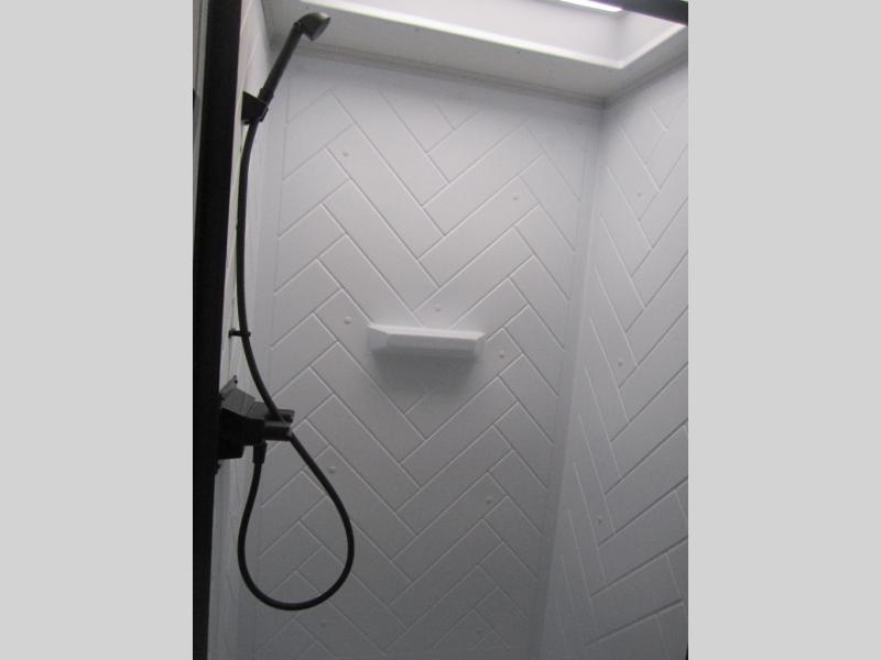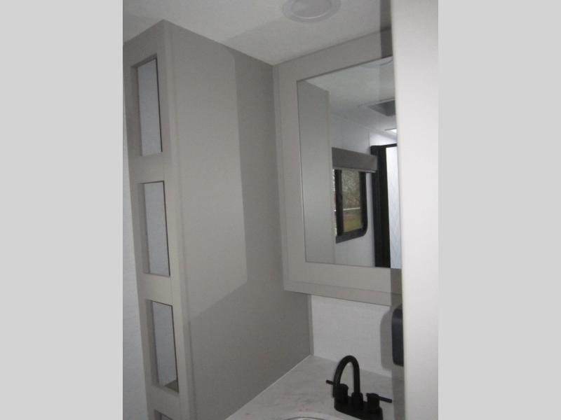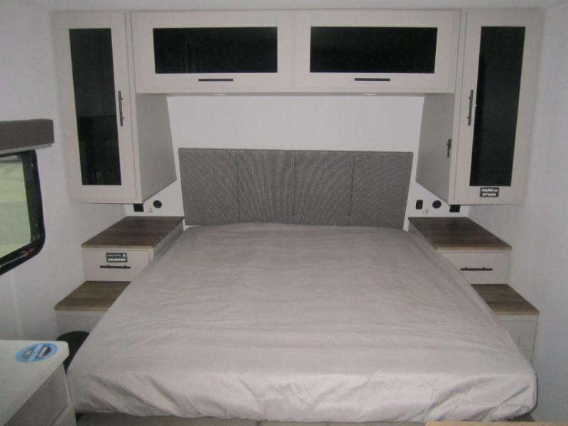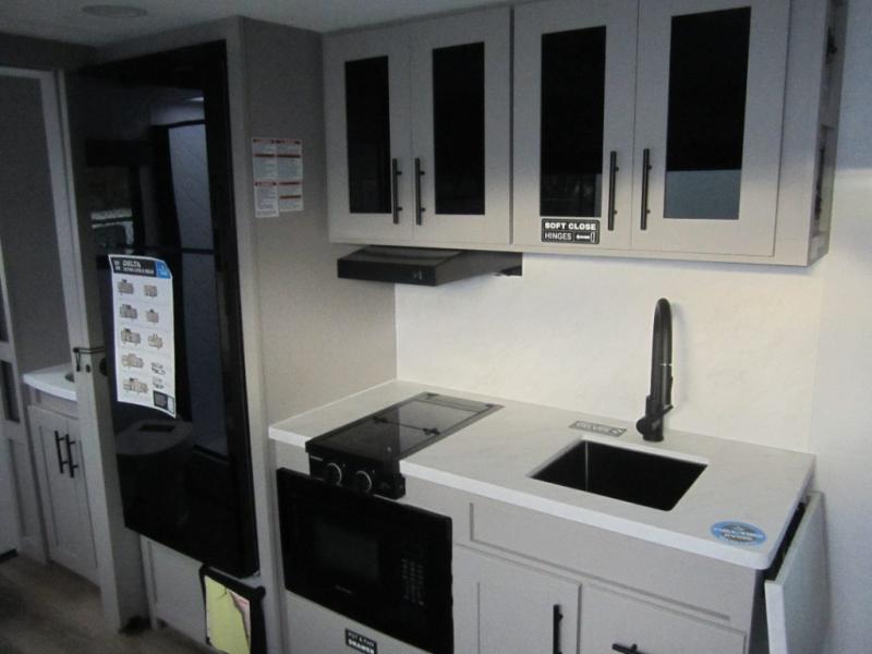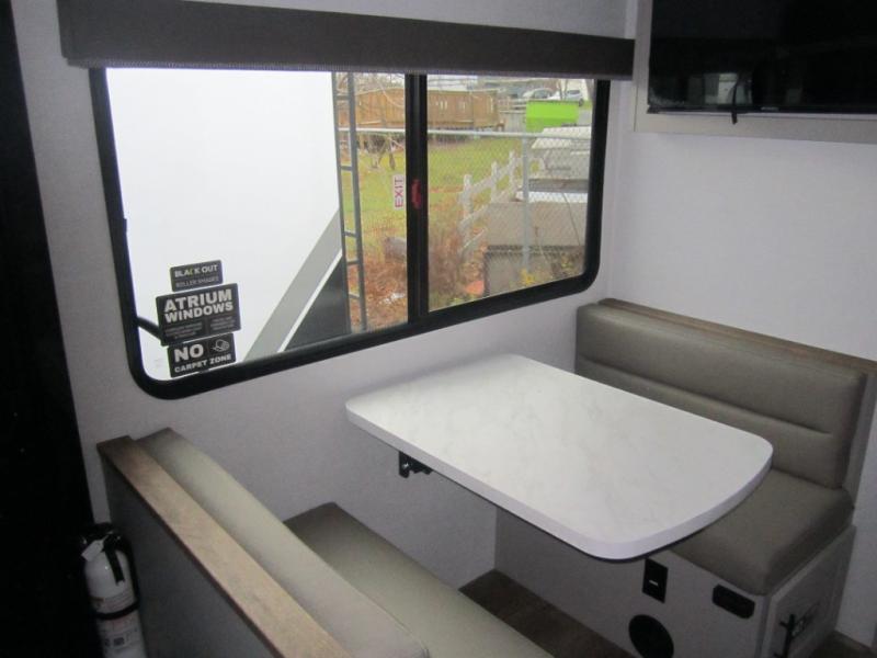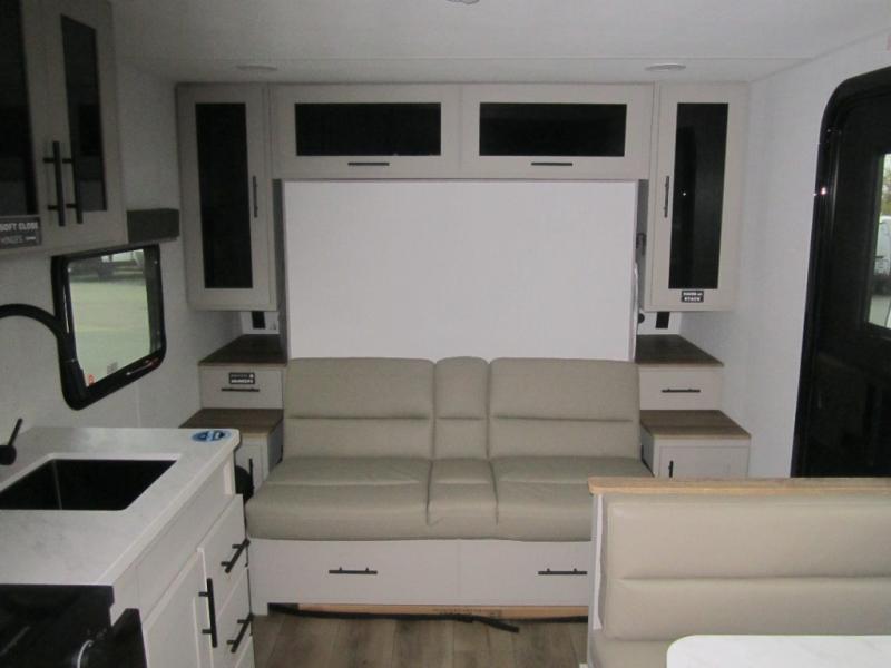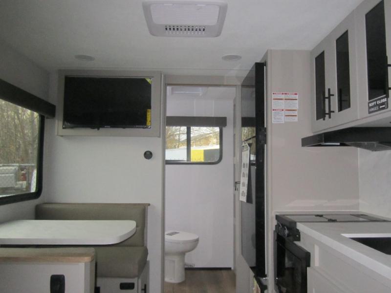 This compact, yet feature-packed travel trailer offers smart design and comfort throughout. Step inside through the 28" entry to find a front queen bed that easily converts into a 60" jackknife sofa, flanked by wardrobe nightstands for your clothes and essentials. The central kitchen is equipped with a 10-cu. ft. refrigerator, two-burner cooktop, sink, and overhead storage, while a booth dinette across from it offers dining space and a clear view of the 32-inch TV. At the rear, enjoy the convenience of a full bathroom with a spacious 30" x 36" shower, a sink with linen shelves, and additional overhead compartments for organized storage.