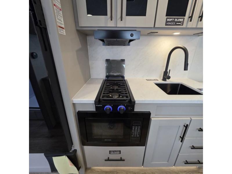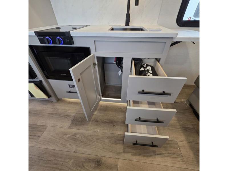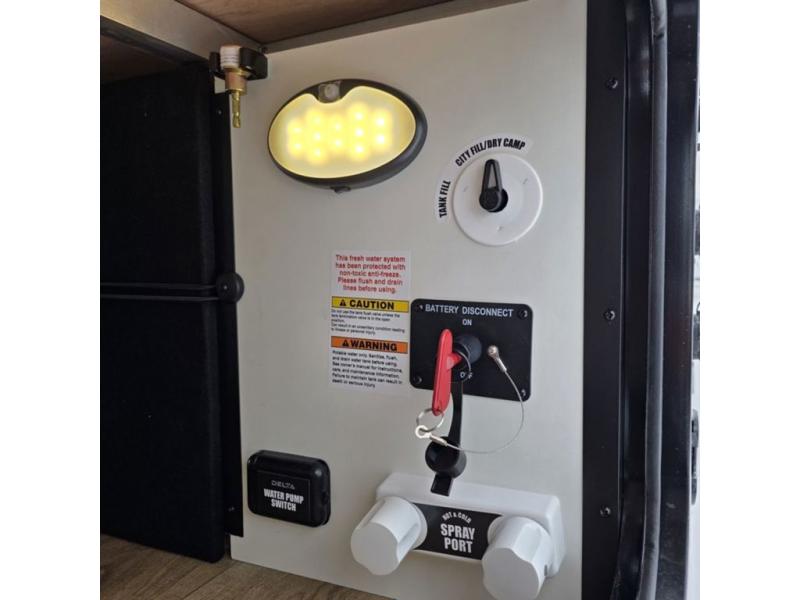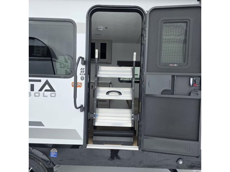 Each Delta Solo Model Each is designed to provide both comfort and convenience in a compact footprint. Inside, you'll find residential-style touches like can-style LED ceiling lights, cabinet doors with magnetic catches, and commercial-grade vinyl flooring built to last. On the exterior, practical travel features include exterior switches for the slide-out and awning, sturdy Step Above fold-out entry steps, and color-coded, numbered wiring for simplified maintenance and troubleshooting.