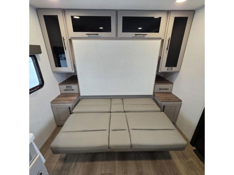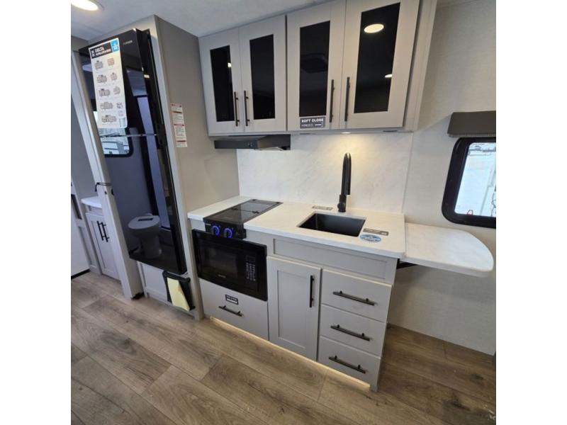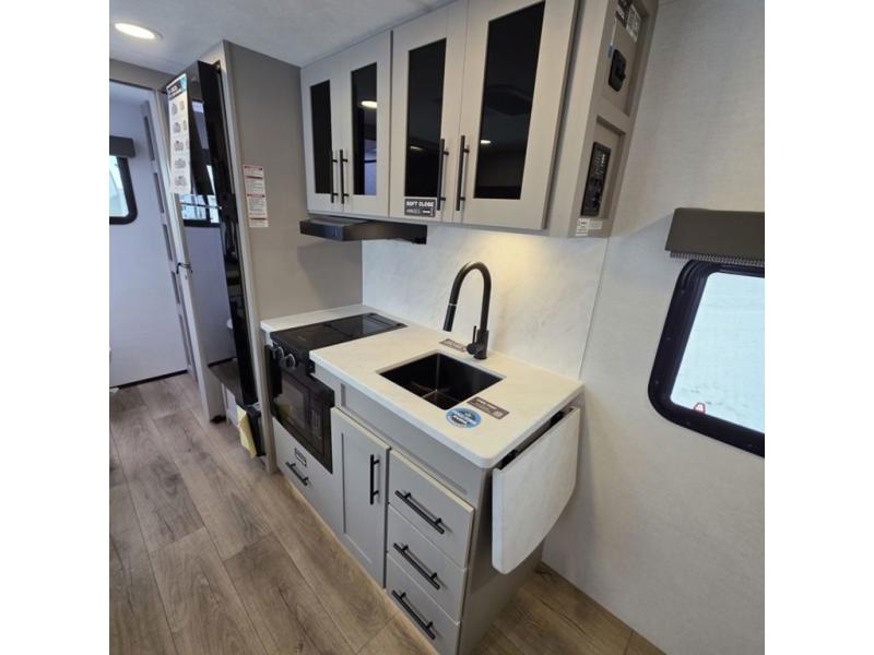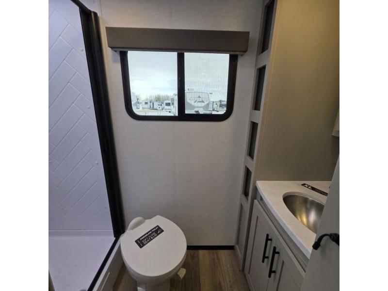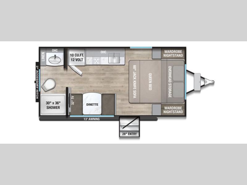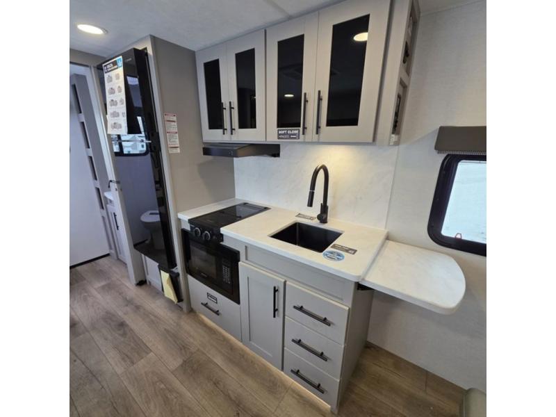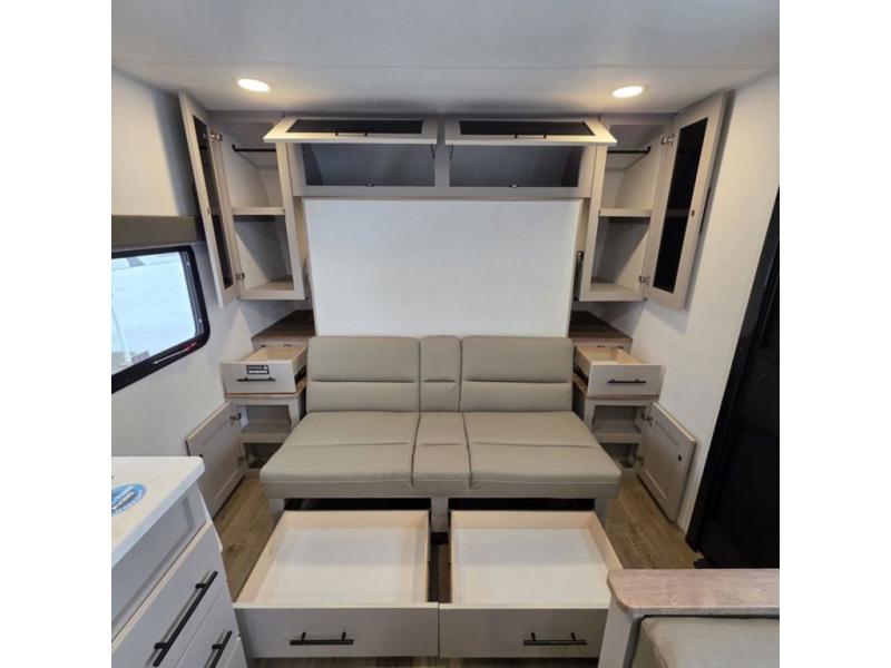 This compact, yet feature-packed travel trailer offers smart design and comfort throughout. Step inside through the 28" entry to find a front queen bed that easily converts into a 60" jackknife sofa, flanked by wardrobe nightstands for your clothes and essentials. The central kitchen is equipped with a 10-cu. ft. refrigerator, two-burner cooktop, sink, and overhead storage, while a booth dinette across from it offers dining space and a clear view of the 32-inch TV. At the rear, enjoy the convenience of a full bathroom with a spacious 30" x 36" shower, a sink with linen shelves, and additional overhead compartments for organized storage.