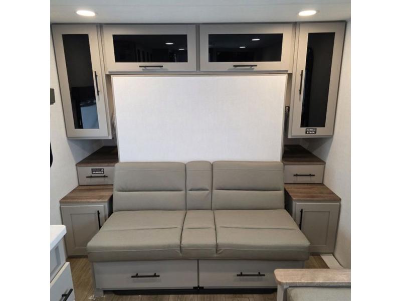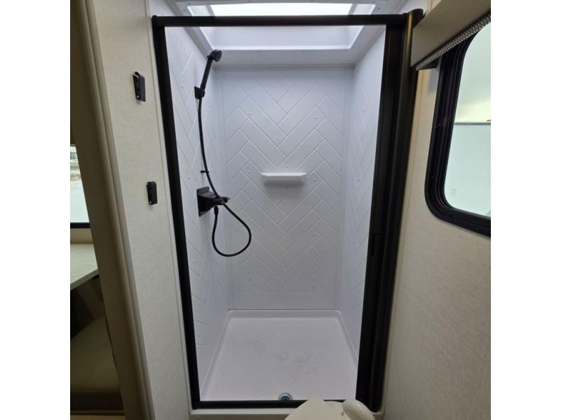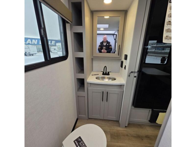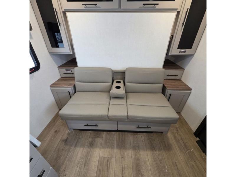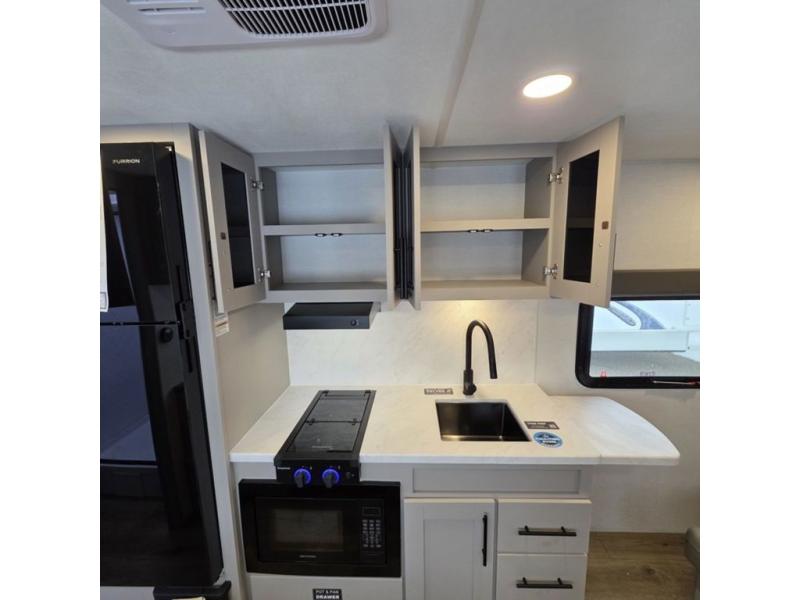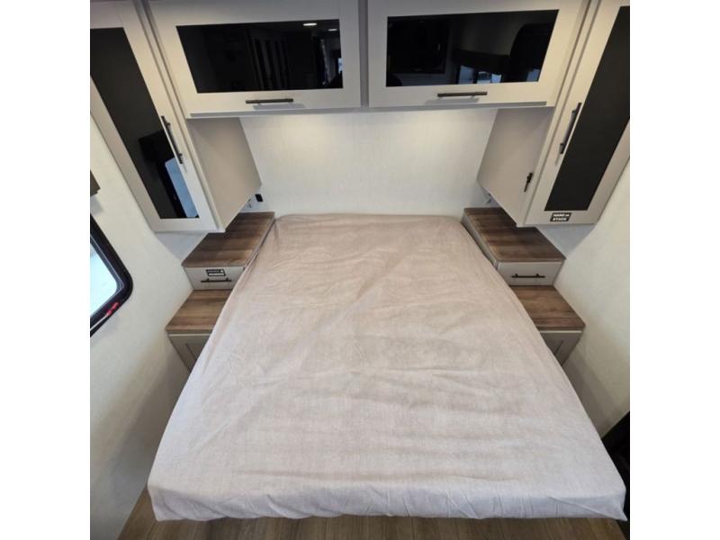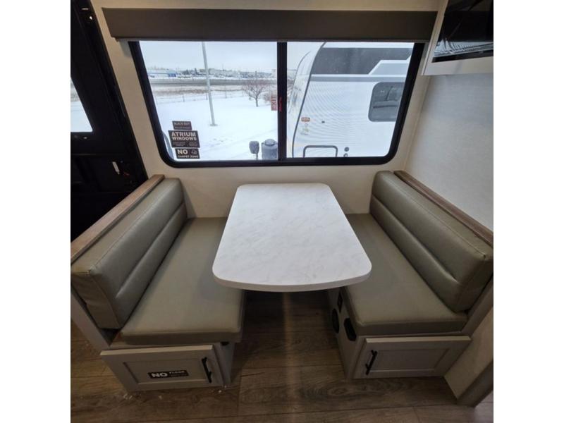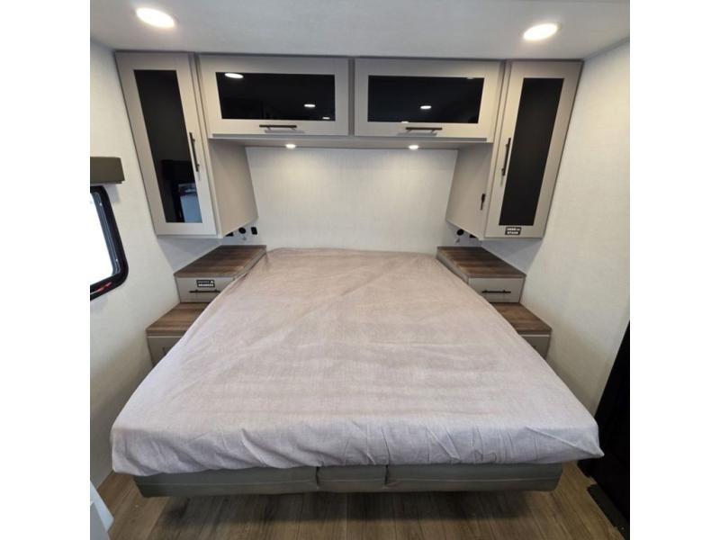 This compact, yet feature-packed travel trailer offers smart design and comfort throughout. Step inside through the 28" entry to find a front queen bed that easily converts into a 60" jackknife sofa, flanked by wardrobe nightstands for your clothes and essentials. The central kitchen is equipped with a 10-cu. ft. refrigerator, two-burner cooktop, sink, and overhead storage, while a booth dinette across from it offers dining space and a clear view of the 32-inch TV. At the rear, enjoy the convenience of a full bathroom with a spacious 30" x 36" shower, a sink with linen shelves, and additional overhead compartments for organized storage.