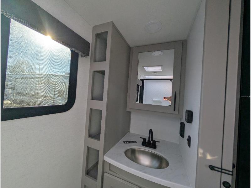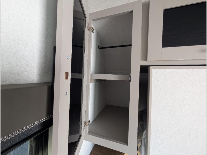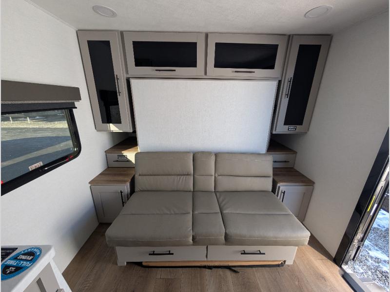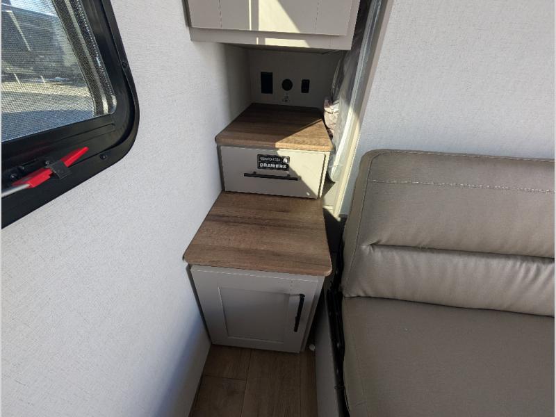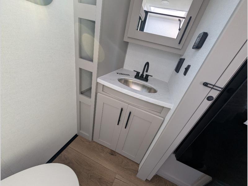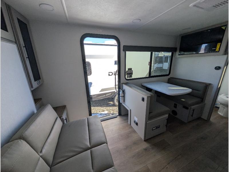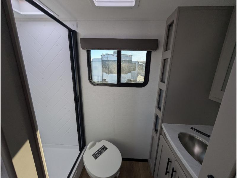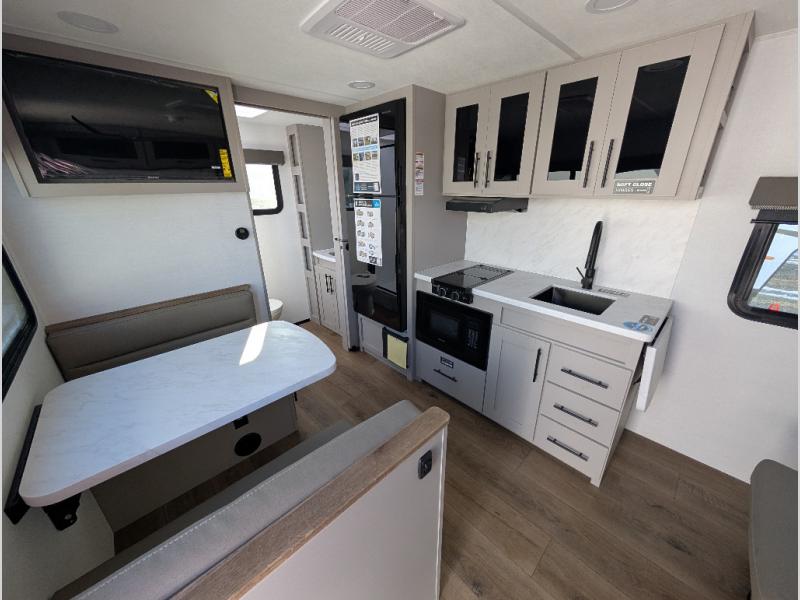 This compact, yet feature-packed travel trailer offers smart design and comfort throughout. Step inside through the 28" entry to find a front queen bed that easily converts into a 60" jackknife sofa, flanked by wardrobe nightstands for your clothes and essentials. The central kitchen is equipped with a 10-cu. ft. refrigerator, two-burner cooktop, sink, and overhead storage, while a booth dinette across from it offers dining space and a clear view of the 32-inch TV. At the rear, enjoy the convenience of a full bathroom with a spacious 30" x 36" shower, a sink with linen shelves, and additional overhead compartments for organized storage.