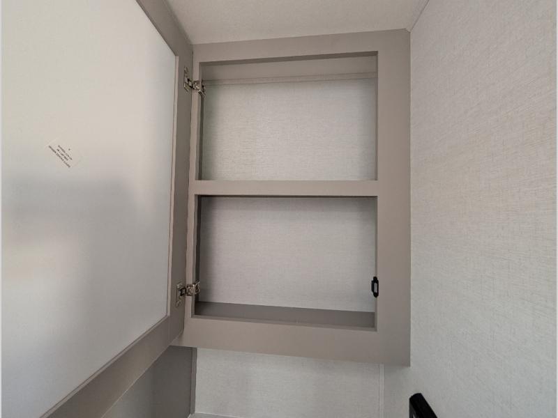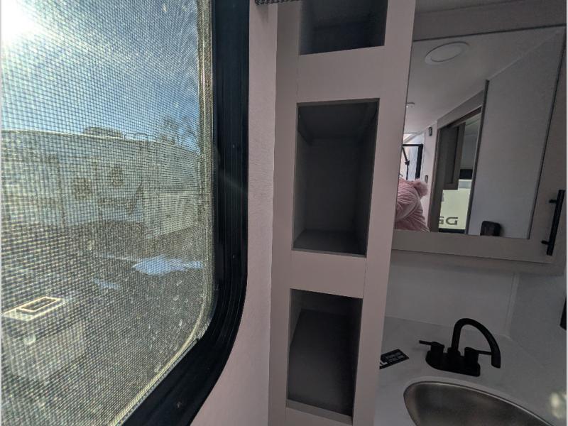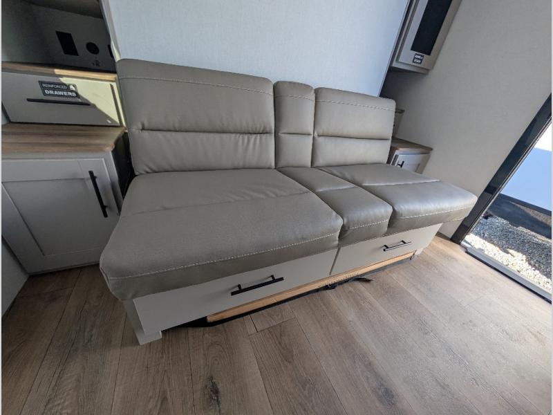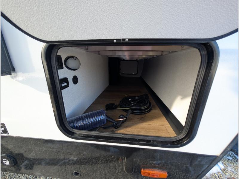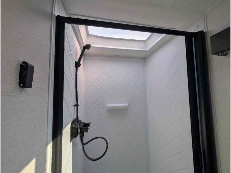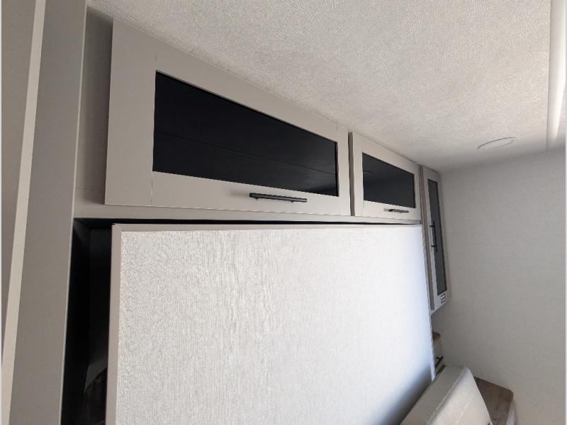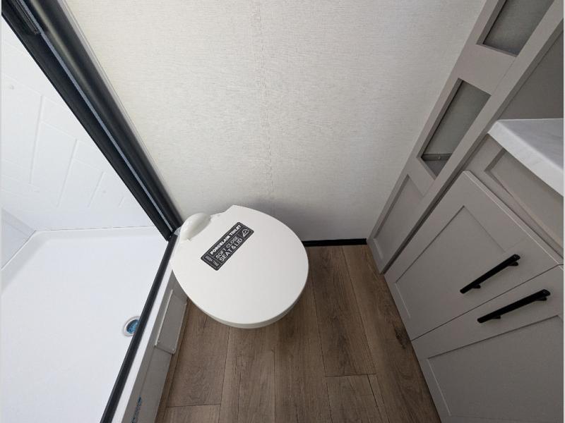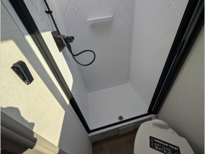This compact, yet feature-packed travel trailer offers smart design and comfort throughout. Step inside through the 28" entry to find a front queen bed that easily converts into a 60" jackknife sofa, flanked by wardrobe nightstands for your clothes and essentials. The central kitchen is equipped with a 10-cu. ft. refrigerator, two-burner cooktop, sink, and overhead storage, while a booth dinette across from it offers dining space and a clear view of the 32-inch TV. At the rear, enjoy the convenience of a full bathroom with a spacious 30" x 36" shower, a sink with linen shelves, and additional overhead compartments for organized storage.