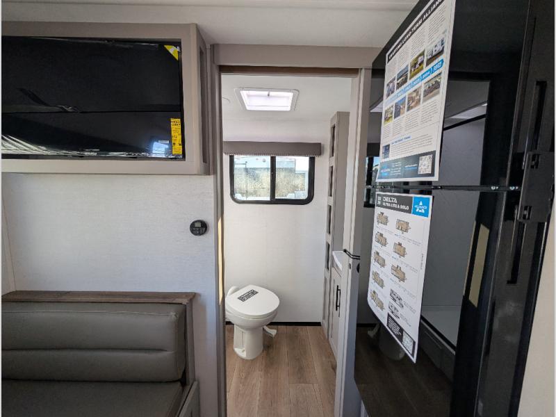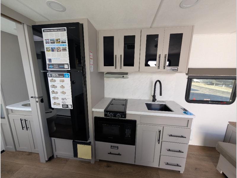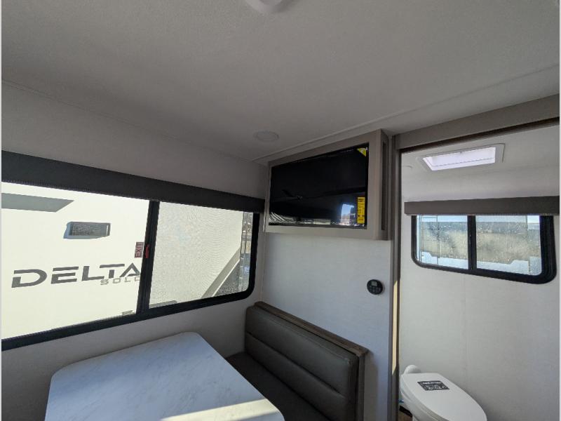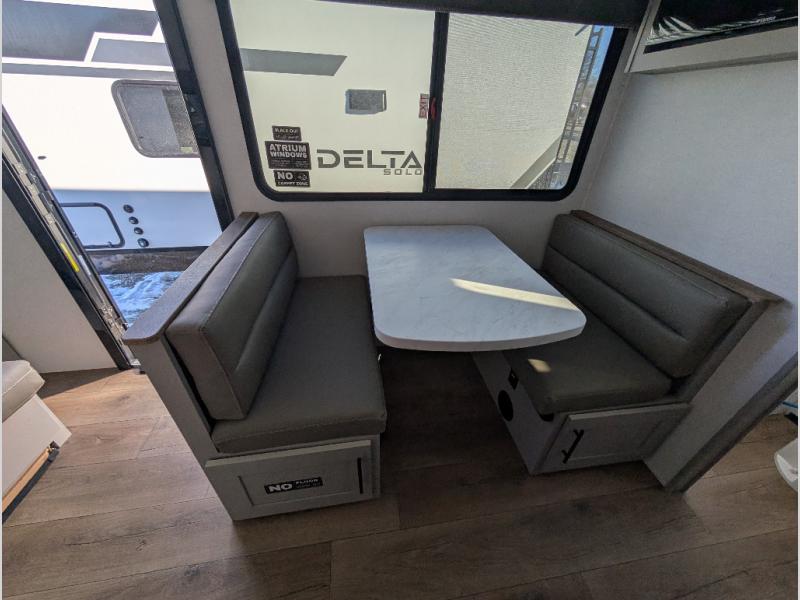 Each Delta Solo Model Each is designed to provide both comfort and convenience in a compact footprint. Inside, you'll find residential-style touches like can-style LED ceiling lights, cabinet doors with magnetic catches, and commercial-grade vinyl flooring built to last. On the exterior, practical travel features include exterior switches for the slide-out and awning, sturdy Step Above fold-out entry steps, and color-coded, numbered wiring for simplified maintenance and troubleshooting.