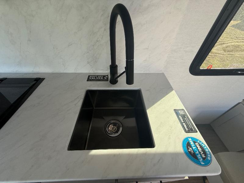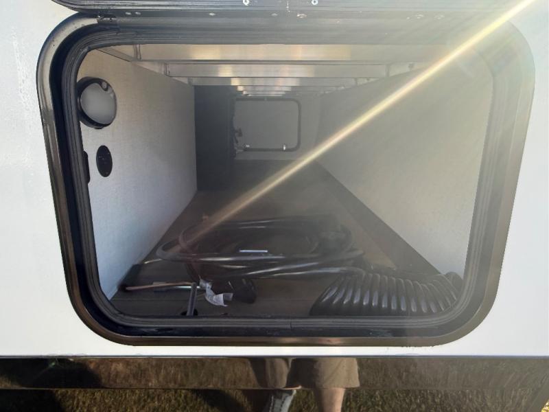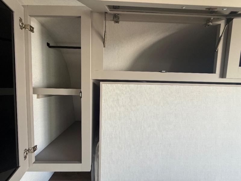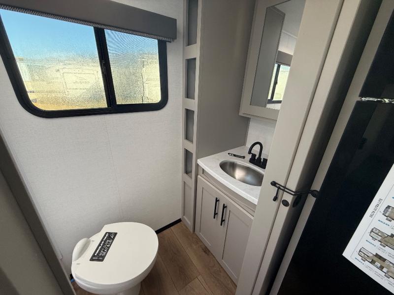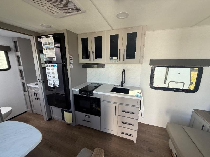 This compact, yet feature-packed travel trailer offers smart design and comfort throughout. Step inside through the 28" entry to find a front queen bed that easily converts into a 60" jackknife sofa, flanked by wardrobe nightstands for your clothes and essentials. The central kitchen is equipped with a 10-cu. ft. refrigerator, two-burner cooktop, sink, and overhead storage, while a booth dinette across from it offers dining space and a clear view of the 32-inch TV. At the rear, enjoy the convenience of a full bathroom with a spacious 30" x 36" shower, a sink with linen shelves, and additional overhead compartments for organized storage.