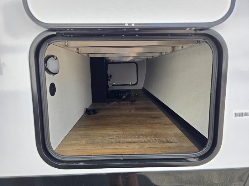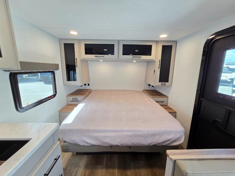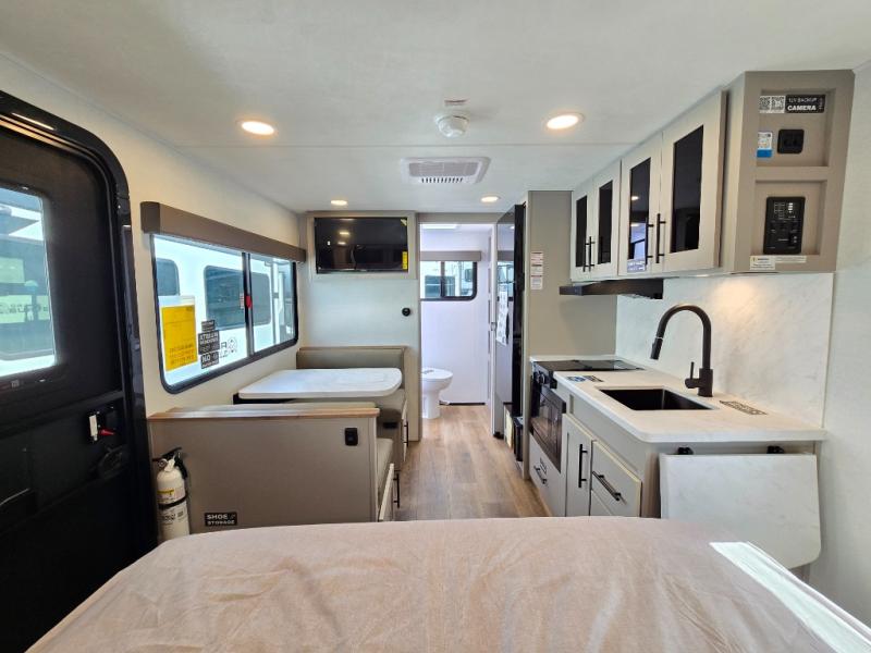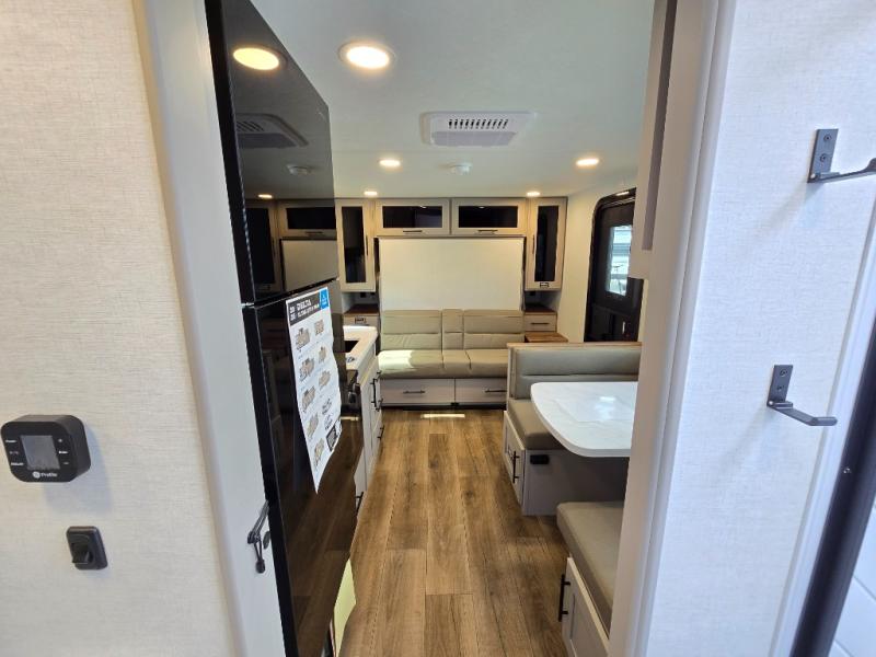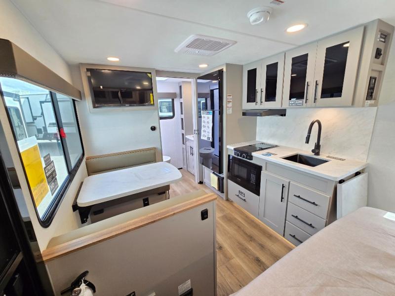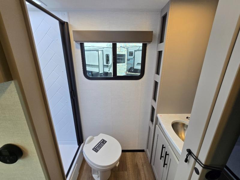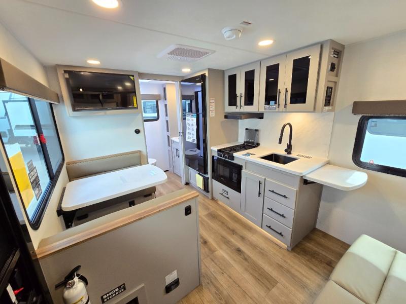 This compact, yet feature-packed travel trailer offers smart design and comfort throughout. Step inside through the 28" entry to find a front queen bed that easily converts into a 60" jackknife sofa, flanked by wardrobe nightstands for your clothes and essentials. The central kitchen is equipped with a 10-cu. ft. refrigerator, two-burner cooktop, sink, and overhead storage, while a booth dinette across from it offers dining space and a clear view of the 32-inch TV. At the rear, enjoy the convenience of a full bathroom with a spacious 30" x 36" shower, a sink with linen shelves, and additional overhead compartments for organized storage.