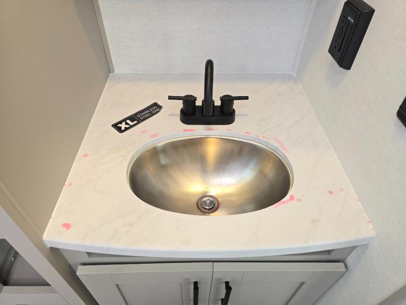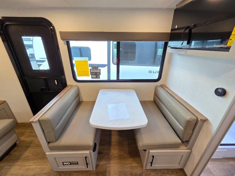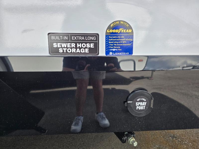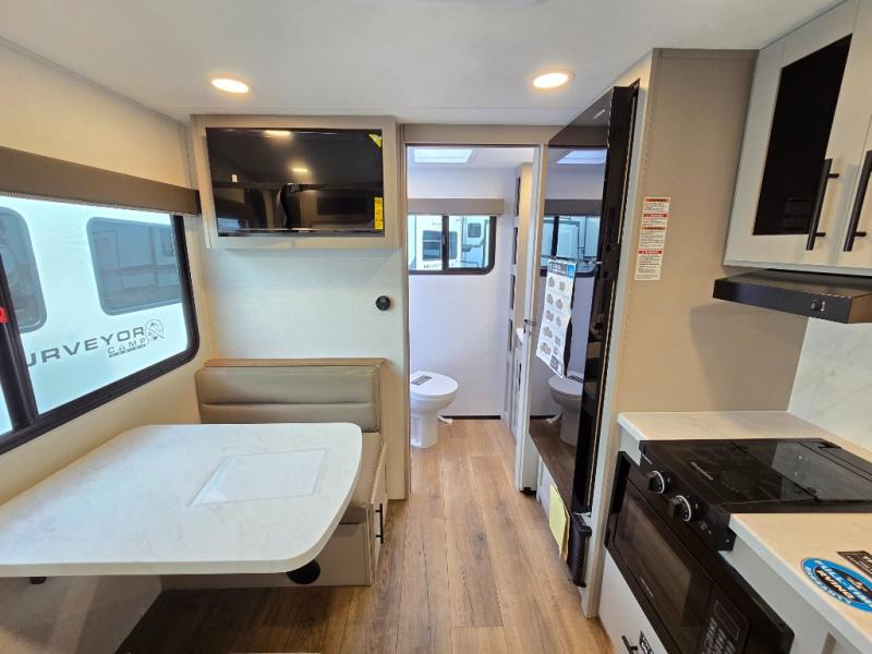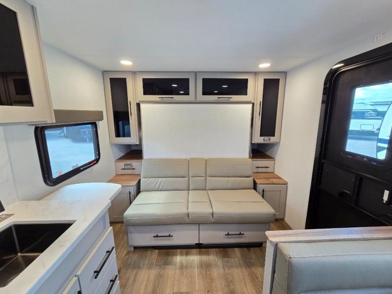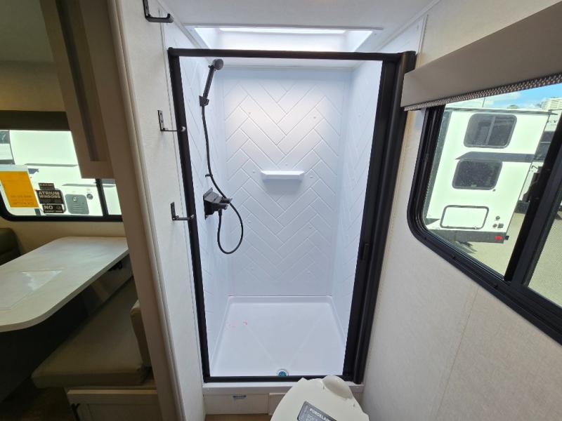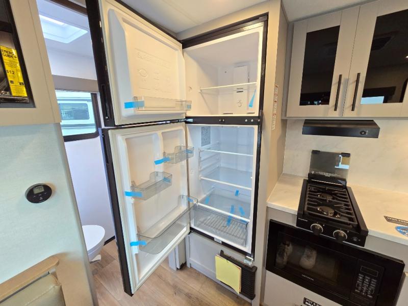 This compact, yet feature-packed travel trailer offers smart design and comfort throughout. Step inside through the 28" entry to find a front queen bed that easily converts into a 60" jackknife sofa, flanked by wardrobe nightstands for your clothes and essentials. The central kitchen is equipped with a 10-cu. ft. refrigerator, two-burner cooktop, sink, and overhead storage, while a booth dinette across from it offers dining space and a clear view of the 32-inch TV. At the rear, enjoy the convenience of a full bathroom with a spacious 30" x 36" shower, a sink with linen shelves, and additional overhead compartments for organized storage.
