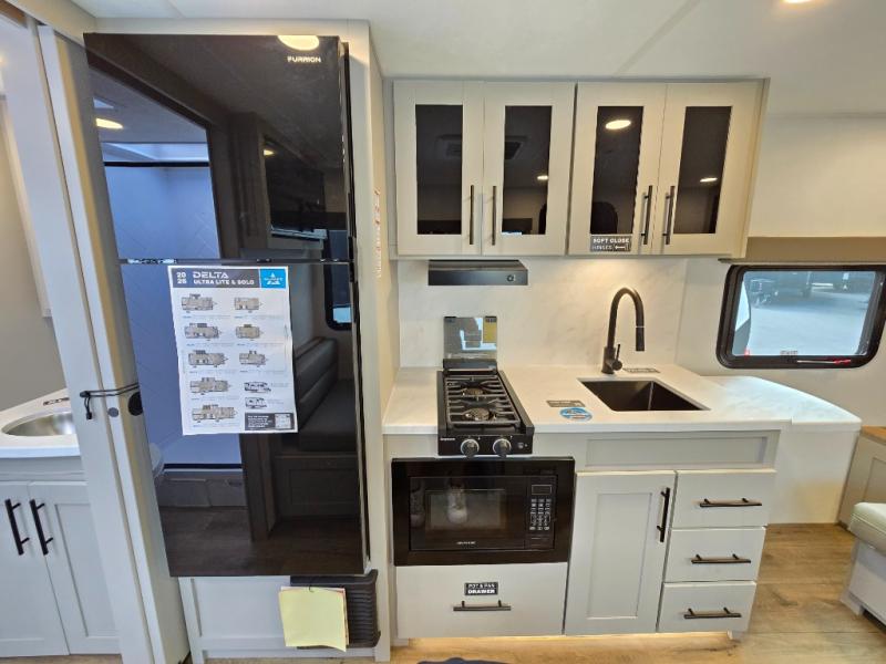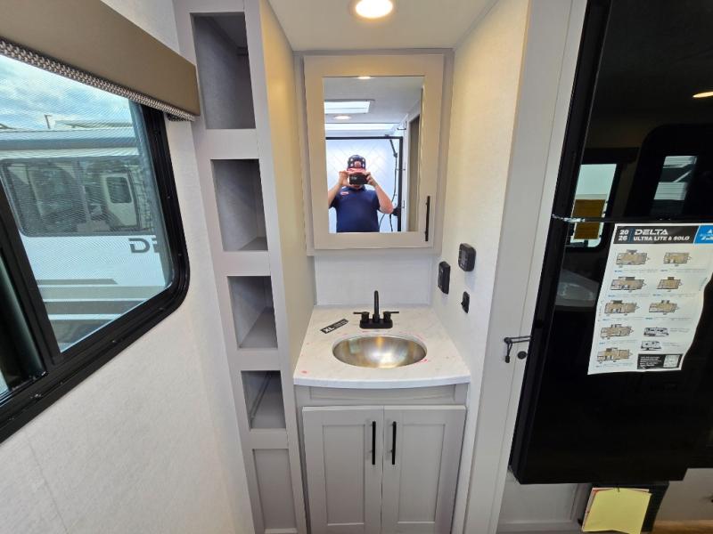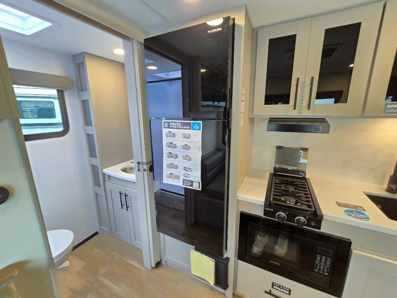 Each Delta Solo Model Each is designed to provide both comfort and convenience in a compact footprint. Inside, you'll find residential-style touches like can-style LED ceiling lights, cabinet doors with magnetic catches, and commercial-grade vinyl flooring built to last. On the exterior, practical travel features include exterior switches for the slide-out and awning, sturdy Step Above fold-out entry steps, and color-coded, numbered wiring for simplified maintenance and troubleshooting.