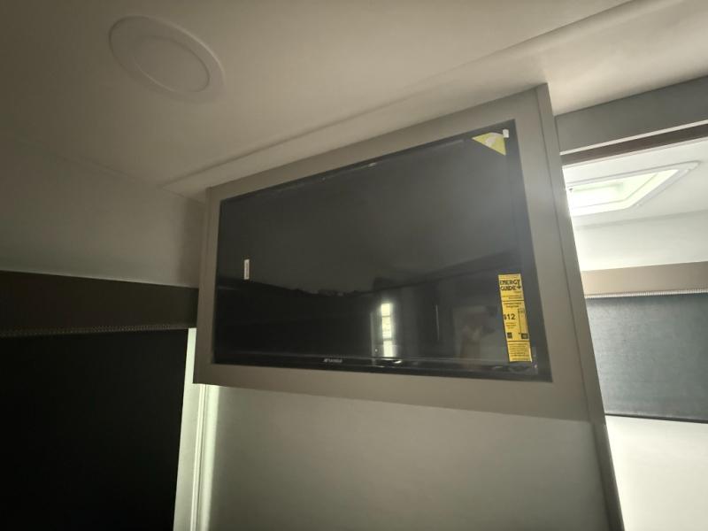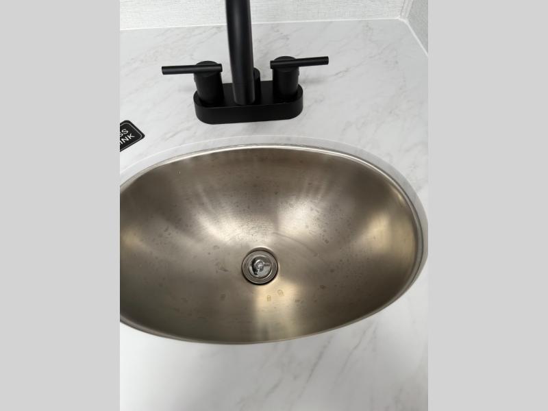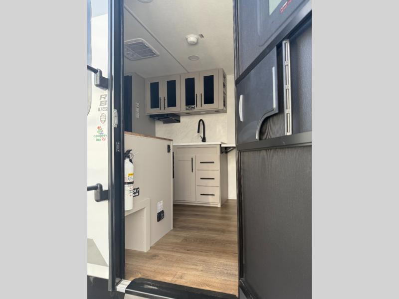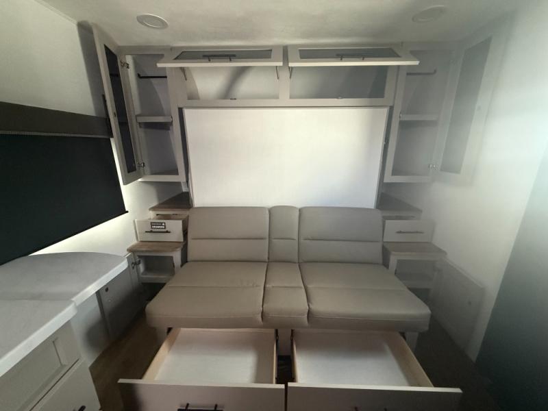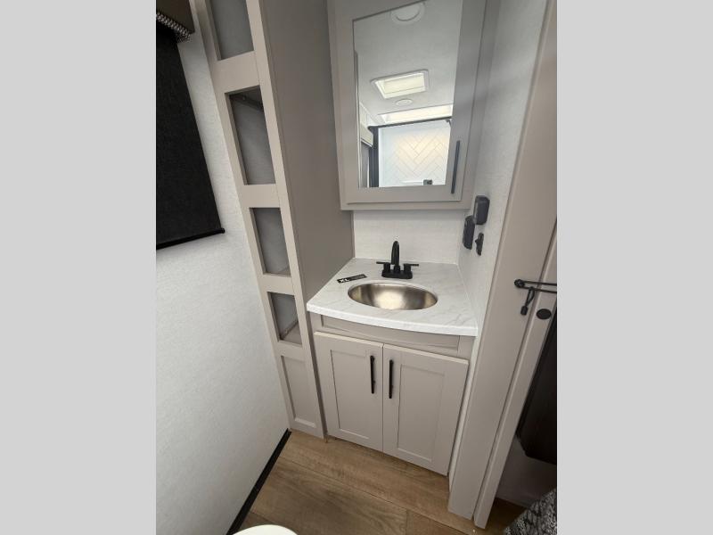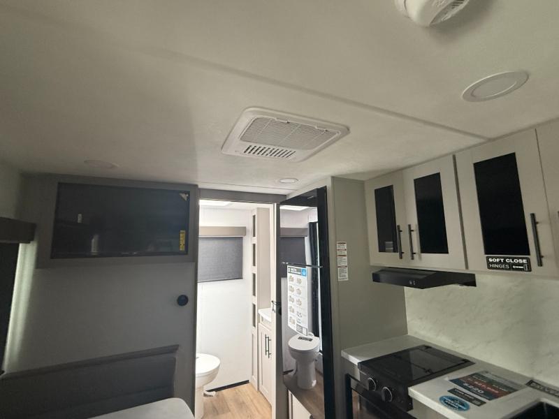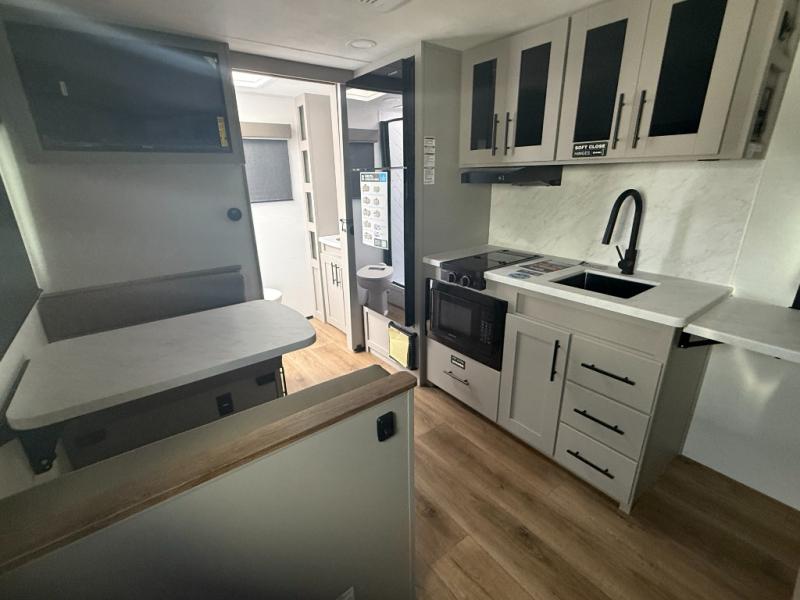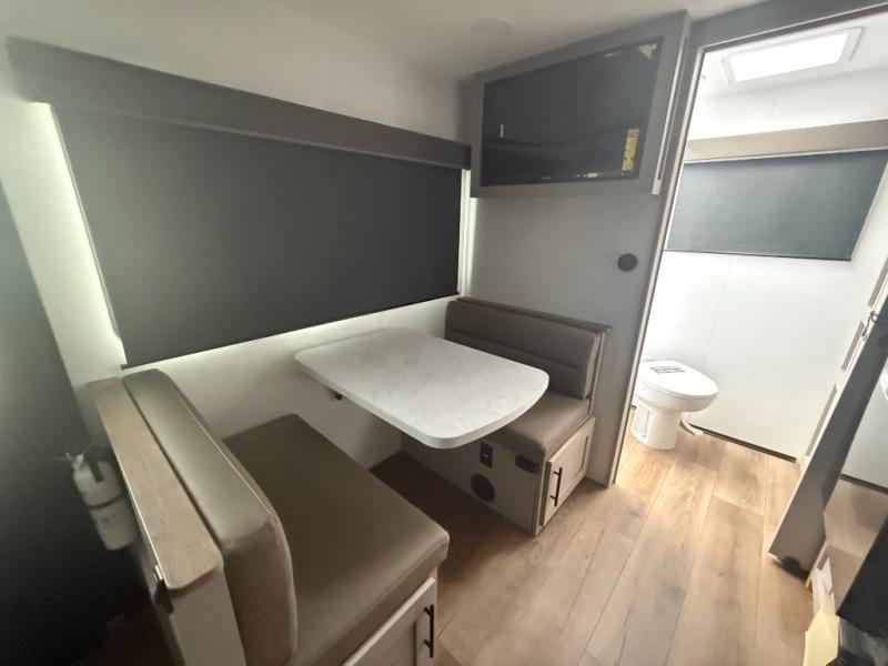 This compact, yet feature-packed travel trailer offers smart design and comfort throughout. Step inside through the 28" entry to find a front queen bed that easily converts into a 60" jackknife sofa, flanked by wardrobe nightstands for your clothes and essentials. The central kitchen is equipped with a 10-cu. ft. refrigerator, two-burner cooktop, sink, and overhead storage, while a booth dinette across from it offers dining space and a clear view of the 32-inch TV. At the rear, enjoy the convenience of a full bathroom with a spacious 30" x 36" shower, a sink with linen shelves, and additional overhead compartments for organized storage.