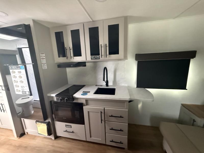 Each Delta Solo Model Each is designed to provide both comfort and convenience in a compact footprint. Inside, you'll find residential-style touches like can-style LED ceiling lights, cabinet doors with magnetic catches, and commercial-grade vinyl flooring built to last. On the exterior, practical travel features include exterior switches for the slide-out and awning, sturdy Step Above fold-out entry steps, and color-coded, numbered wiring for simplified maintenance and troubleshooting.