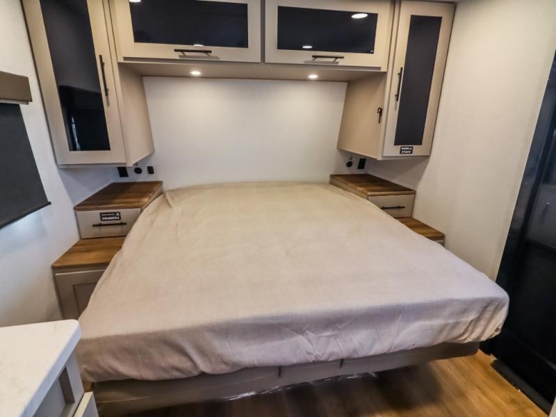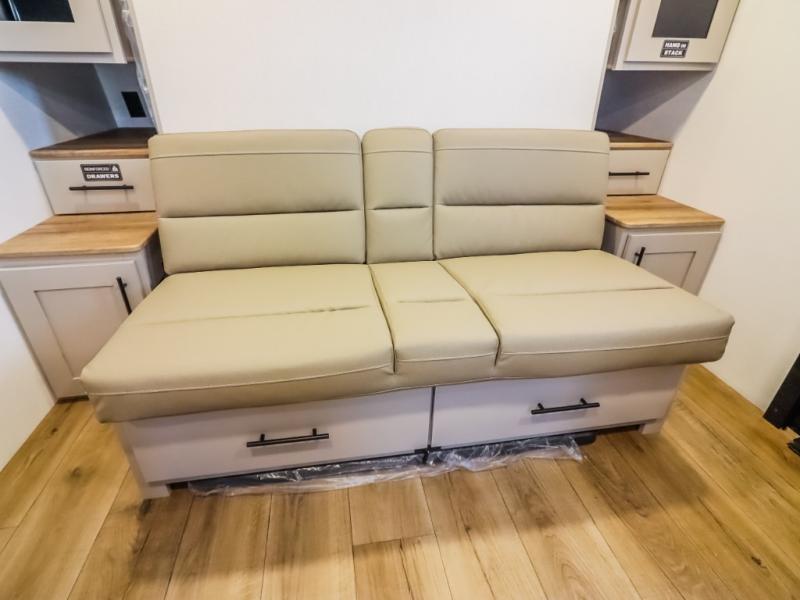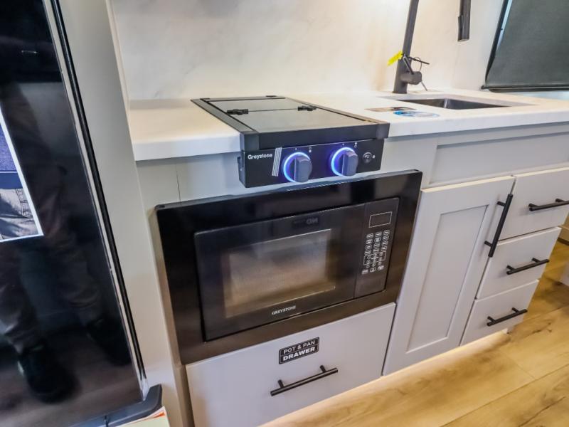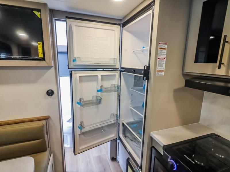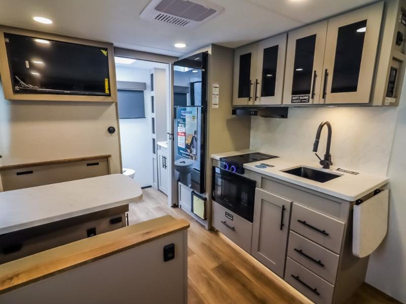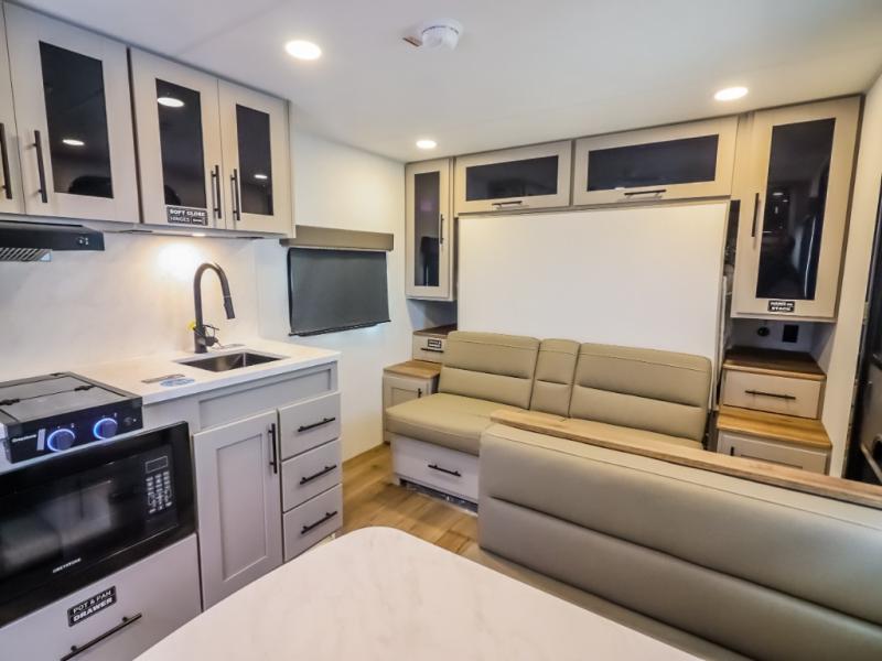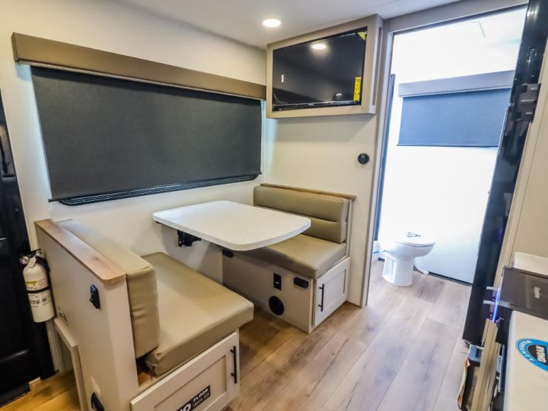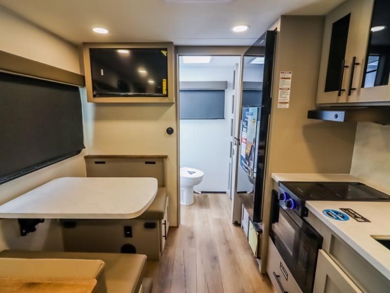 This compact, yet feature-packed travel trailer offers smart design and comfort throughout. Step inside through the 28" entry to find a front queen bed that easily converts into a 60" jackknife sofa, flanked by wardrobe nightstands for your clothes and essentials. The central kitchen is equipped with a 10-cu. ft. refrigerator, two-burner cooktop, sink, and overhead storage, while a booth dinette across from it offers dining space and a clear view of the 32-inch TV. At the rear, enjoy the convenience of a full bathroom with a spacious 30" x 36" shower, a sink with linen shelves, and additional overhead compartments for organized storage.