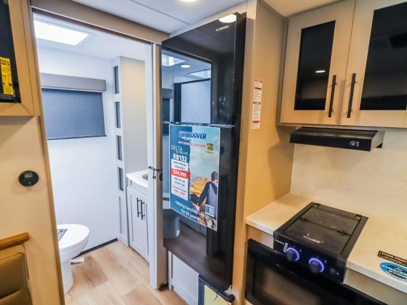 Each Delta Solo Model Each is designed to provide both comfort and convenience in a compact footprint. Inside, you'll find residential-style touches like can-style LED ceiling lights, cabinet doors with magnetic catches, and commercial-grade vinyl flooring built to last. On the exterior, practical travel features include exterior switches for the slide-out and awning, sturdy Step Above fold-out entry steps, and color-coded, numbered wiring for simplified maintenance and troubleshooting.