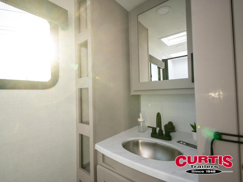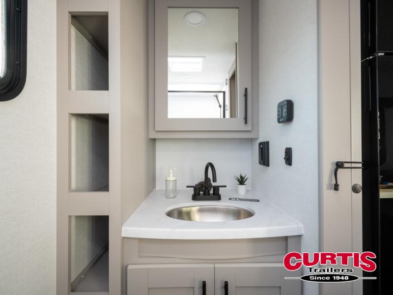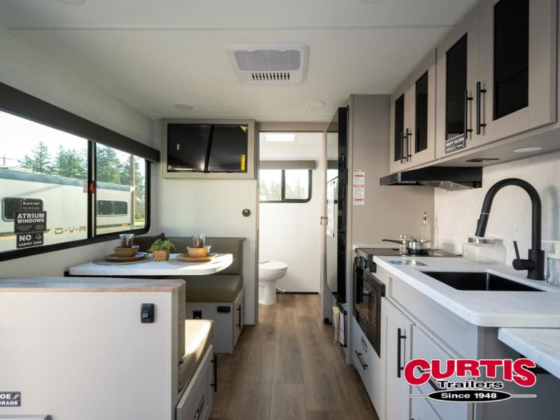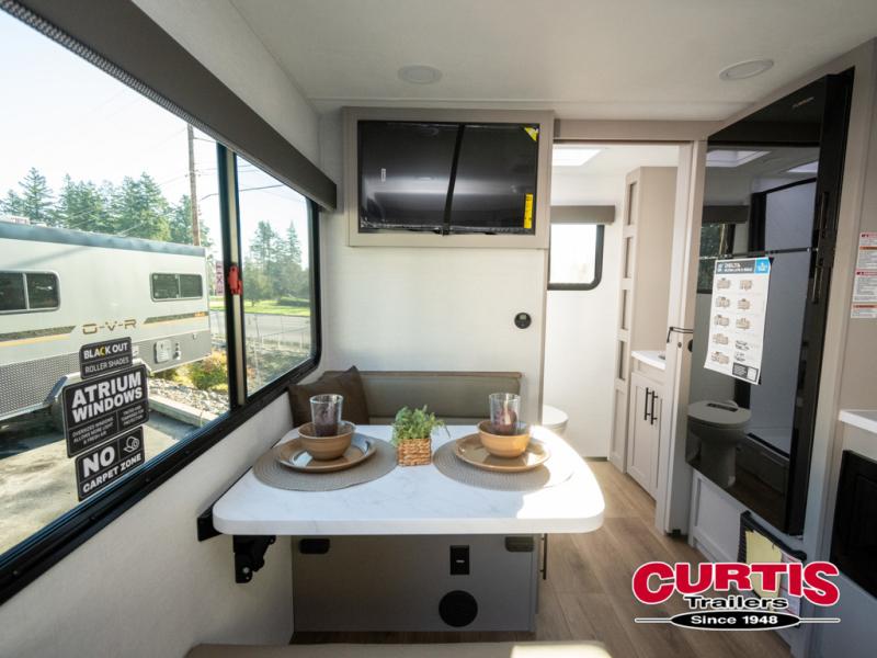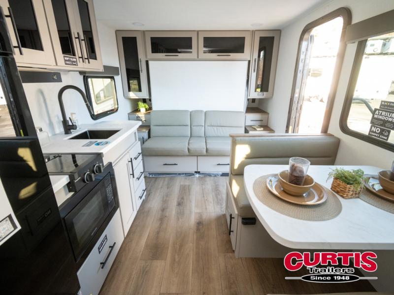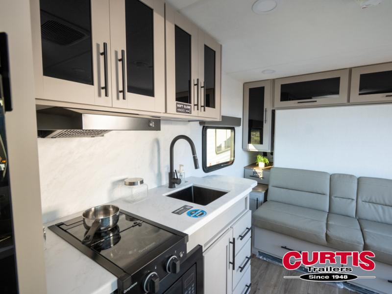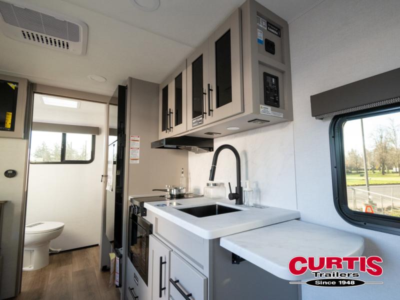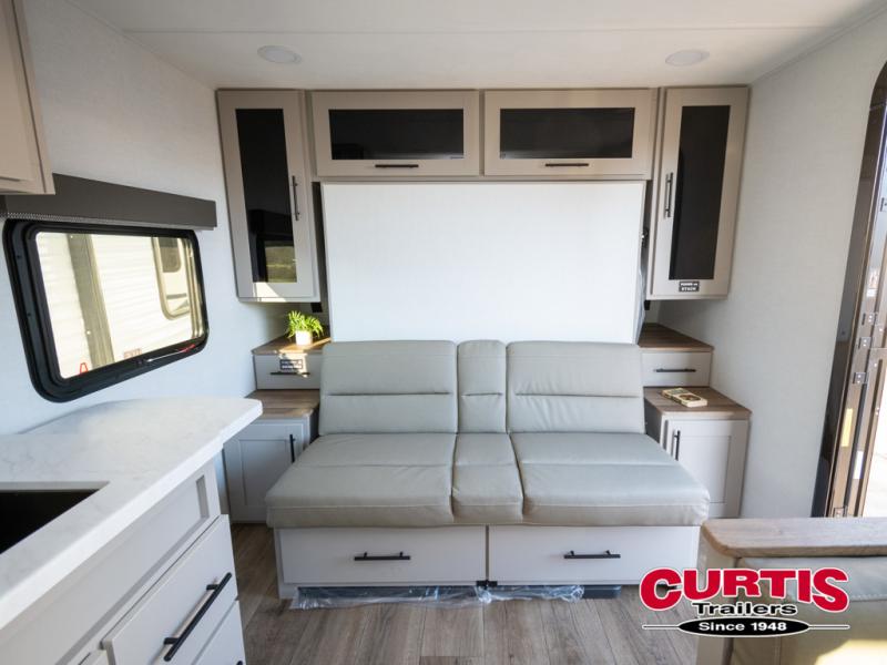 This compact, yet feature-packed travel trailer offers smart design and comfort throughout. Step inside through the 28" entry to find a front queen bed that easily converts into a 60" jackknife sofa, flanked by wardrobe nightstands for your clothes and essentials. The central kitchen is equipped with a 10-cu. ft. refrigerator, two-burner cooktop, sink, and overhead storage, while a booth dinette across from it offers dining space and a clear view of the 32-inch TV. At the rear, enjoy the convenience of a full bathroom with a spacious 30" x 36" shower, a sink with linen shelves, and additional overhead compartments for organized storage.