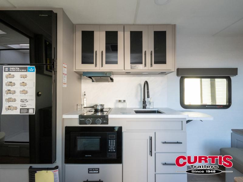 Each Delta Solo Model Each is designed to provide both comfort and convenience in a compact footprint. Inside, you'll find residential-style touches like can-style LED ceiling lights, cabinet doors with magnetic catches, and commercial-grade vinyl flooring built to last. On the exterior, practical travel features include exterior switches for the slide-out and awning, sturdy Step Above fold-out entry steps, and color-coded, numbered wiring for simplified maintenance and troubleshooting.