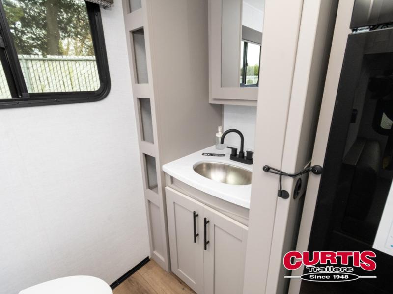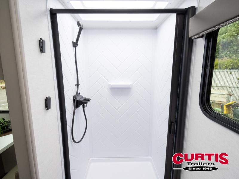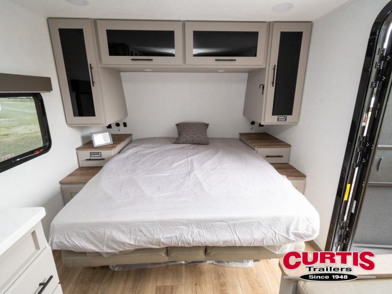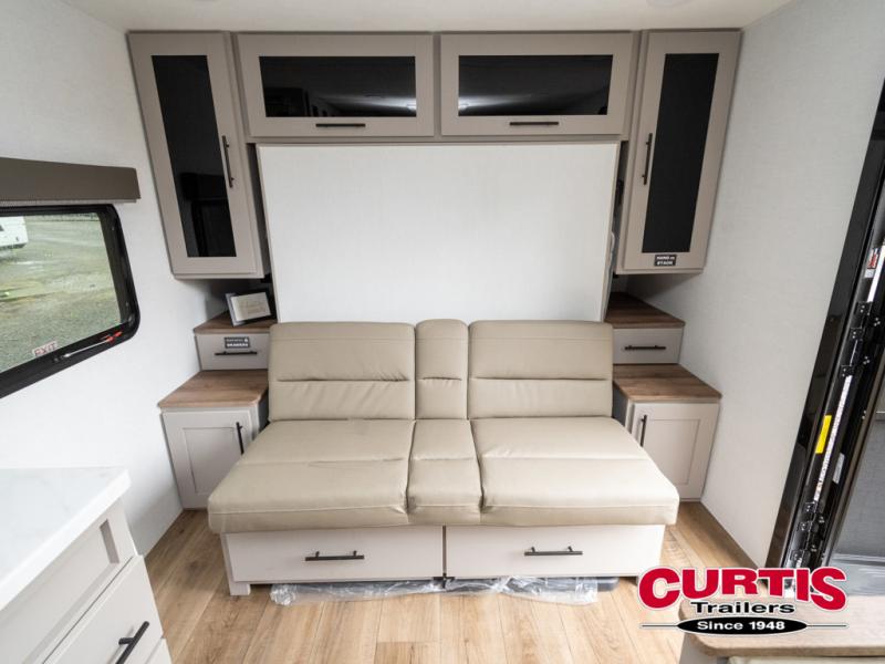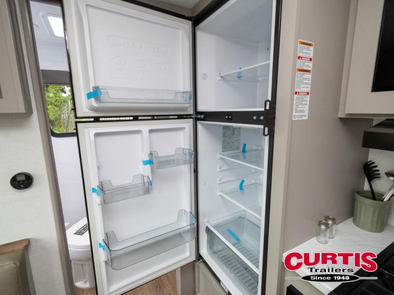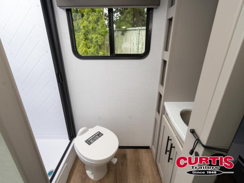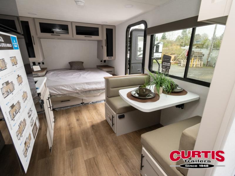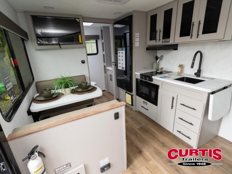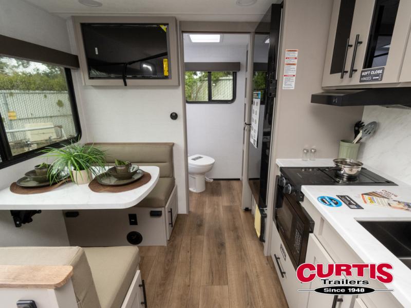 This compact, yet feature-packed travel trailer offers smart design and comfort throughout. Step inside through the 28" entry to find a front queen bed that easily converts into a 60" jackknife sofa, flanked by wardrobe nightstands for your clothes and essentials. The central kitchen is equipped with a 10-cu. ft. refrigerator, two-burner cooktop, sink, and overhead storage, while a booth dinette across from it offers dining space and a clear view of the 32-inch TV. At the rear, enjoy the convenience of a full bathroom with a spacious 30" x 36" shower, a sink with linen shelves, and additional overhead compartments for organized storage.