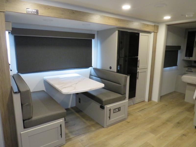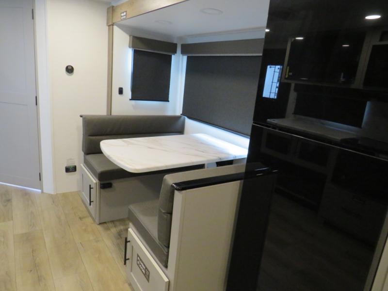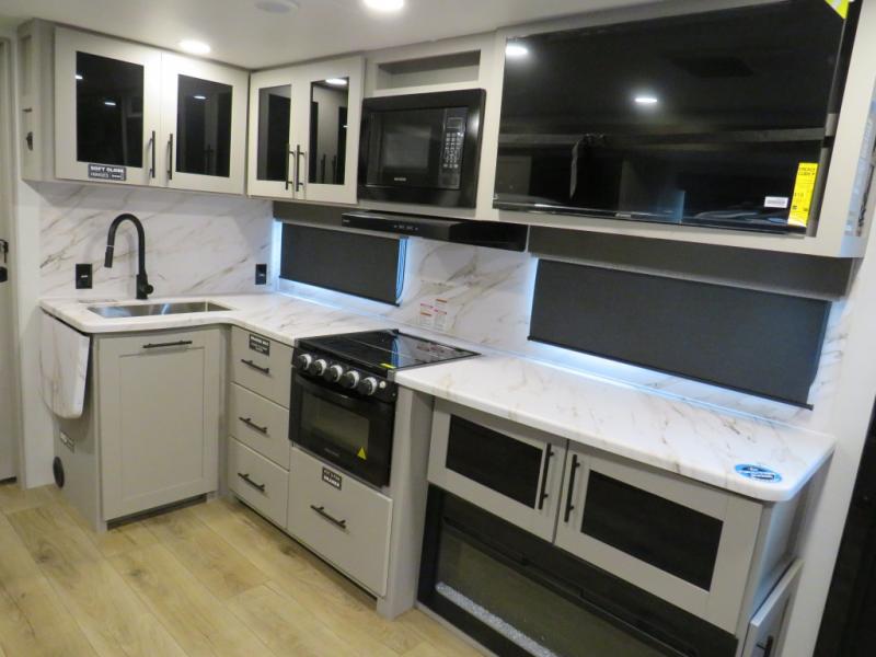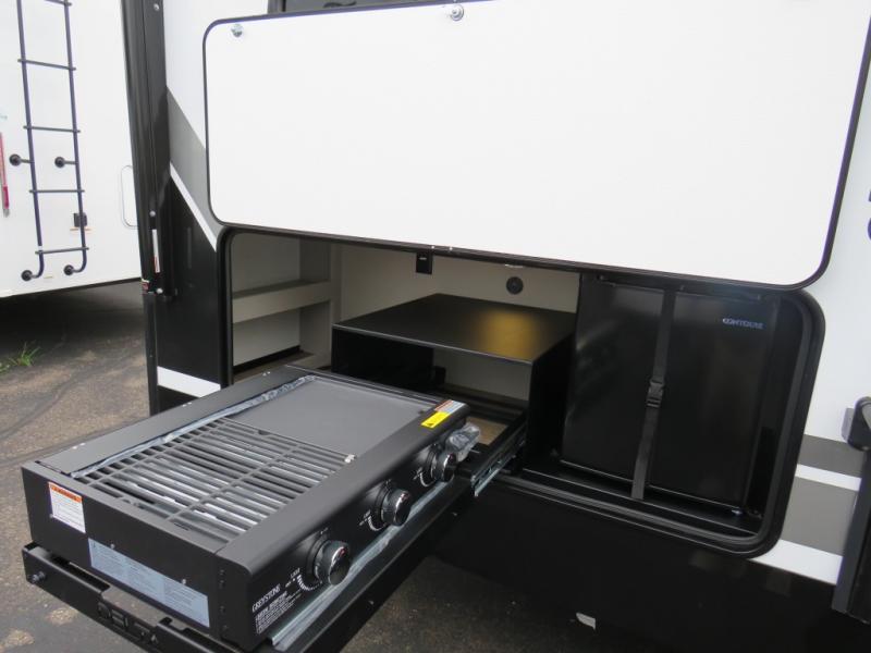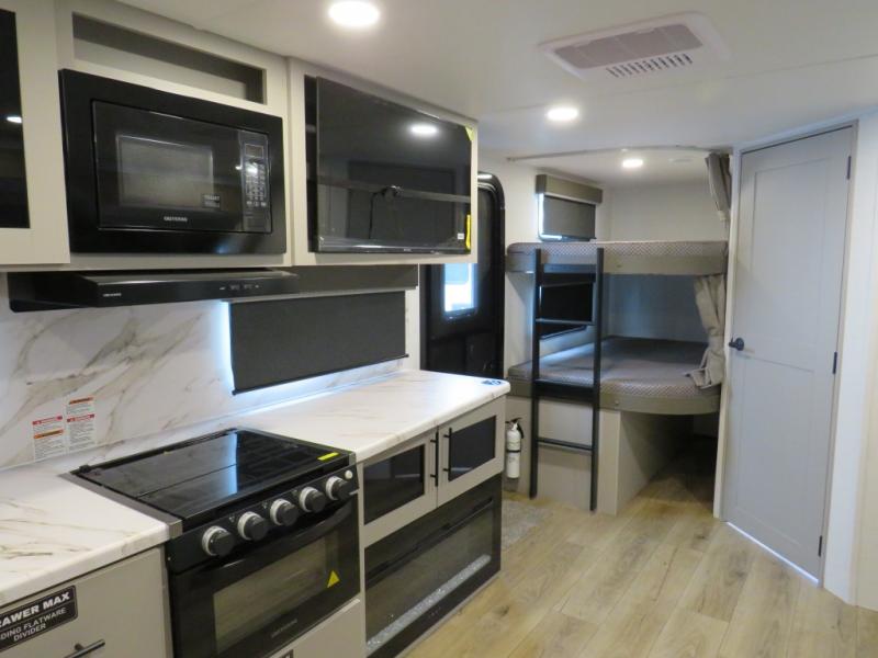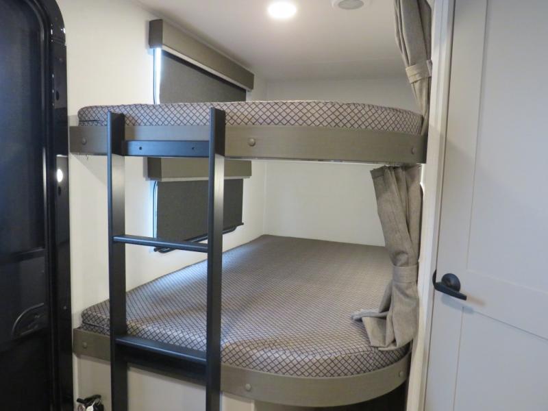 If you're looking for a trailer that can sleep more campers, this is the one! There are 46" x 74" bunks in the back right beside the full bath for easy nighttime use. You'll have your own bedroom up front, complete with a queen bed, dual wardrobe nightstands, and overhead storage. The large slide out in the main living area will provide your crew with plenty of space to dine at the booth dinette or just relax in front of the fireplace. There is a full kitchen inside, along with an exterior griddle/grill when you want to cook outdoors!