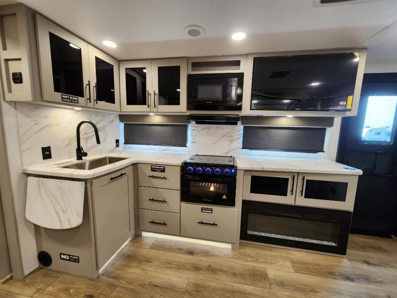 If you're looking for a trailer that can sleep more campers, this is the one! There are 46" x 74" bunks in the back right beside the full bath for easy nighttime use. You'll have your own bedroom up front, complete with a queen bed, dual wardrobe nightstands, and overhead storage. The large slide out in the main living area will provide your crew with plenty of space to dine at the booth dinette or just relax in front of the fireplace. There is a full kitchen inside, along with an exterior griddle/grill when you want to cook outdoors!