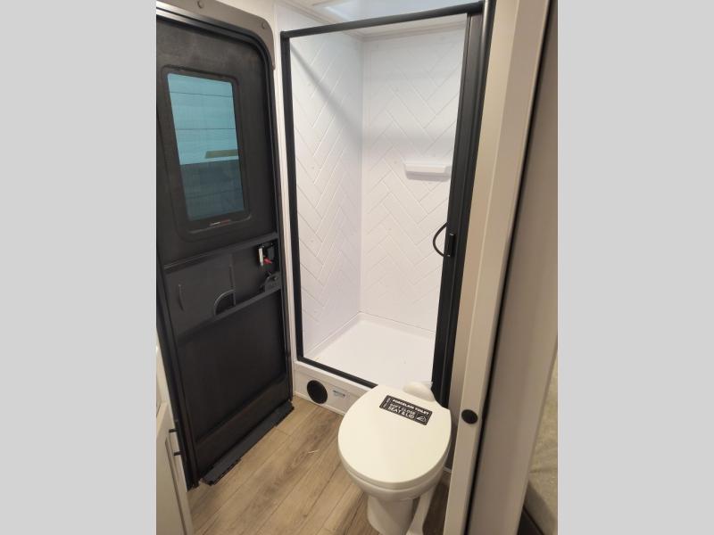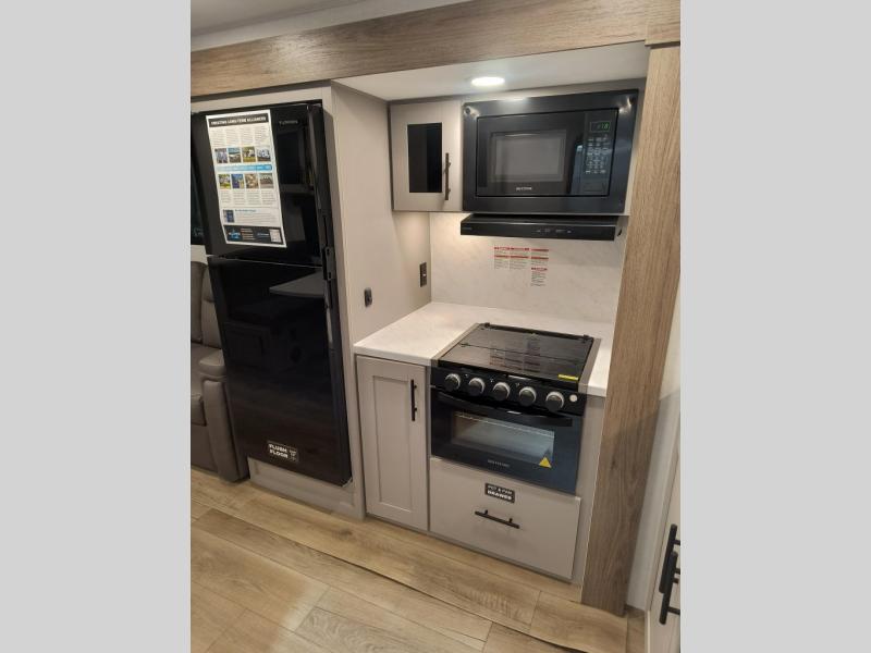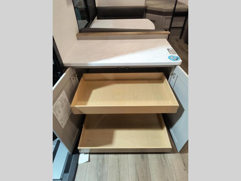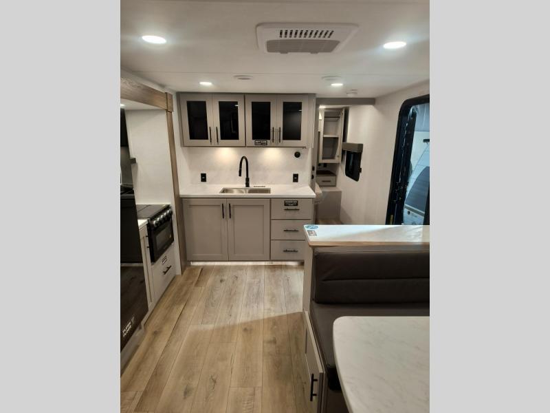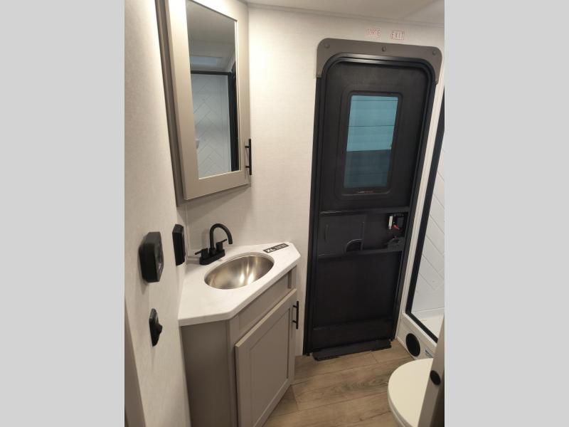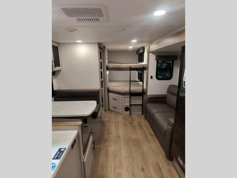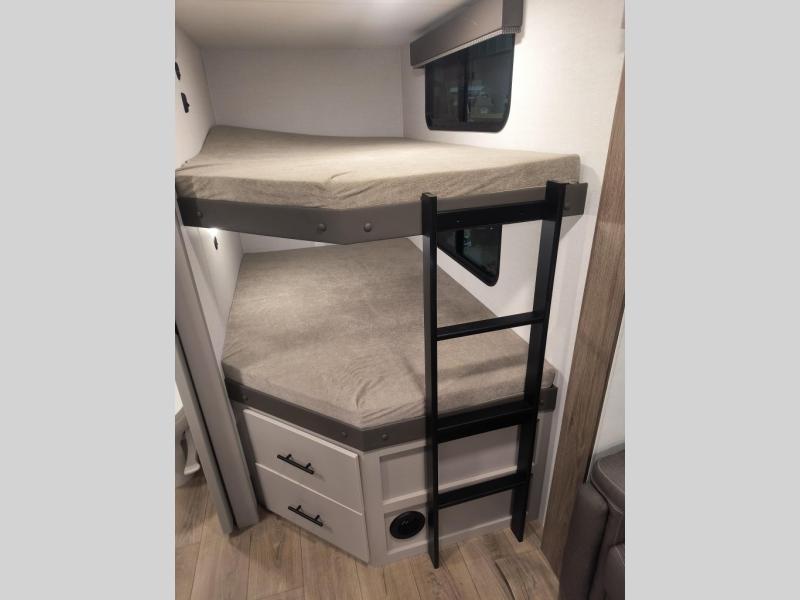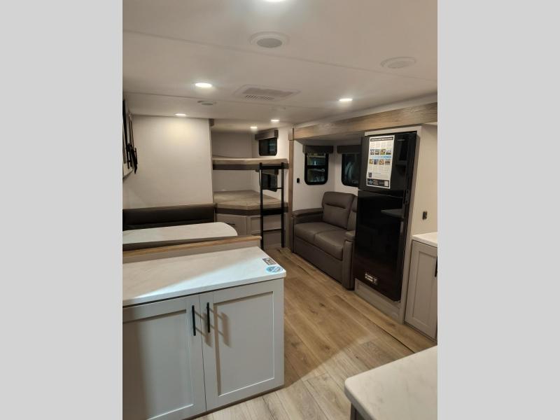 At the front of the trailer, the main bedroom offers a spacious 60" x 80" bed for a restful night’s sleep, with wardrobe nightstands on each side to keep your essentials and clothing neatly organized. Moving into the center, the kitchen and living area provide a well-designed space for both cooking and relaxing, featuring a sink with ample counter space for meal prep. The large slide-out houses a comfortable sofa where you can unwind after a long day, as well as a 10 cu. ft. refrigerator, three-burner range, and microwave so you can prepare meals with ease. Across from the slide, the booth dinette offers a welcoming spot to enjoy meals, play games, or watch a show on the 40" TV. At the rear, two 46" x 74" bunks give the whole crew a cozy place to rest, while the opposite corner holds the full bathroom with its 30" x 36" shower and convenient second entry door, making it easy to clean up before stepping inside.