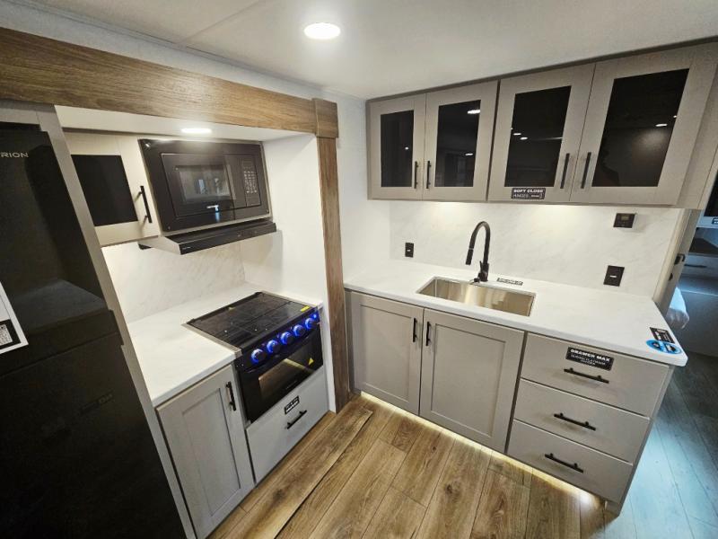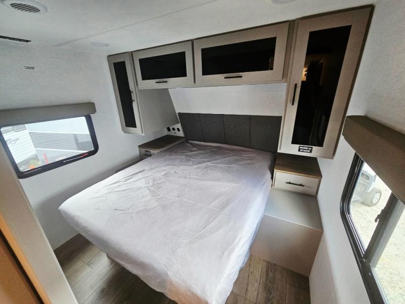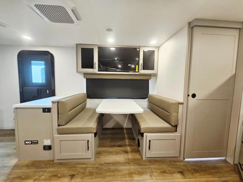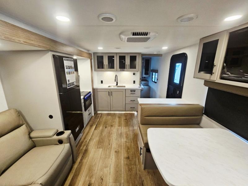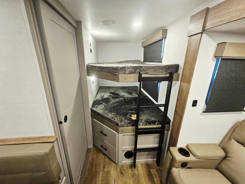 At the front of the trailer, the main bedroom offers a spacious 60" x 80" bed for a restful night’s sleep, with wardrobe nightstands on each side to keep your essentials and clothing neatly organized. Moving into the center, the kitchen and living area provide a well-designed space for both cooking and relaxing, featuring a sink with ample counter space for meal prep. The large slide-out houses a comfortable sofa where you can unwind after a long day, as well as a 10 cu. ft. refrigerator, three-burner range, and microwave so you can prepare meals with ease. Across from the slide, the booth dinette offers a welcoming spot to enjoy meals, play games, or watch a show on the 40" TV. At the rear, two 46" x 74" bunks give the whole crew a cozy place to rest, while the opposite corner holds the full bathroom with its 30" x 36" shower and convenient second entry door, making it easy to clean up before stepping inside.