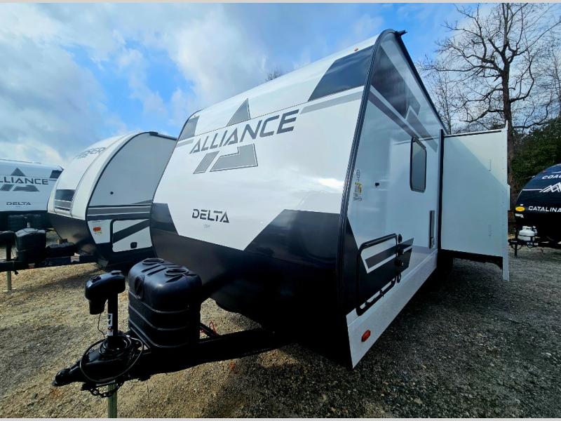 The Delta Ultra Lite travel trailers by Alliance RV are perfect for those looking for a lighter tow weight! The fully functional oversized atrium windows will let more natural light in, and the carpet free interior will be appreciated after a weekend at the lake. There are also magnet catches on all cabinets, soft close hidden hinges, and residential can style LED ceiling lights. The exterior includes multiple location hot/cold spray ports, exterior switches for awning controls, and Goodyear Endurance tires. Start a new adventure today in a Delta Ultra Lite travel trailer!