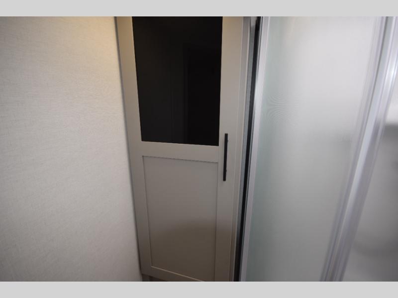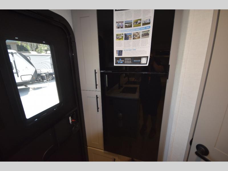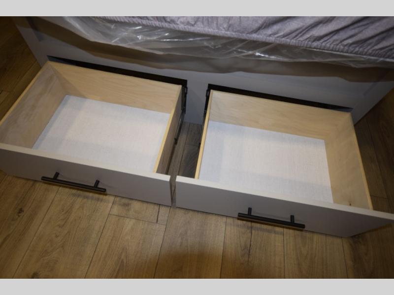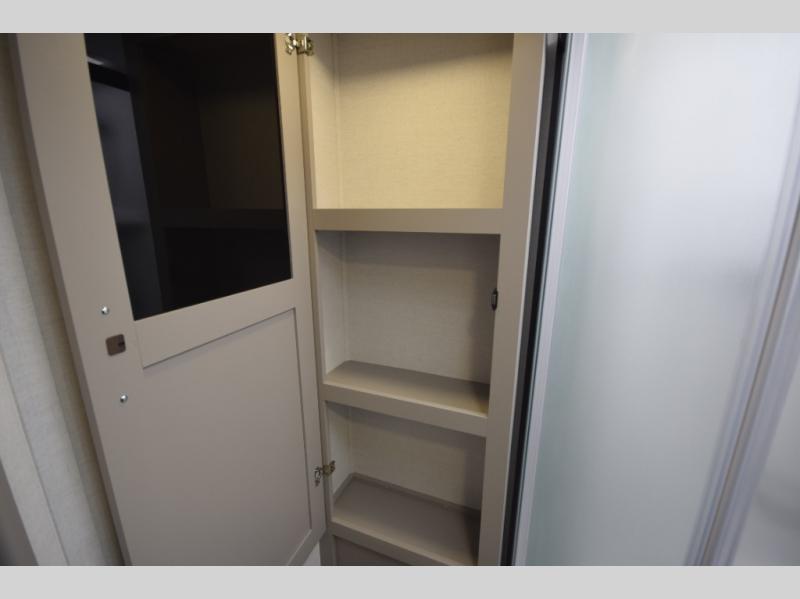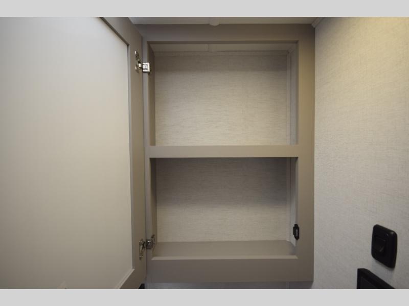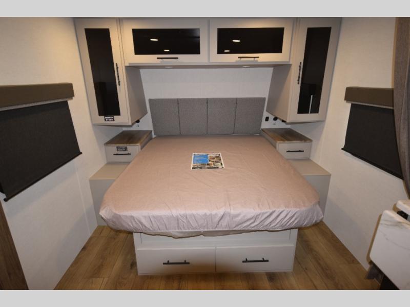 The front queen bed is framed by dual wardrobes, nightstands, and overhead storage, offering all the space you need to stay organized while on the go.