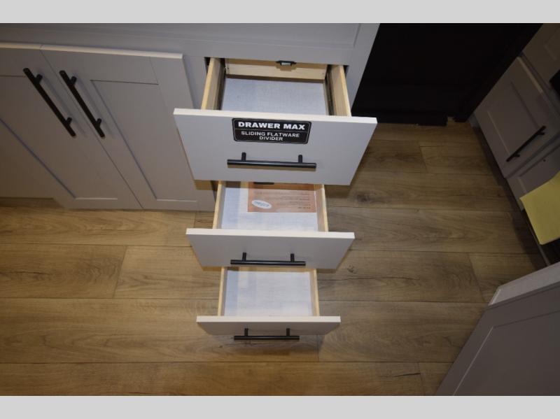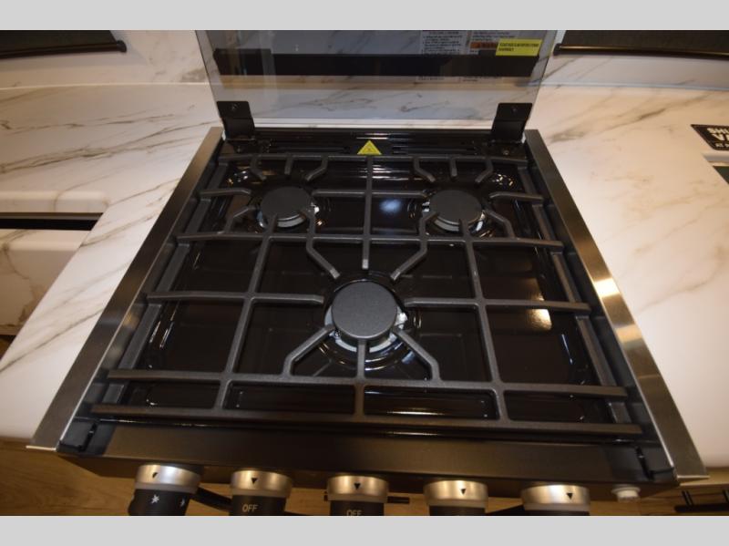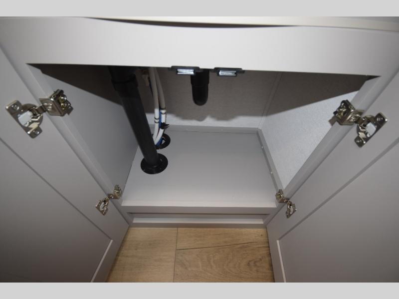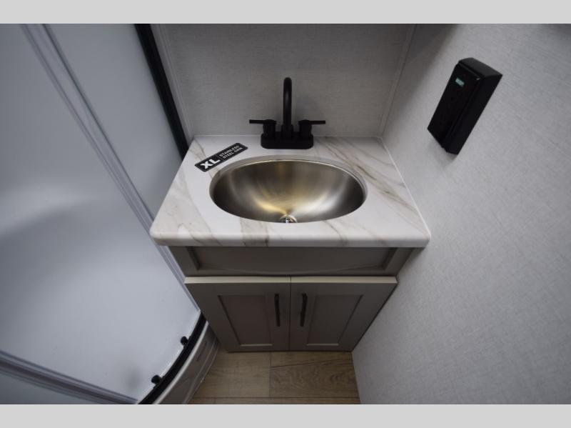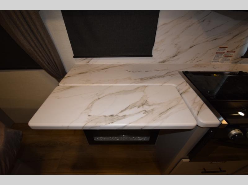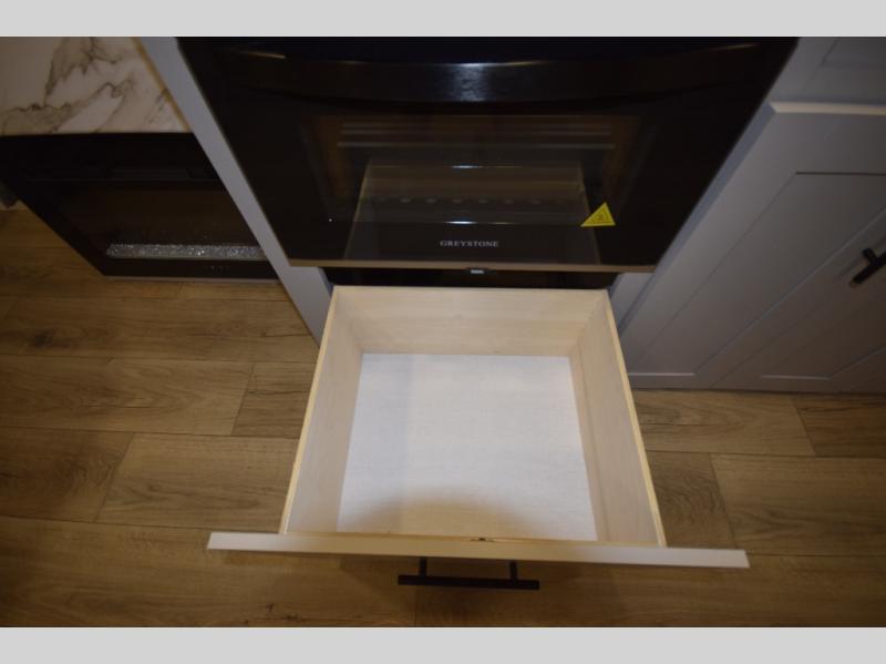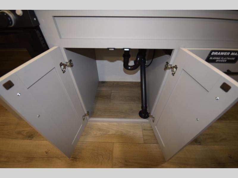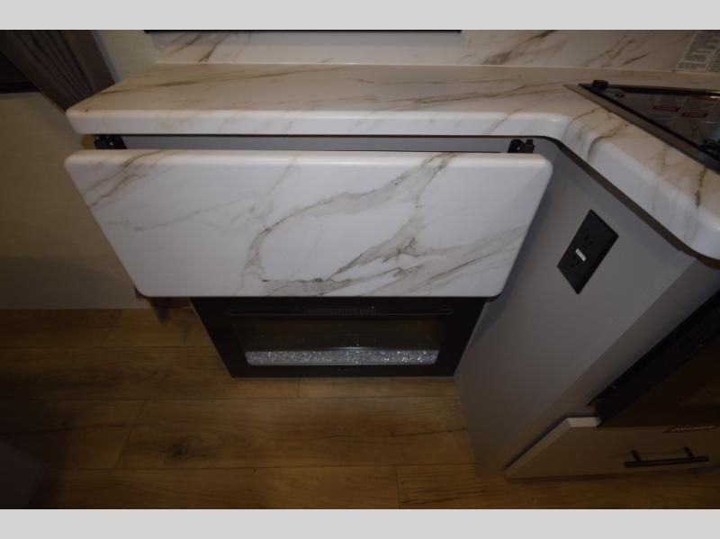 Inside, you’ll find premium features wrapped in a clean, carpet-free design. The fireplace adds warmth and ambiance, while two removable tables provide flexibility for dining or work. A flip-up counter extension gives you extra prep space beside the kitchen, and the large stainless sink makes cleanup a breeze.