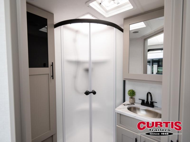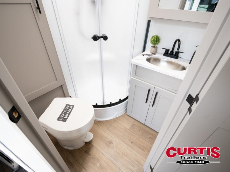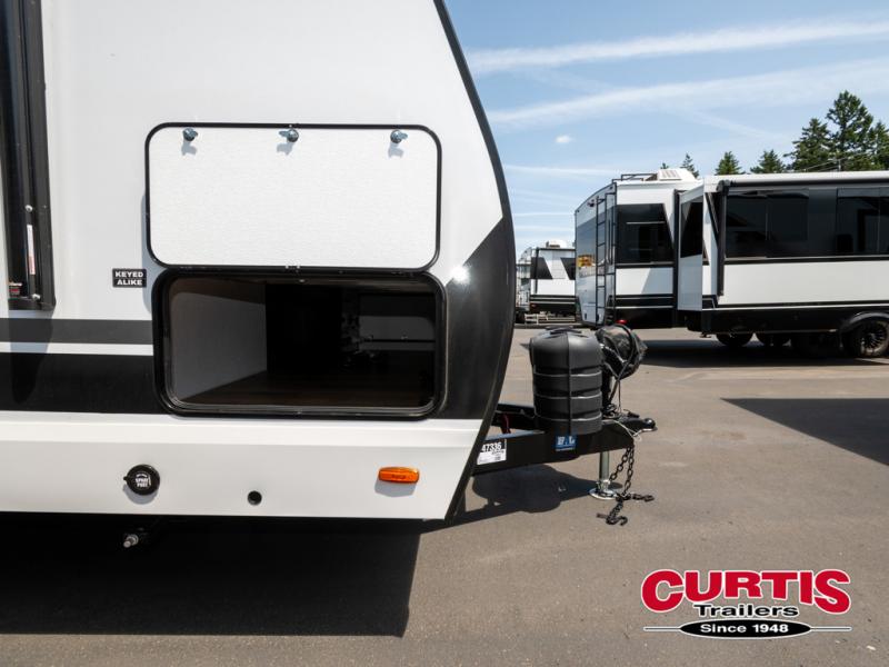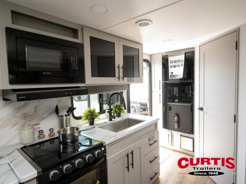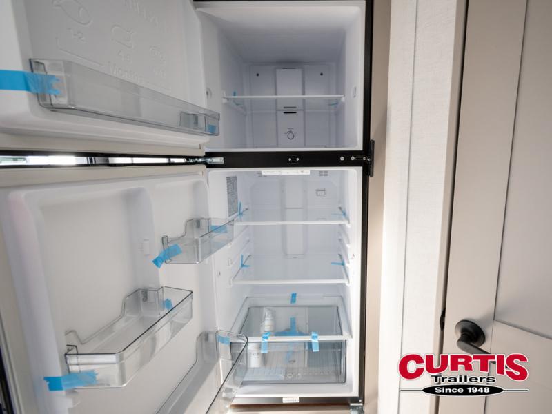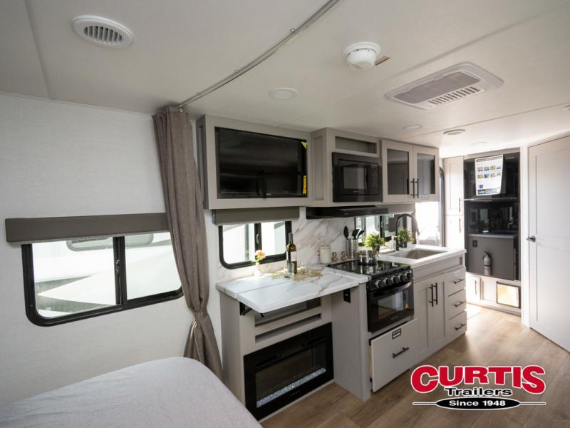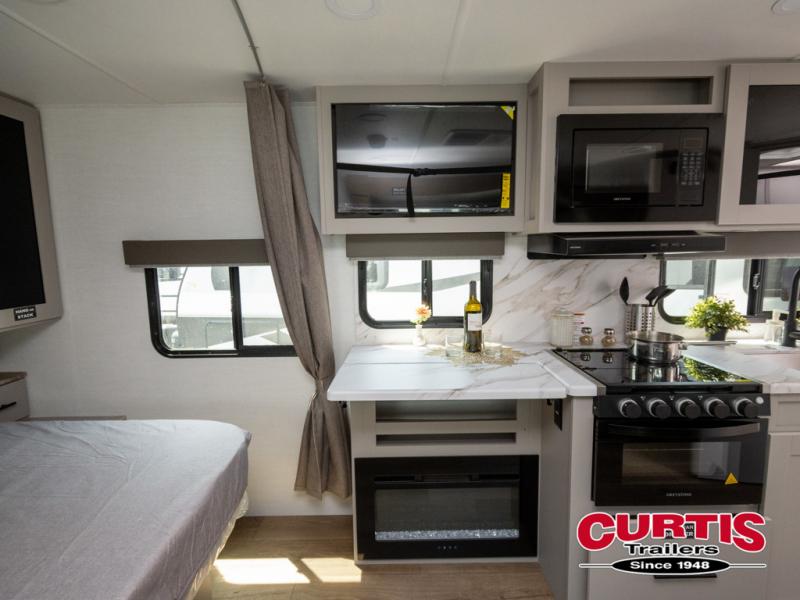 This couple's trailer is perfect for weekend trips to your favorite campground. The theater seat slide will provide comfort and space, while the fireplace across the room will have you feeling right at home. There are also two tables for the sofa and a flip-up extension by the fireplace for more counter space. All of your meals can be made on the three burner cooktop, and clean up will be a breeze with the large kitchen sink. A full bath is complete with a toilet, sink, 32" shower and a linen closet, and the front queen bed with a privacy curtain is sure to provide a great night's rest. You'll also find dual wardrobes and nightstands, along with overhead storage to keep everything organized!