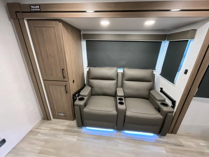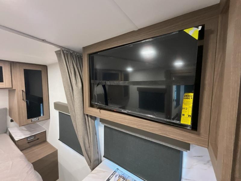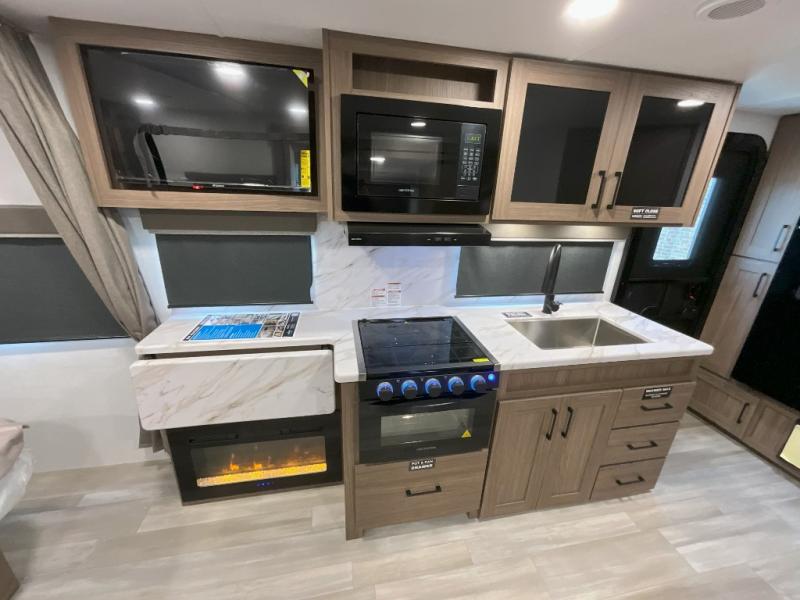 This couple's trailer is perfect for weekend trips to your favorite campground. The theater seat slide will provide comfort and space, while the fireplace across the room will have you feeling right at home. There are also two tables for the sofa and a flip-up extension by the fireplace for more counter space. All of your meals can be made on the three burner cooktop, and clean up will be a breeze with the large kitchen sink. A full bath is complete with a toilet, sink, 32" shower and a linen closet, and the front queen bed with a privacy curtain is sure to provide a great night's rest. You'll also find dual wardrobes and nightstands, along with overhead storage to keep everything organized!