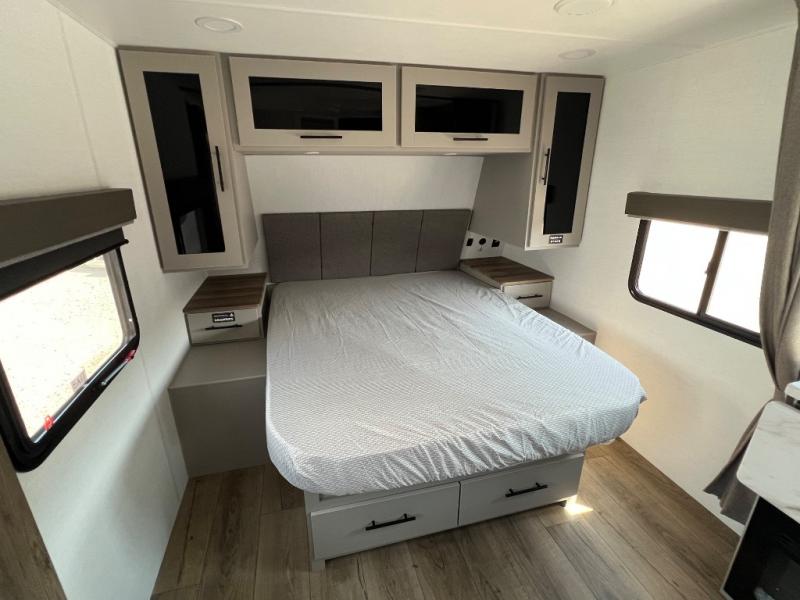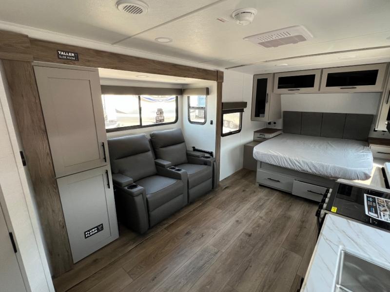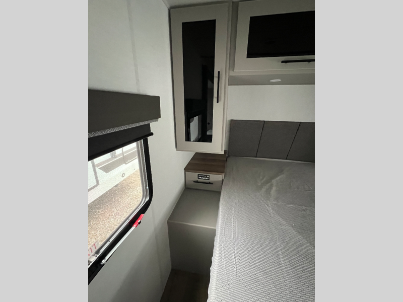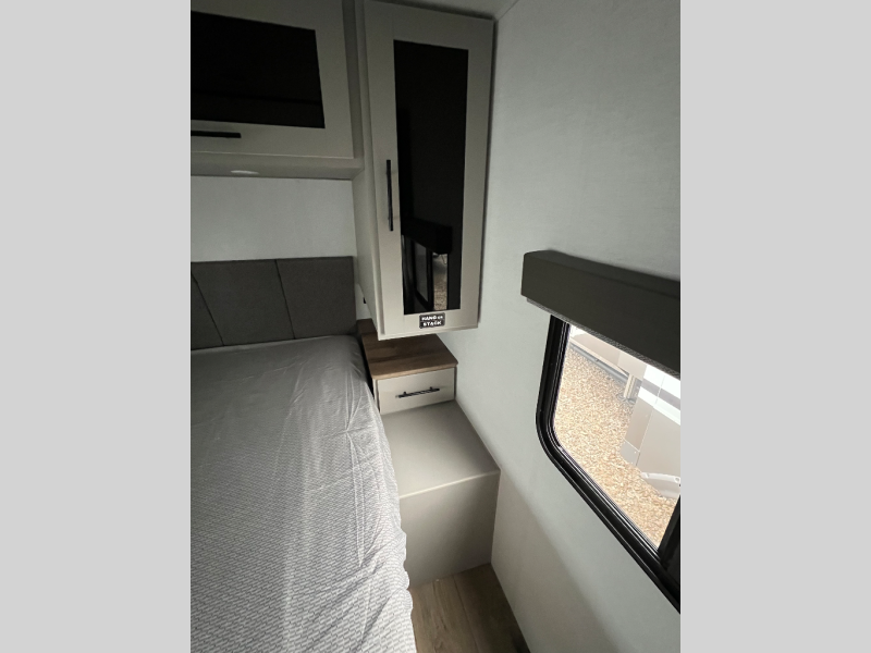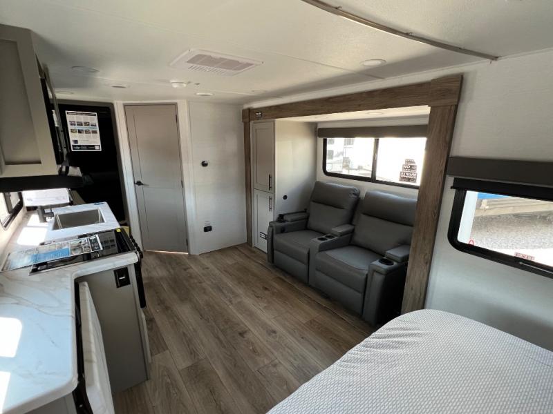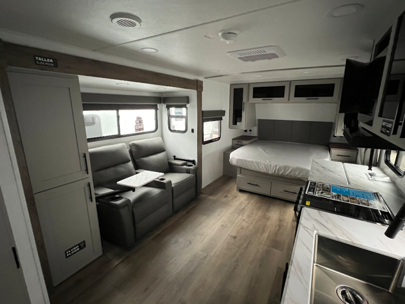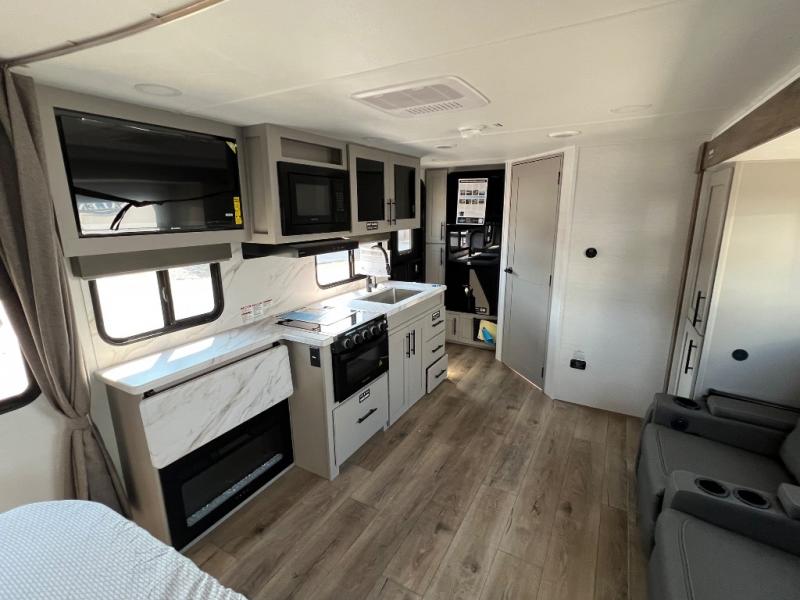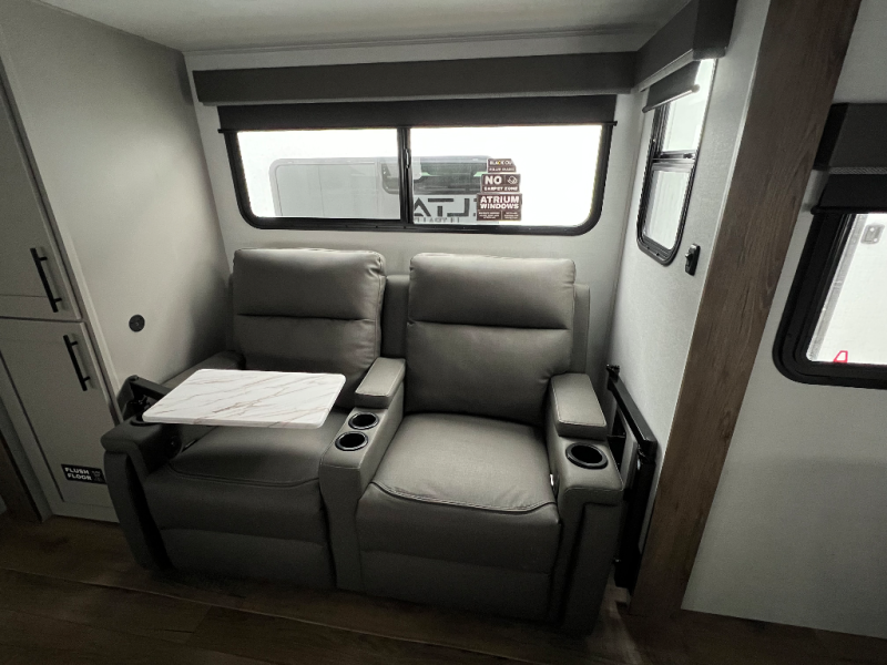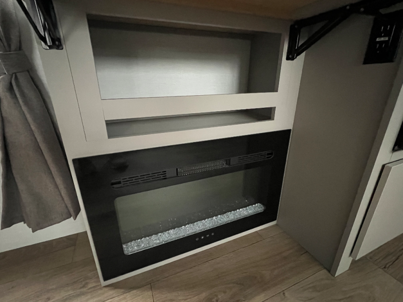 This couple's trailer is perfect for weekend trips to your favorite campground. The theater seat slide will provide comfort and space, while the fireplace across the room will have you feeling right at home. There are also two tables for the sofa and a flip-up extension by the fireplace for more counter space. All of your meals can be made on the three burner cooktop, and clean up will be a breeze with the large kitchen sink. A full bath is complete with a toilet, sink, 32" shower and a linen closet, and the front queen bed with a privacy curtain is sure to provide a great night's rest. You'll also find dual wardrobes and nightstands, along with overhead storage to keep everything organized!