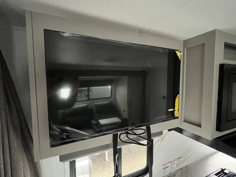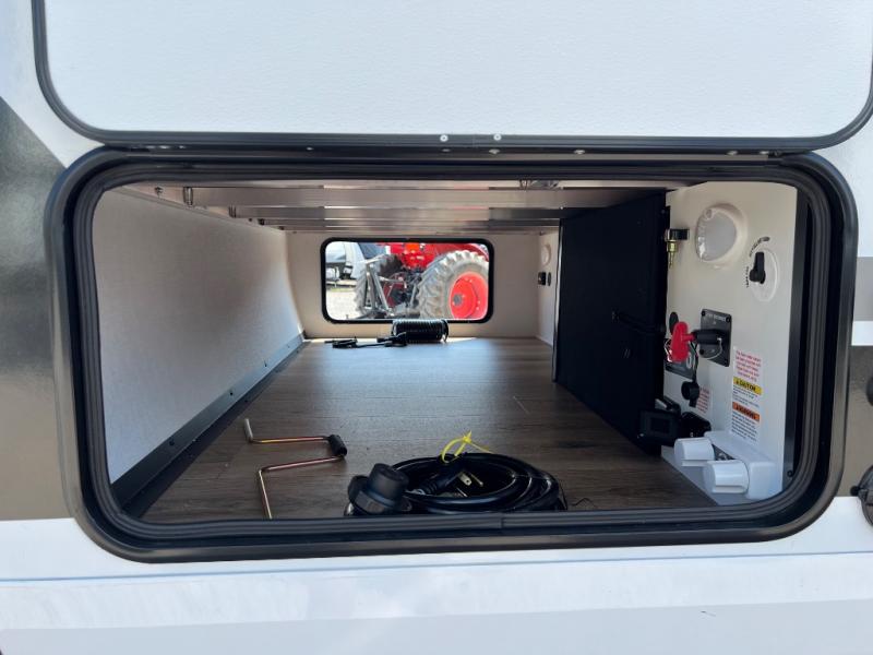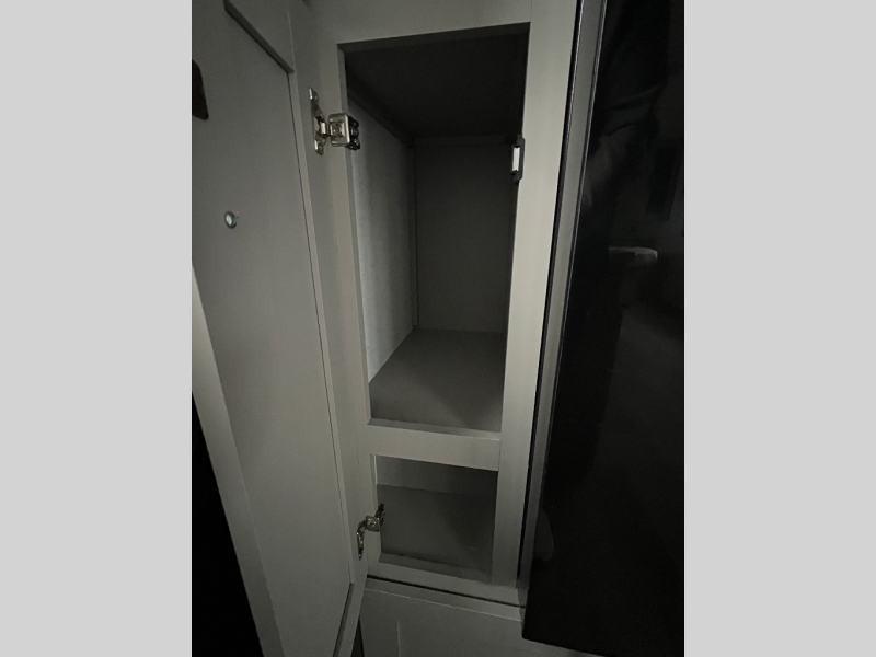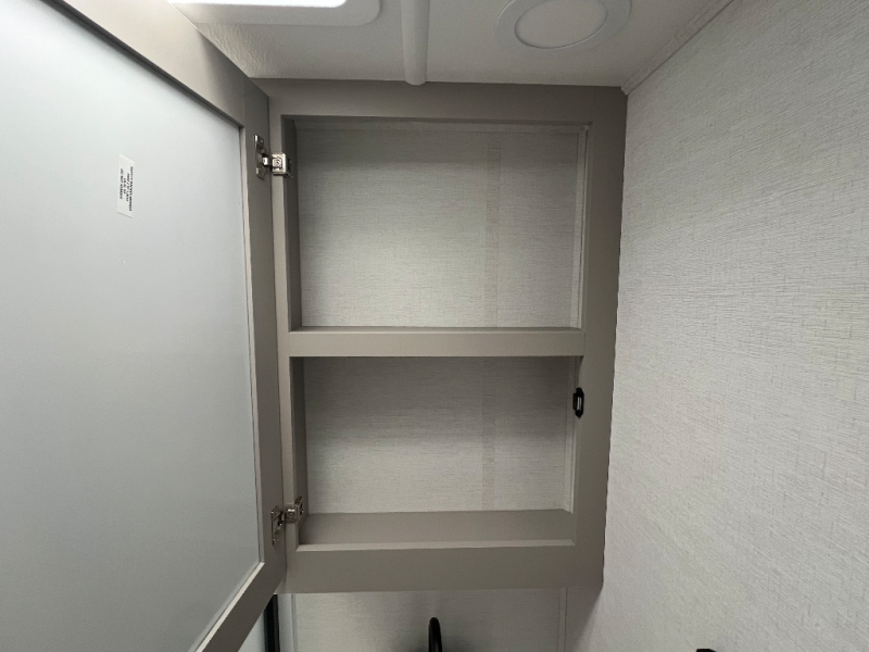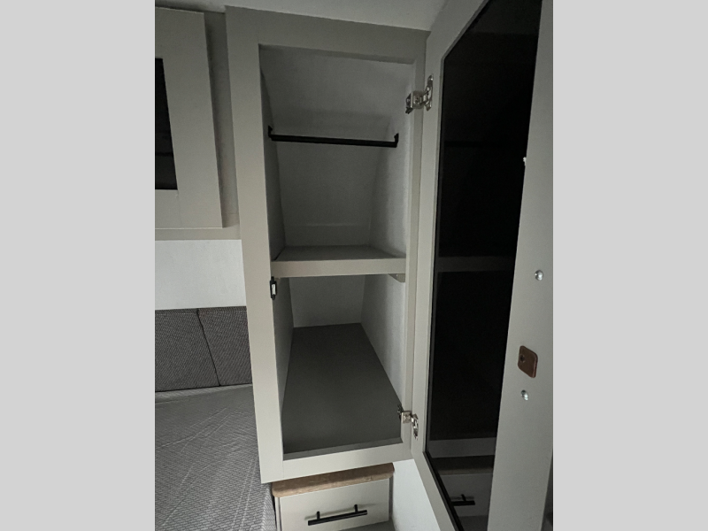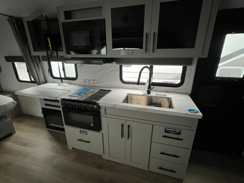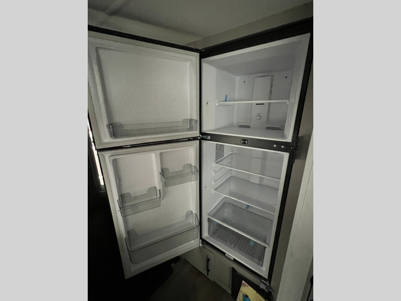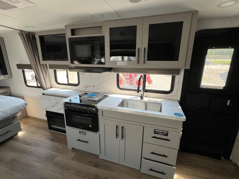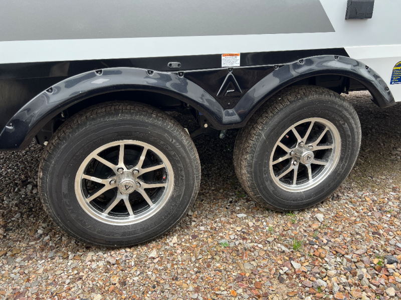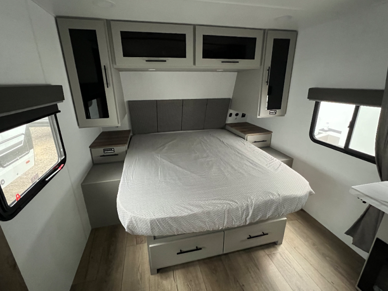 This couple's trailer is perfect for weekend trips to your favorite campground. The theater seat slide will provide comfort and space, while the fireplace across the room will have you feeling right at home. There are also two tables for the sofa and a flip-up extension by the fireplace for more counter space. All of your meals can be made on the three burner cooktop, and clean up will be a breeze with the large kitchen sink. A full bath is complete with a toilet, sink, 32" shower and a linen closet, and the front queen bed with a privacy curtain is sure to provide a great night's rest. You'll also find dual wardrobes and nightstands, along with overhead storage to keep everything organized!