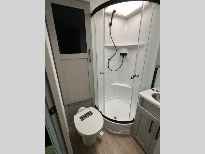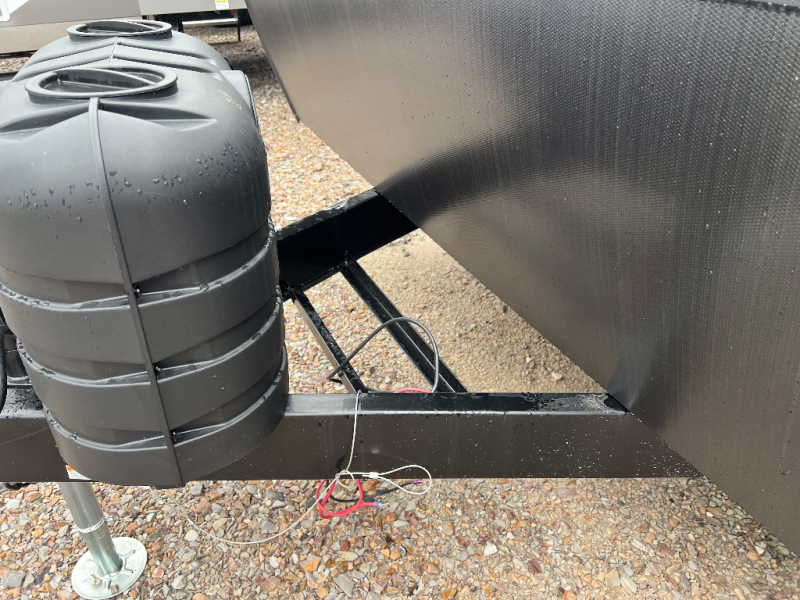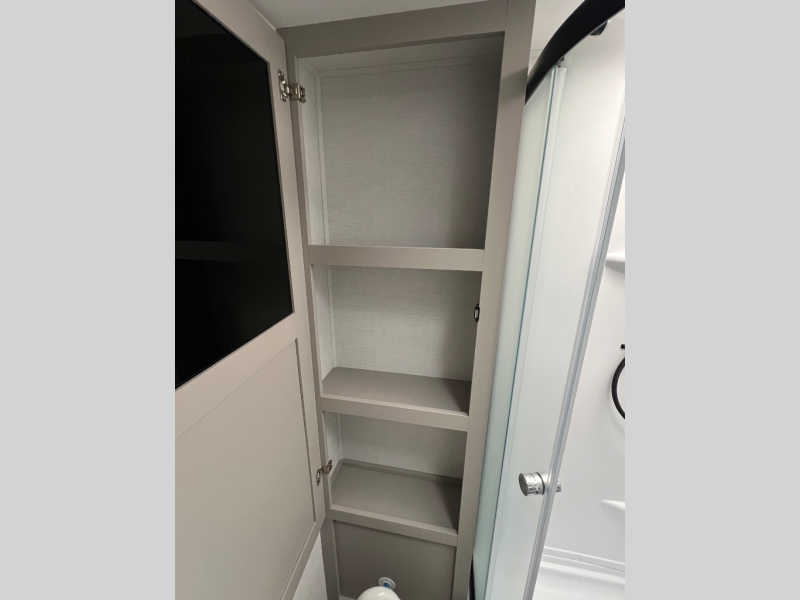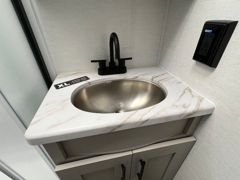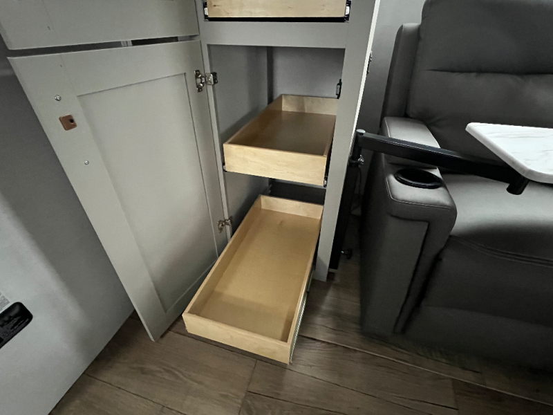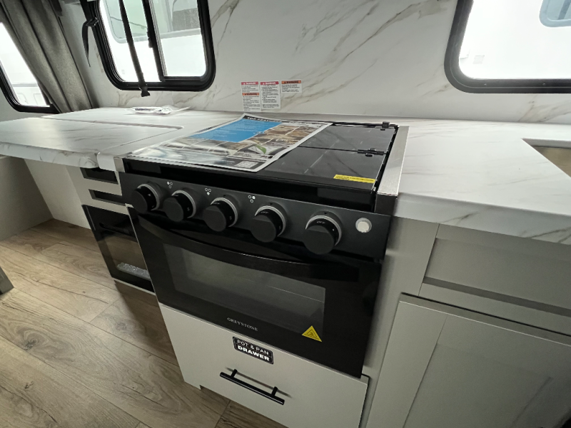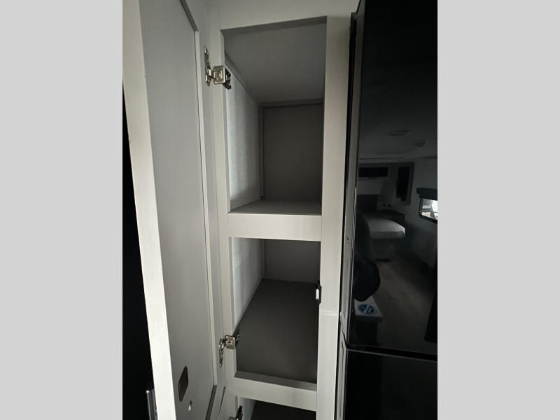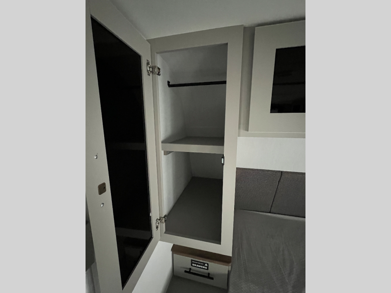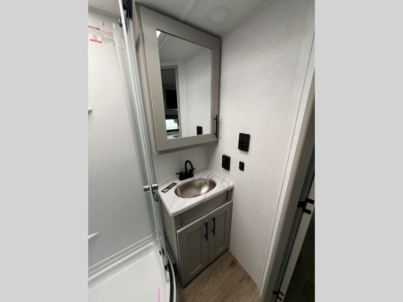 This couple's trailer is perfect for weekend trips to your favorite campground. The theater seat slide will provide comfort and space, while the fireplace across the room will have you feeling right at home. There are also two tables for the sofa and a flip-up extension by the fireplace for more counter space. All of your meals can be made on the three burner cooktop, and clean up will be a breeze with the large kitchen sink. A full bath is complete with a toilet, sink, 32" shower and a linen closet, and the front queen bed with a privacy curtain is sure to provide a great night's rest. You'll also find dual wardrobes and nightstands, along with overhead storage to keep everything organized!