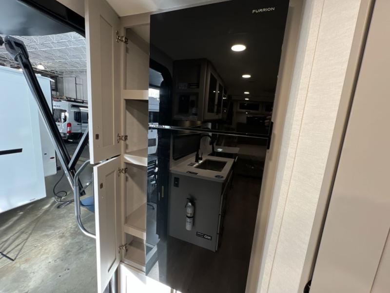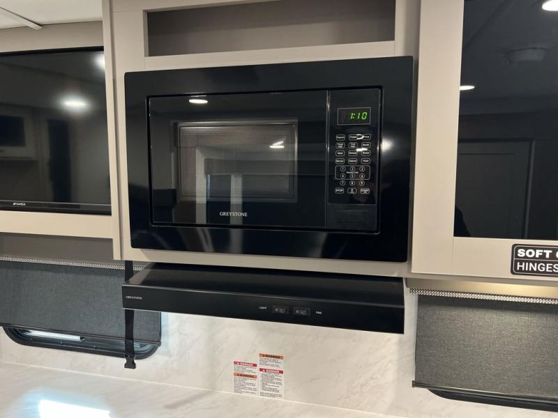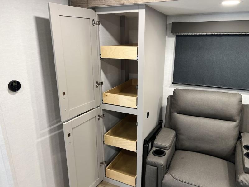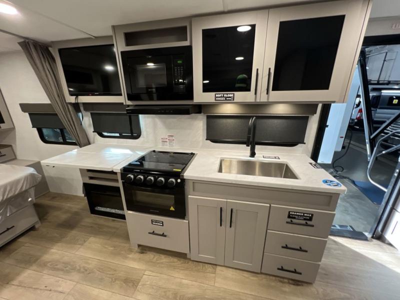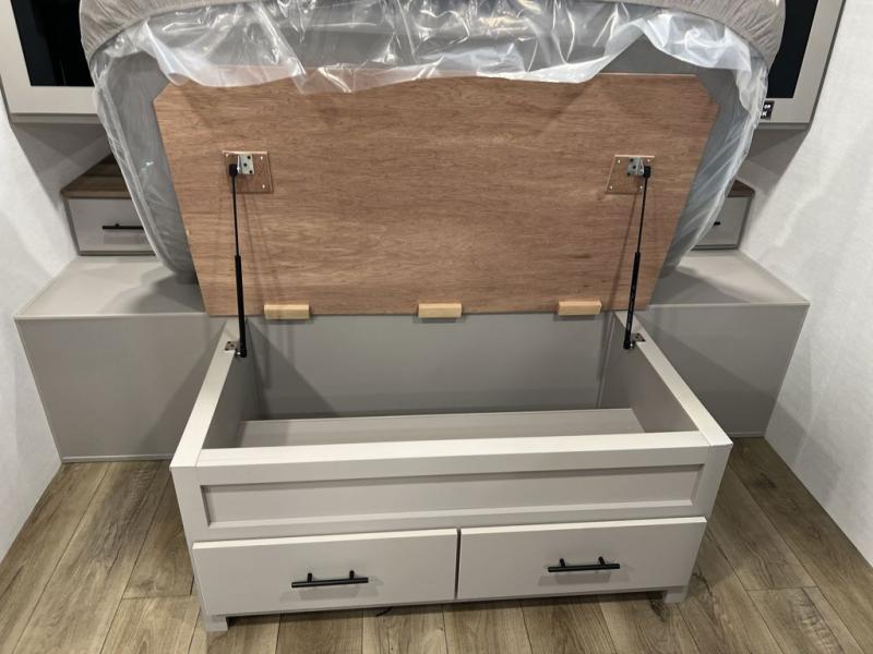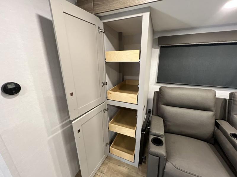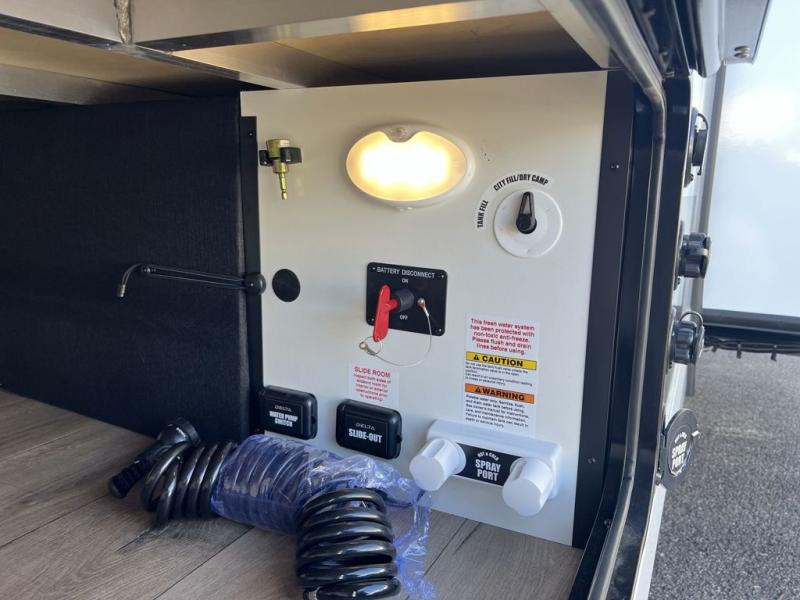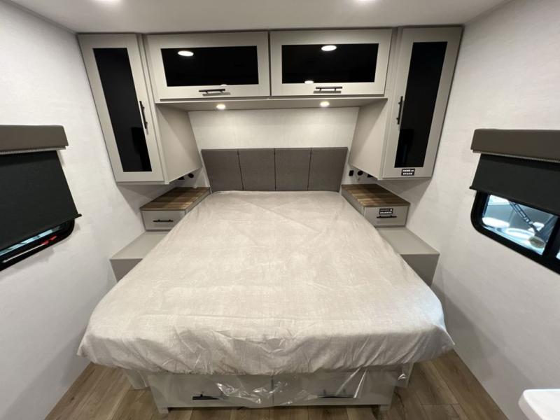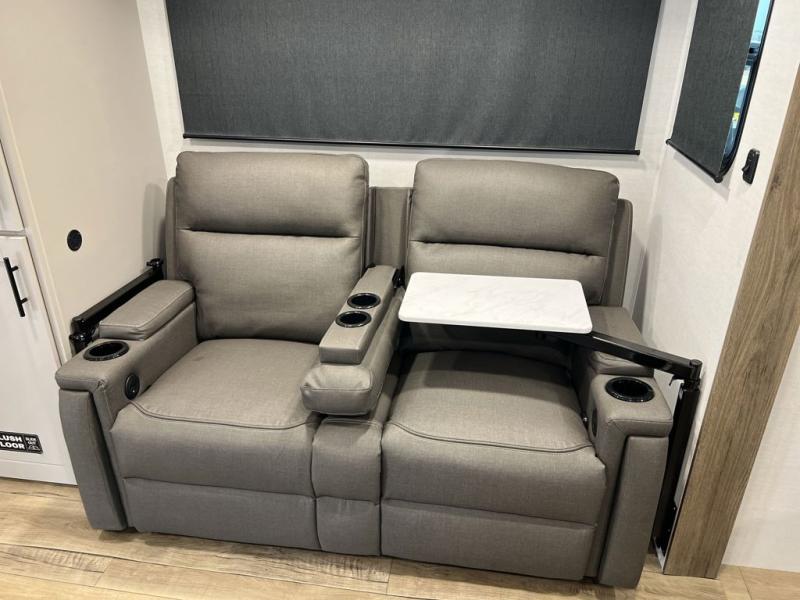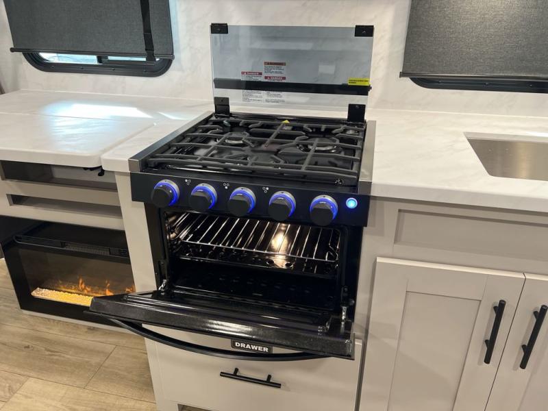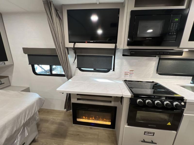 This couple's trailer is perfect for weekend trips to your favorite campground. The theater seat slide will provide comfort and space, while the fireplace across the room will have you feeling right at home. There are also two tables for the sofa and a flip-up extension by the fireplace for more counter space. All of your meals can be made on the three burner cooktop, and clean up will be a breeze with the large kitchen sink. A full bath is complete with a toilet, sink, 32" shower and a linen closet, and the front queen bed with a privacy curtain is sure to provide a great night's rest. You'll also find dual wardrobes and nightstands, along with overhead storage to keep everything organized!
