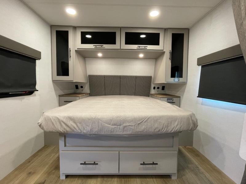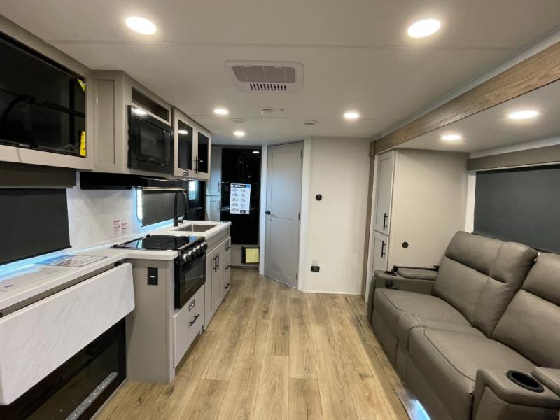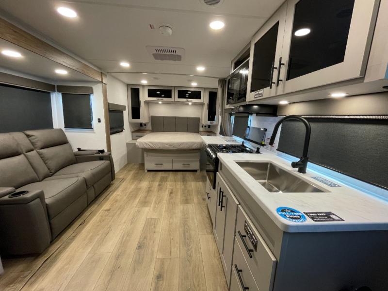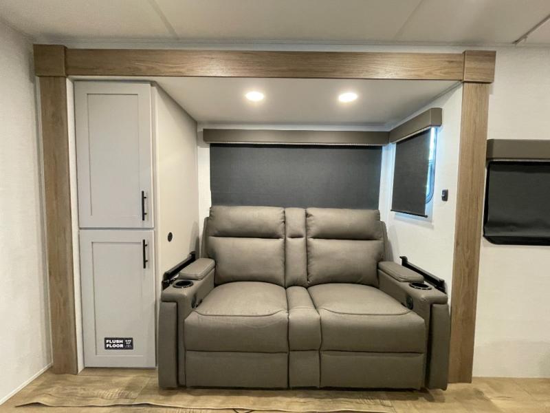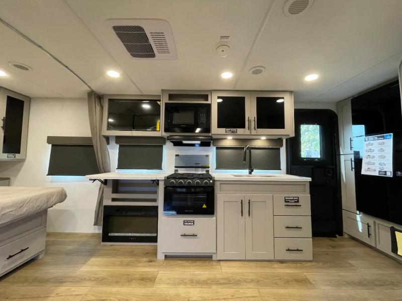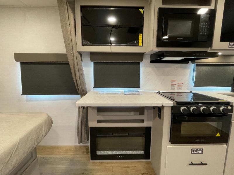 This couple's trailer is perfect for weekend trips to your favorite campground. The theater seat slide will provide comfort and space, while the fireplace across the room will have you feeling right at home. There are also two tables for the sofa and a flip-up extension by the fireplace for more counter space. All of your meals can be made on the three burner cooktop, and clean up will be a breeze with the large kitchen sink. A full bath is complete with a toilet, sink, 32" shower and a linen closet, and the front queen bed with a privacy curtain is sure to provide a great night's rest. You'll also find dual wardrobes and nightstands, along with overhead storage to keep everything organized!