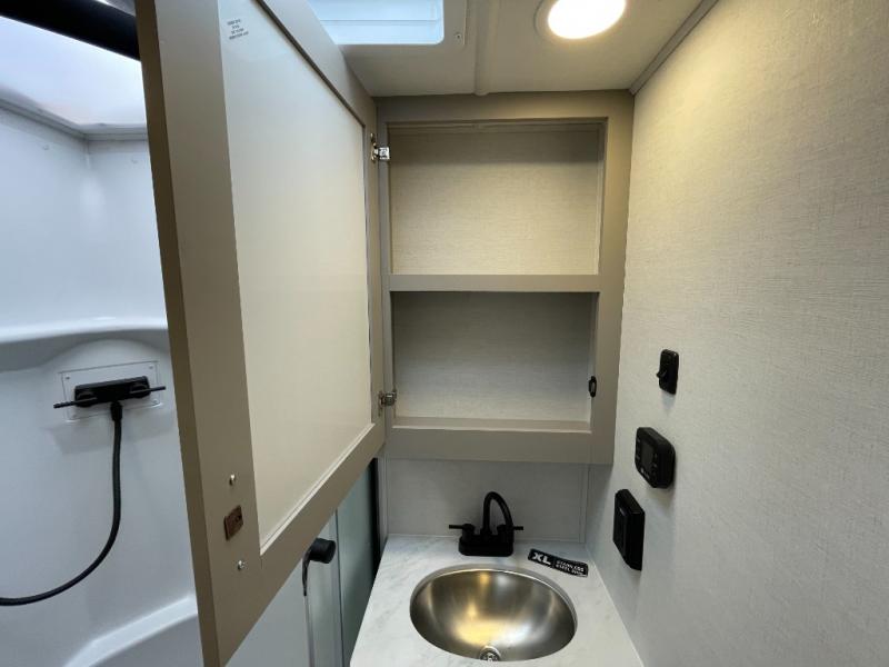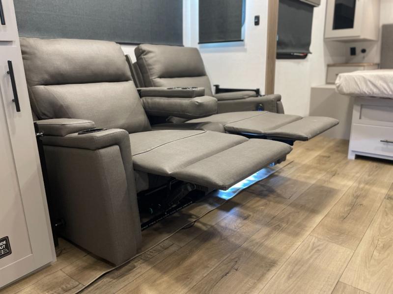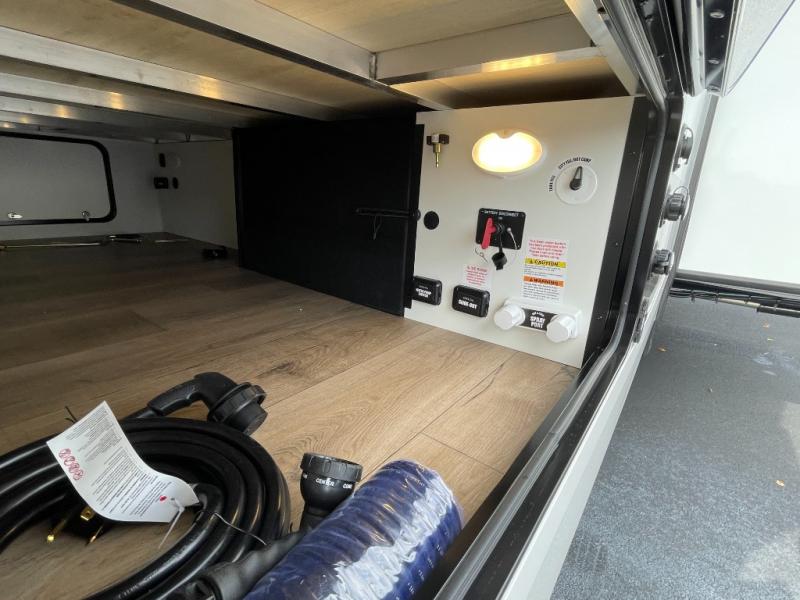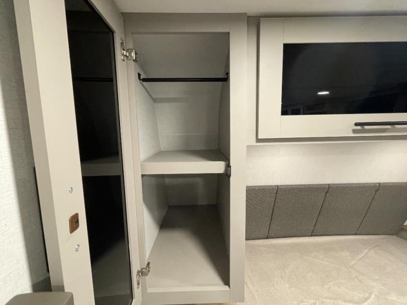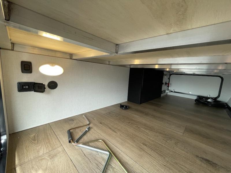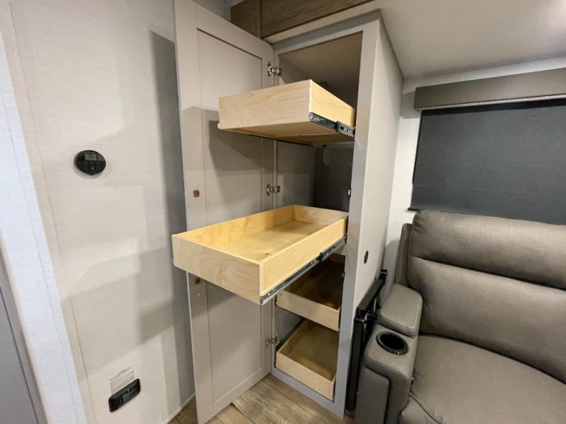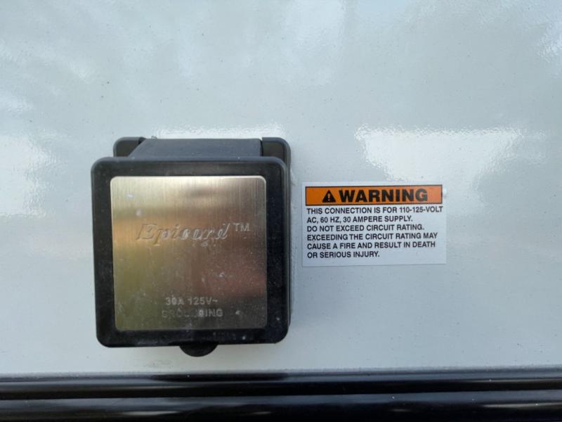 This couple's trailer is perfect for weekend trips to your favorite campground. The theater seat slide will provide comfort and space, while the fireplace across the room will have you feeling right at home. There are also two tables for the sofa and a flip-up extension by the fireplace for more counter space. All of your meals can be made on the three burner cooktop, and clean up will be a breeze with the large kitchen sink. A full bath is complete with a toilet, sink, 32" shower and a linen closet, and the front queen bed with a privacy curtain is sure to provide a great night's rest. You'll also find dual wardrobes and nightstands, along with overhead storage to keep everything organized!