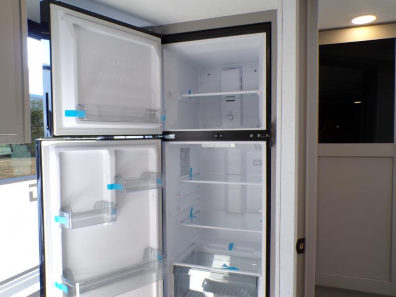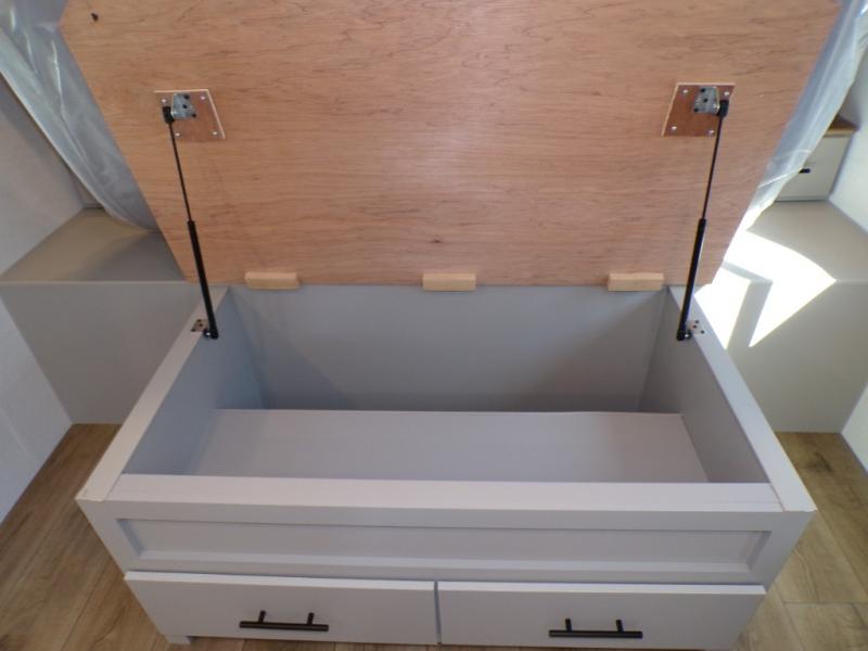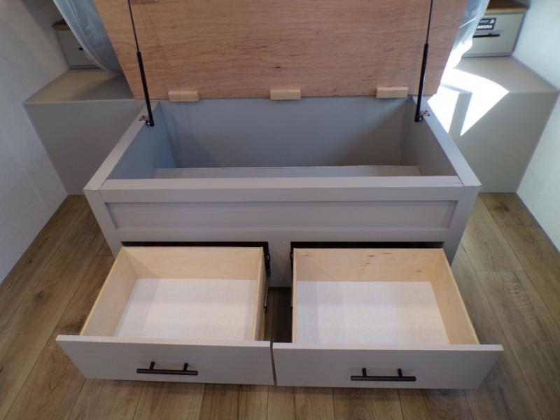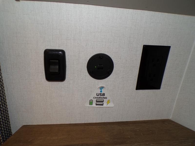 This couple's trailer is perfect for weekend trips to your favorite campground. The theater seat slide will provide comfort and space, while the fireplace across the room will have you feeling right at home. There are also two tables for the sofa and a flip-up extension by the fireplace for more counter space. All of your meals can be made on the three burner cooktop, and clean up will be a breeze with the large kitchen sink. A full bath is complete with a toilet, sink, 32" shower and a linen closet, and the front queen bed with a privacy curtain is sure to provide a great night's rest. You'll also find dual wardrobes and nightstands, along with overhead storage to keep everything organized!